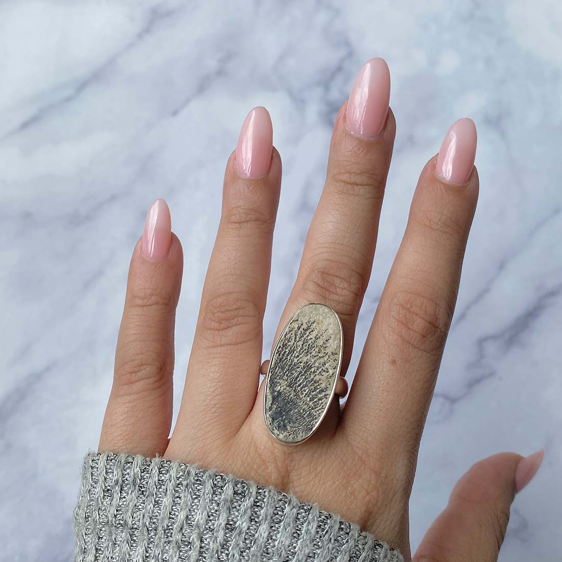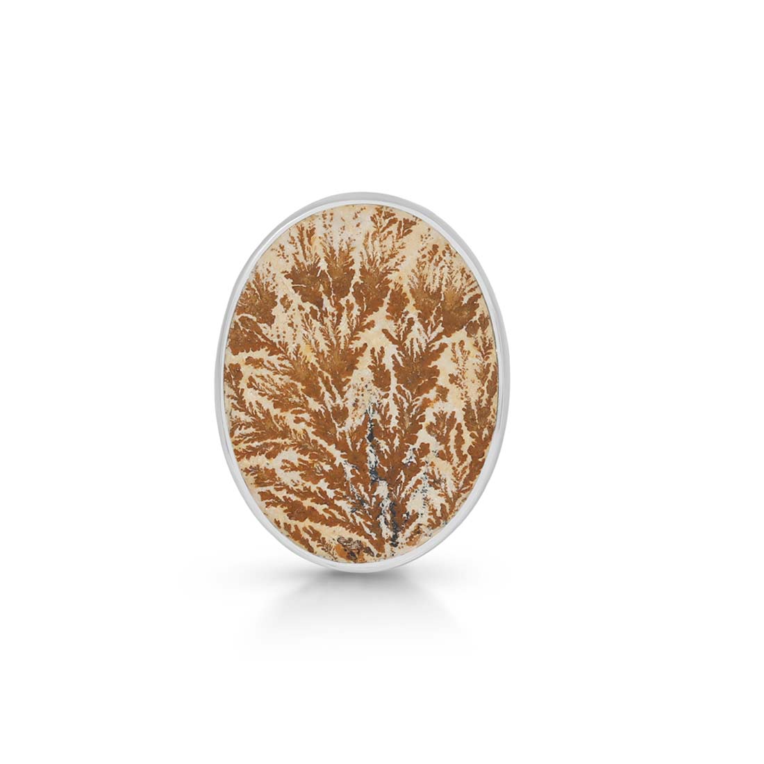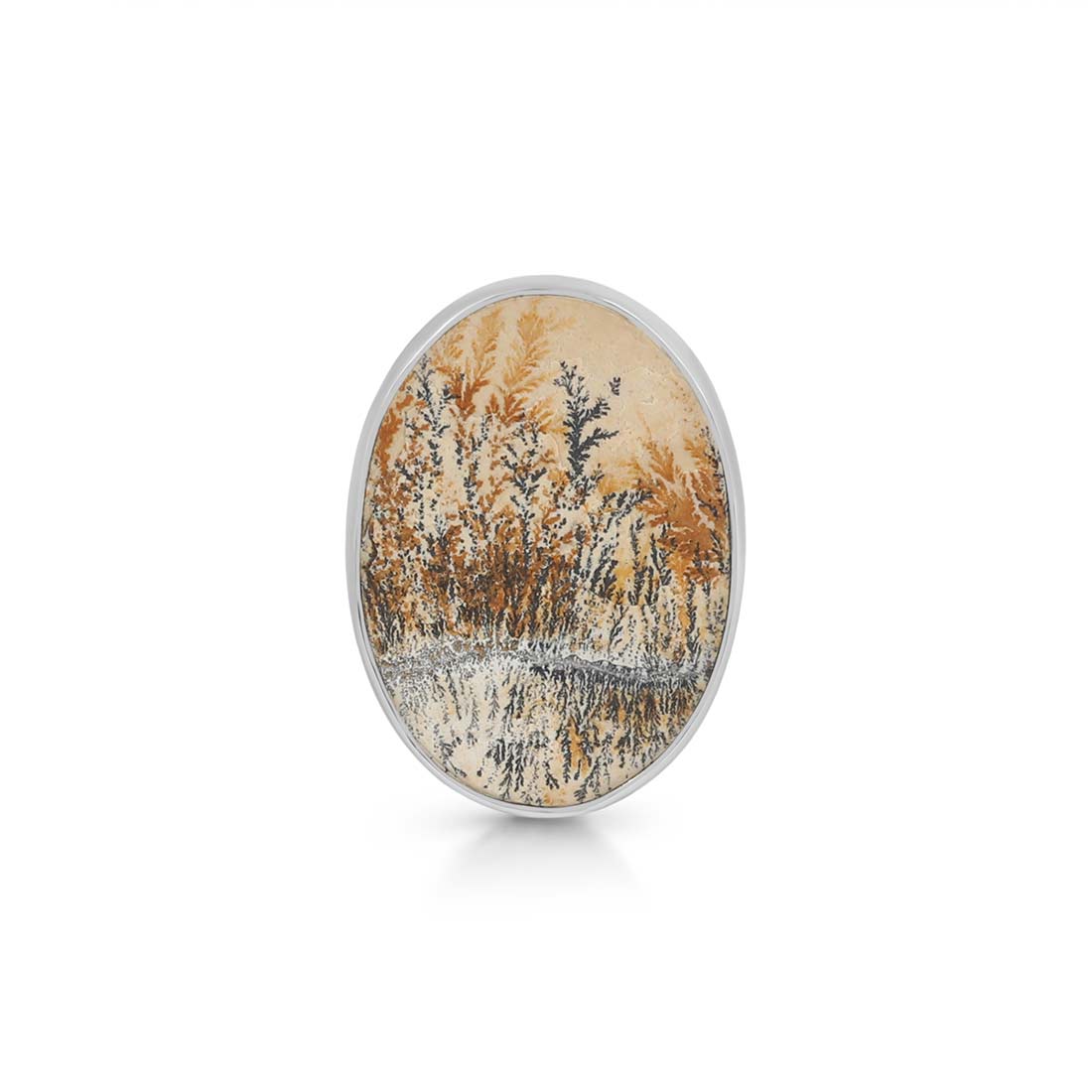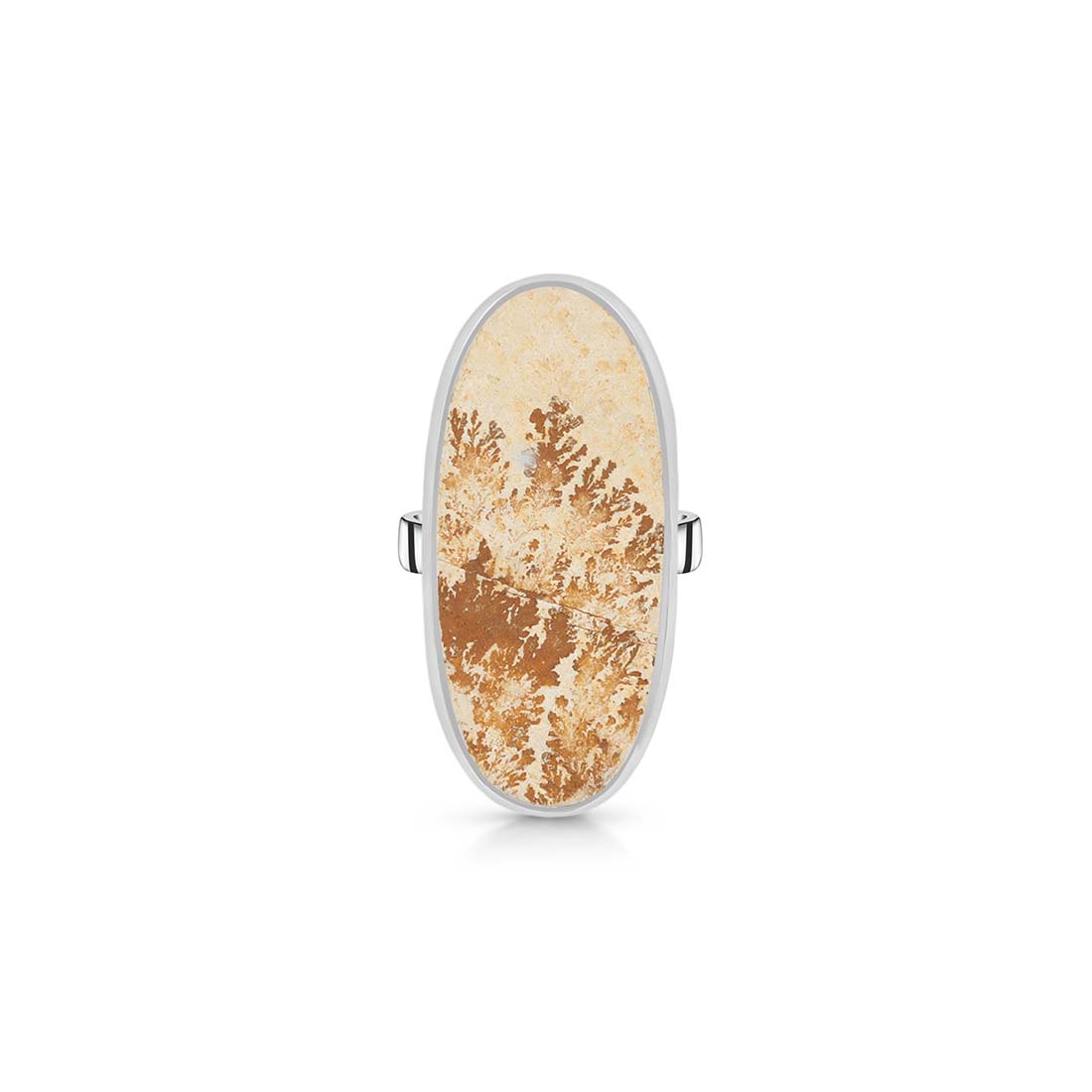 Well, Dendritic stone is a variety of chalcedony that comprises trace elements like iron oxides and manganese minerals during its formation, causing these tree-like patterns that can range from black and gray to brown. A rare example of Mother Nature's creativity, Psilomelane Dendrite ranks 5 to 6 on the Mohs scale, making it a relatively soft and delicate stone. It means you can flaunt your Psilomelane Dendrite rings on specific occasions to create a show-stealer appearance. Despite its softness, it is less likely to get broken as it has no cleavage.