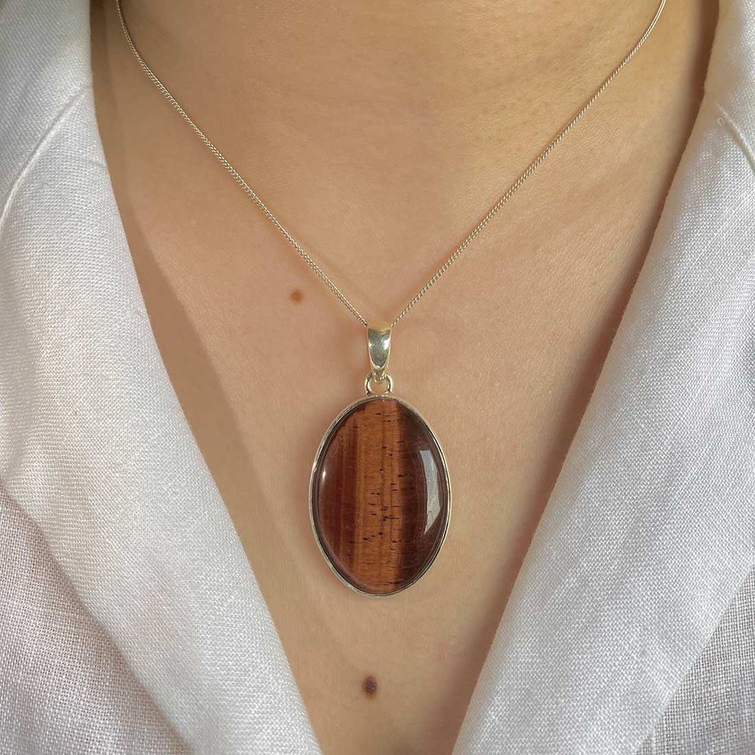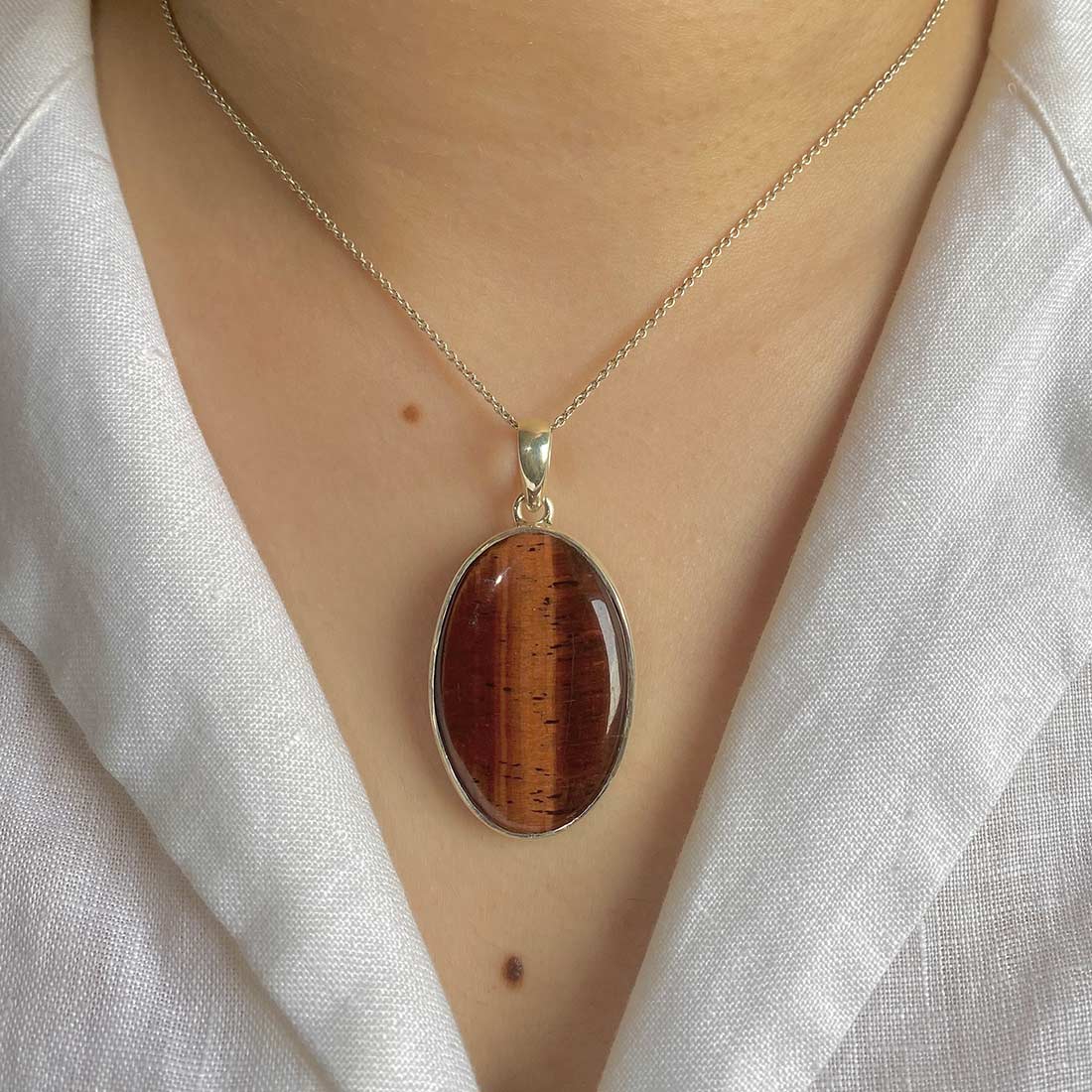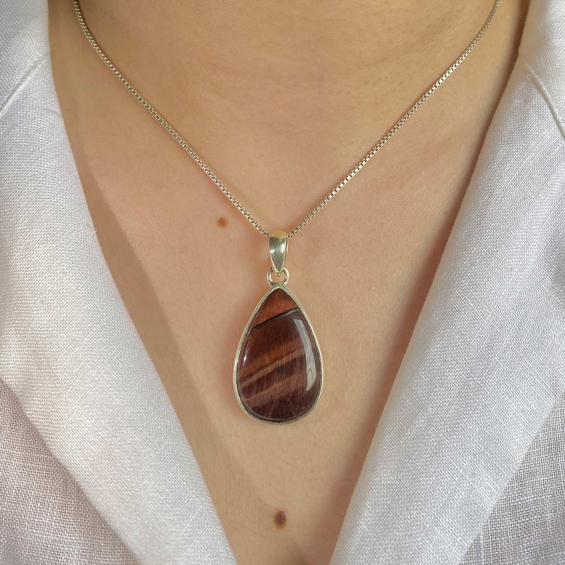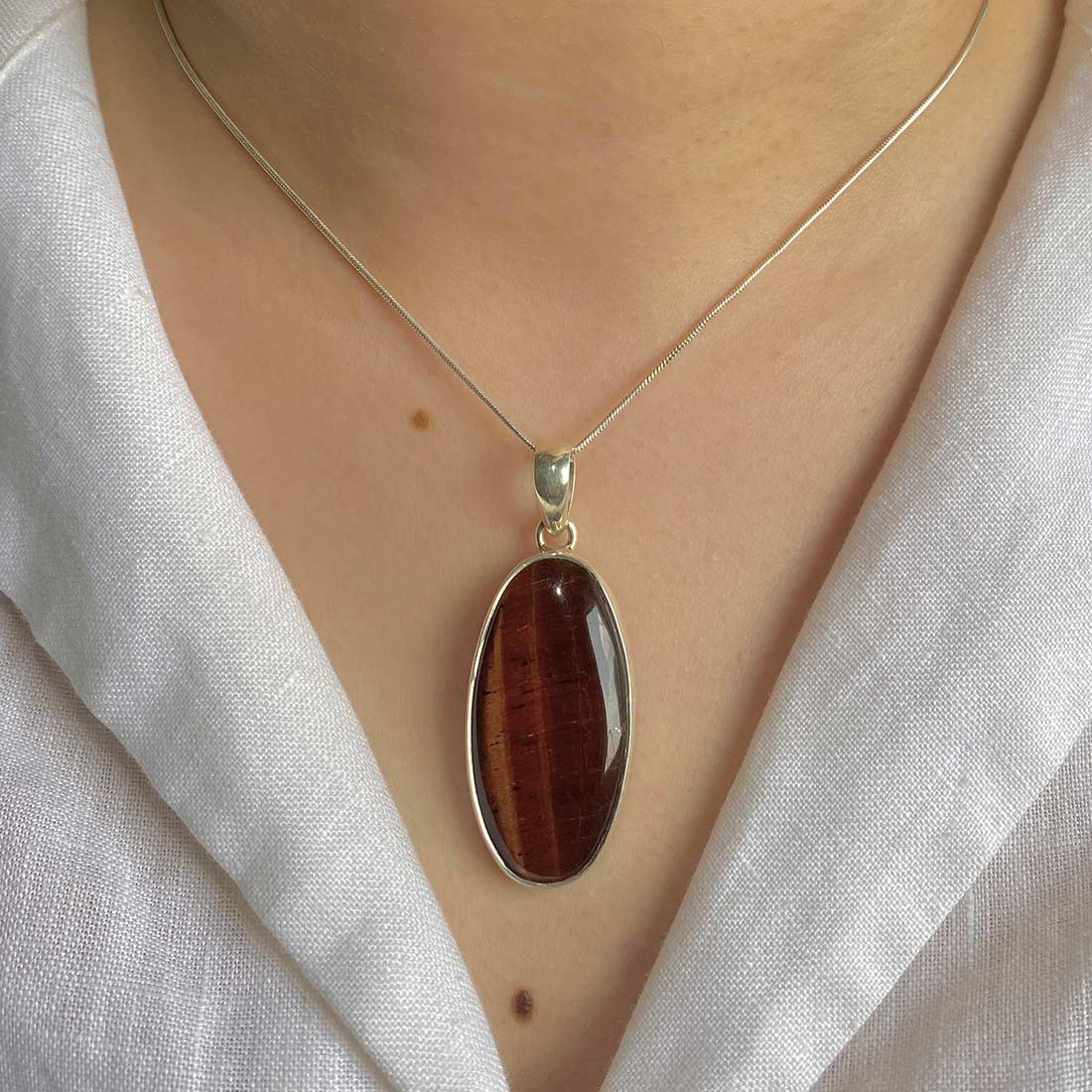 This iridescent crystal belongs to the Quartz family, and its red pigments come from the presence of iron oxides in silicon dioxide. Its vibrant hues and eye-catching parallel stripes of minerals give the stone a unique appearance and chatoyancy. Due to its Tiger-like resemblance, Red Tiger Eye pendants exude the animal’s strength, fearlessness, and courageous nature. Talking about its hardness, it ranks 7 on the Mohs scale, making accessories like Red Tiger Eye rings ideal for everyday wear. Today, it can be found in many parts of the world, including India, Tibet, South Africa, Namibia, Brazil, and the United States.