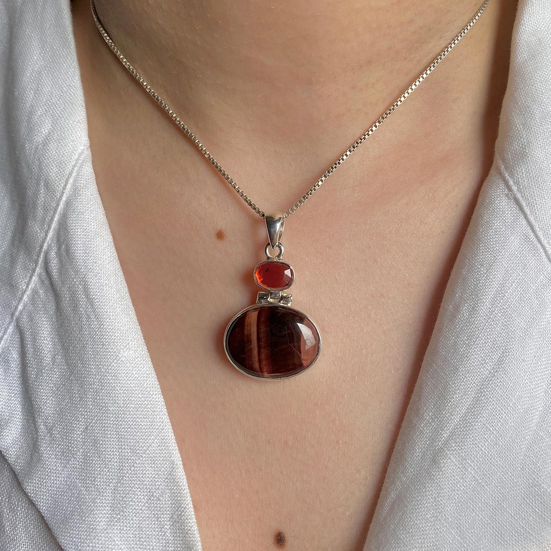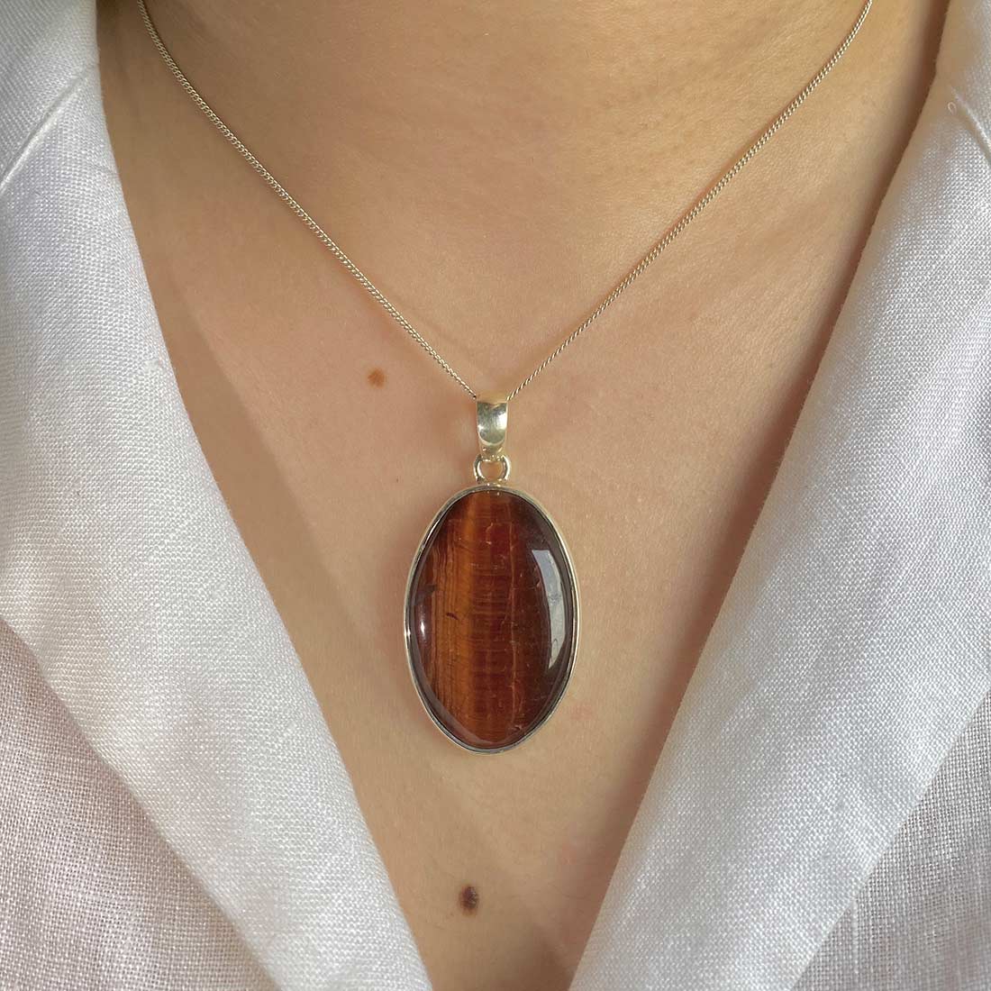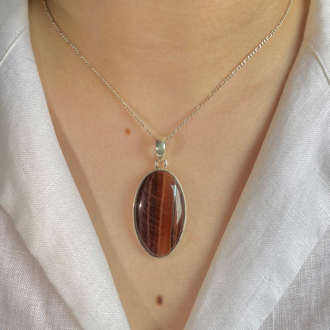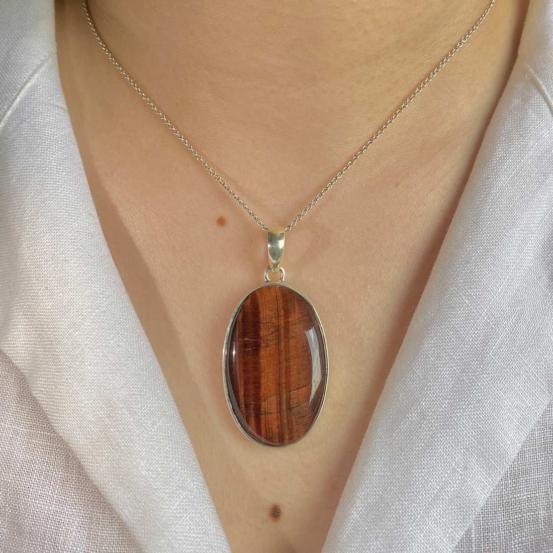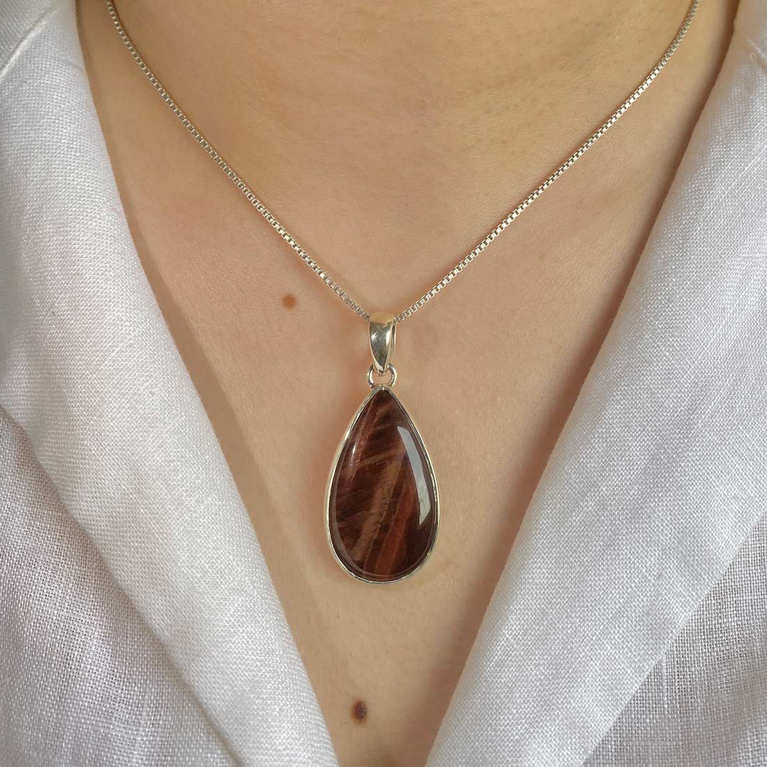 This iridescent crystal belongs to the Quartz family, and its red pigments come from the presence of iron oxides in silicon dioxide. Its vibrant hues and eye-catching parallel stripes of minerals give the stone a unique appearance and chatoyancy. Due to its Tiger-like resemblance, Red Tiger Eye pendants exude the animal’s strength, fearlessness, and courageous nature. Talking about its hardness, it ranks 7 on the Mohs scale, making accessories like Red Tiger Eye rings ideal for everyday wear. Today, it can be found in many parts of the world, including India, Tibet, South Africa, Namibia, Brazil, and the United States.