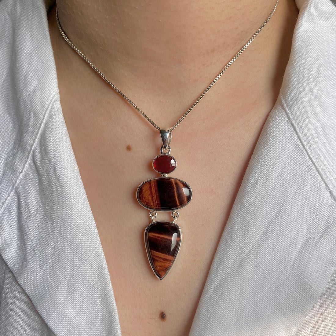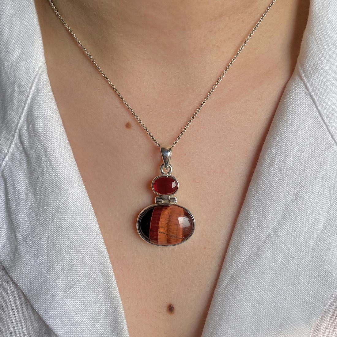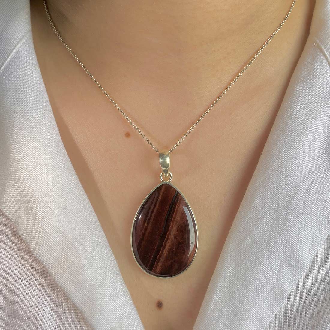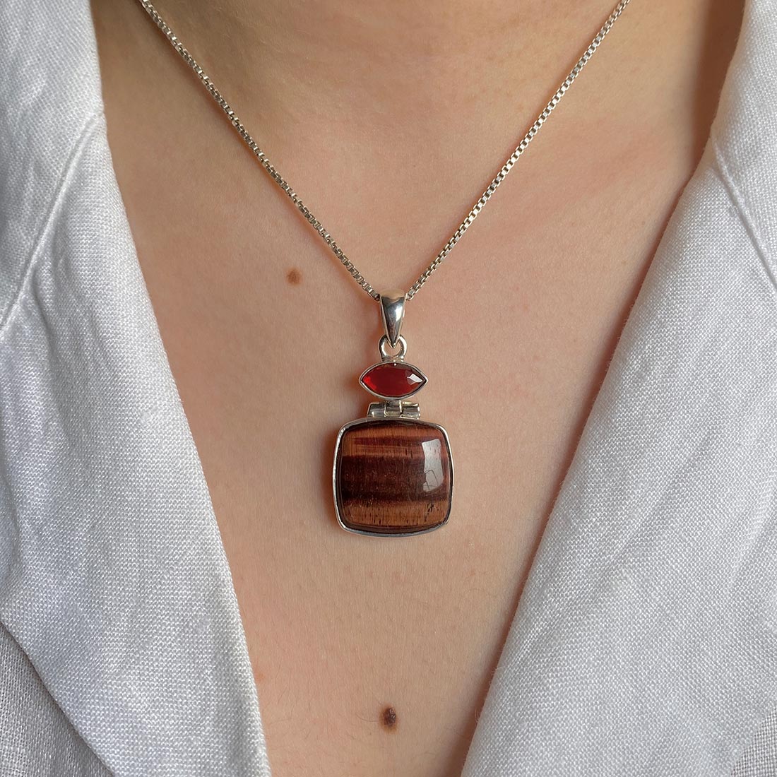 This iridescent crystal belongs to the Quartz family, and its red pigments come from the presence of iron oxides in silicon dioxide. Its vibrant hues and eye-catching parallel stripes of minerals give the stone a unique appearance and chatoyancy. Due to its Tiger-like resemblance, Red Tiger Eye pendants exude the animal’s strength, fearlessness, and courageous nature. Talking about its hardness, it ranks 7 on the Mohs scale, making accessories like Red Tiger Eye rings ideal for everyday wear. Today, it can be found in many parts of the world, including India, Tibet, South Africa, Namibia, Brazil, and the United States.