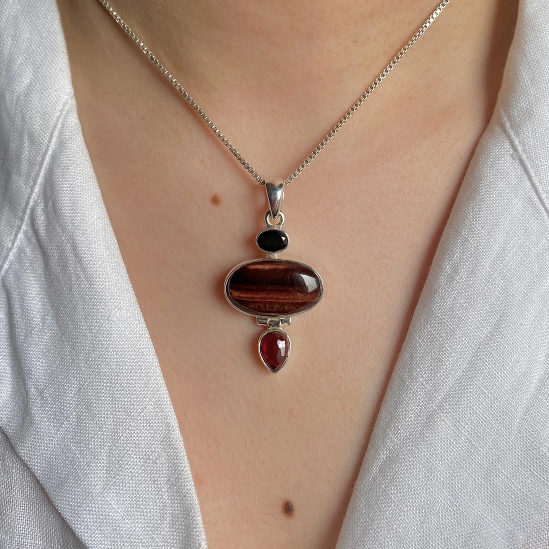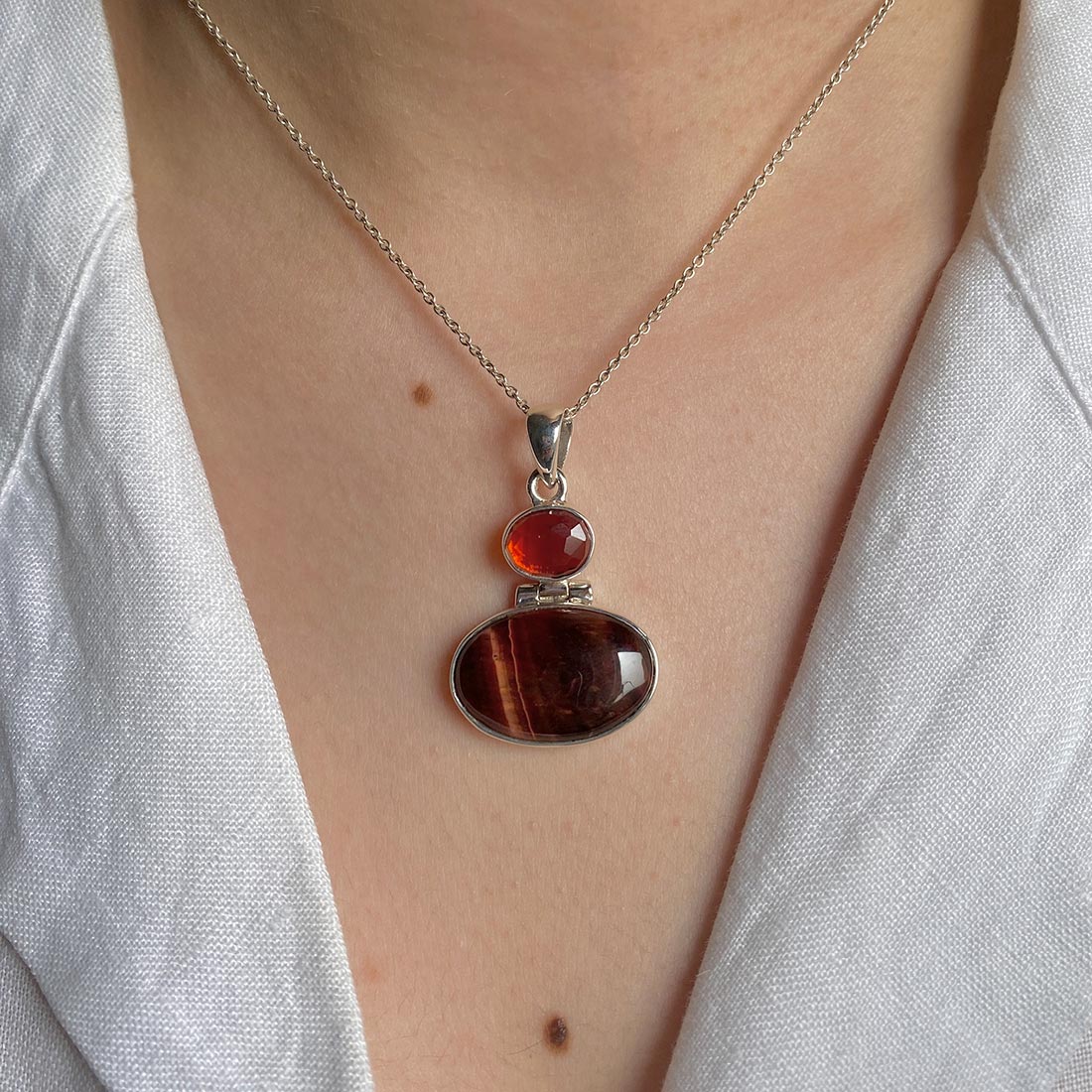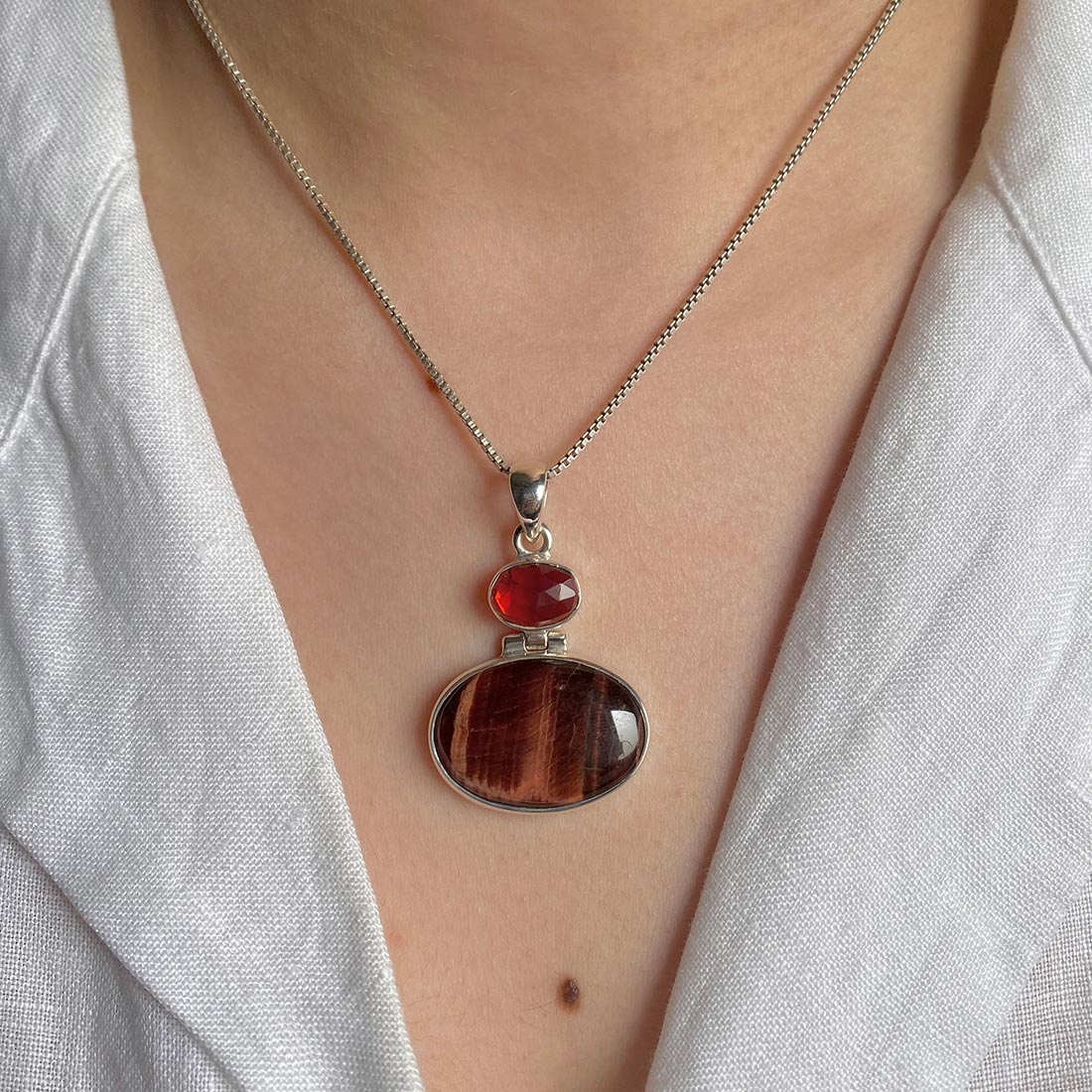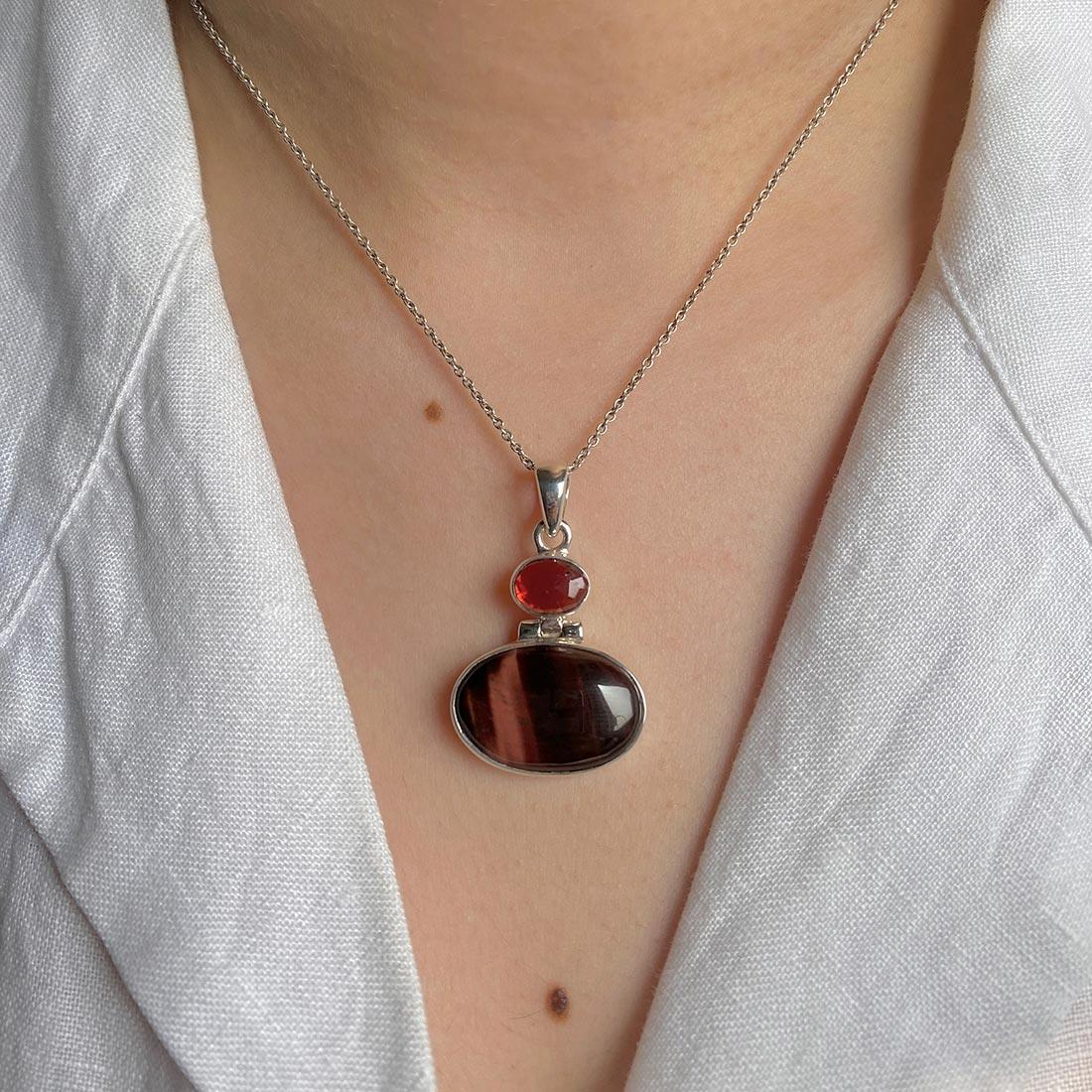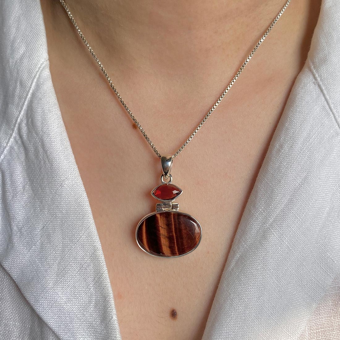 This iridescent crystal belongs to the Quartz family, and its red pigments come from the presence of iron oxides in silicon dioxide. Its vibrant hues and eye-catching parallel stripes of minerals give the stone a unique appearance and chatoyancy. Due to its Tiger-like resemblance, Red Tiger Eye pendants exude the animal’s strength, fearlessness, and courageous nature. Talking about its hardness, it ranks 7 on the Mohs scale, making accessories like Red Tiger Eye rings ideal for everyday wear. Today, it can be found in many parts of the world, including India, Tibet, South Africa, Namibia, Brazil, and the United States.