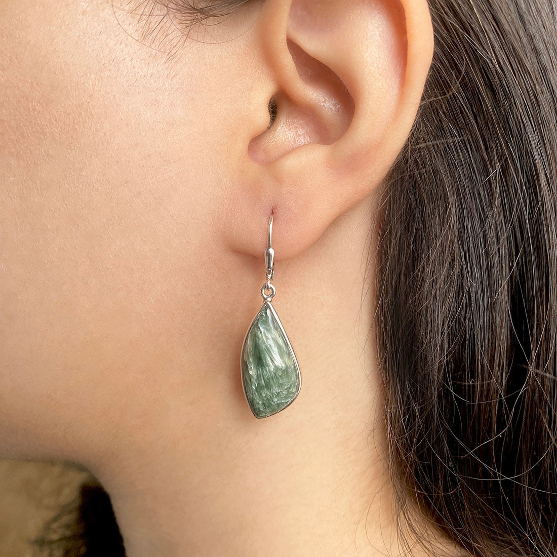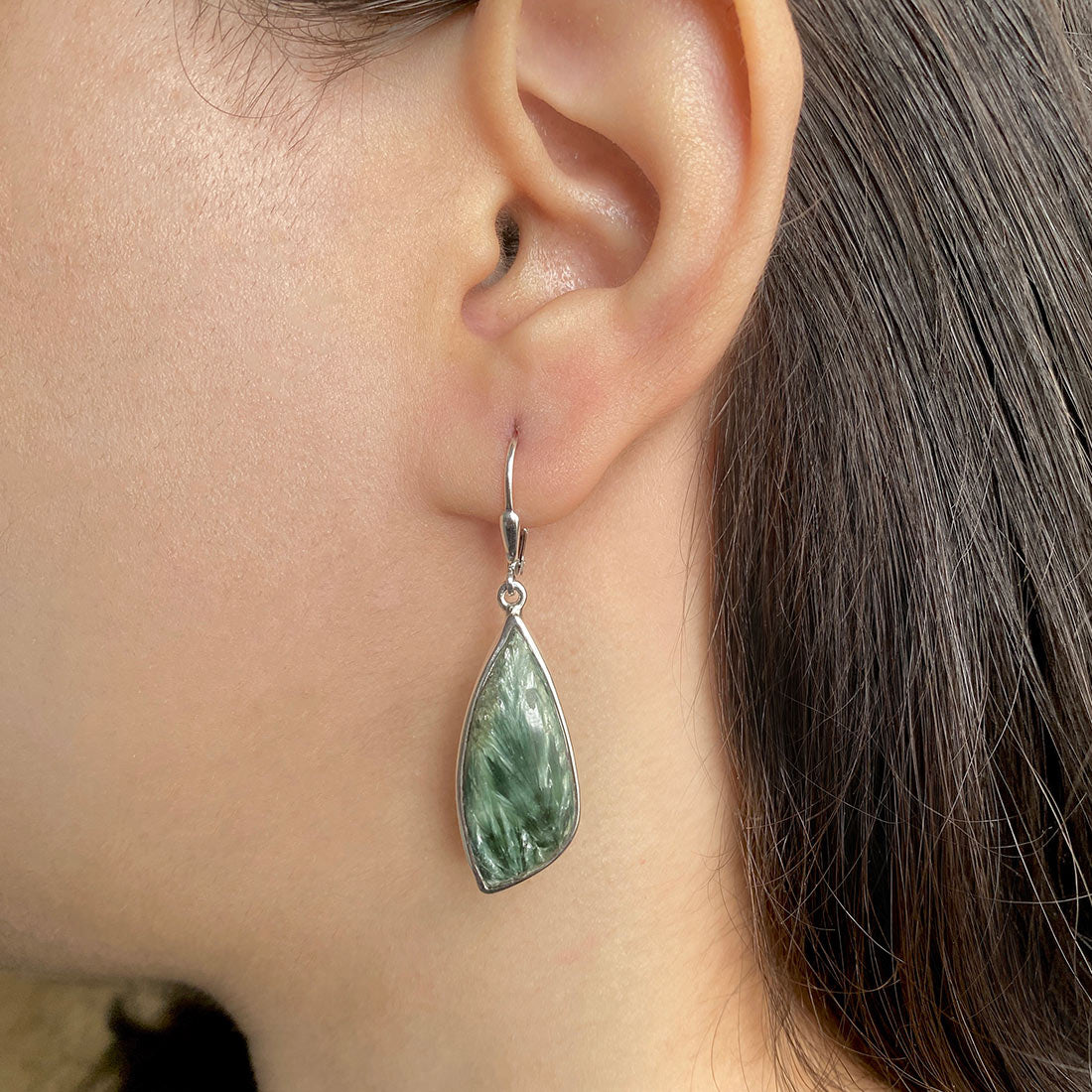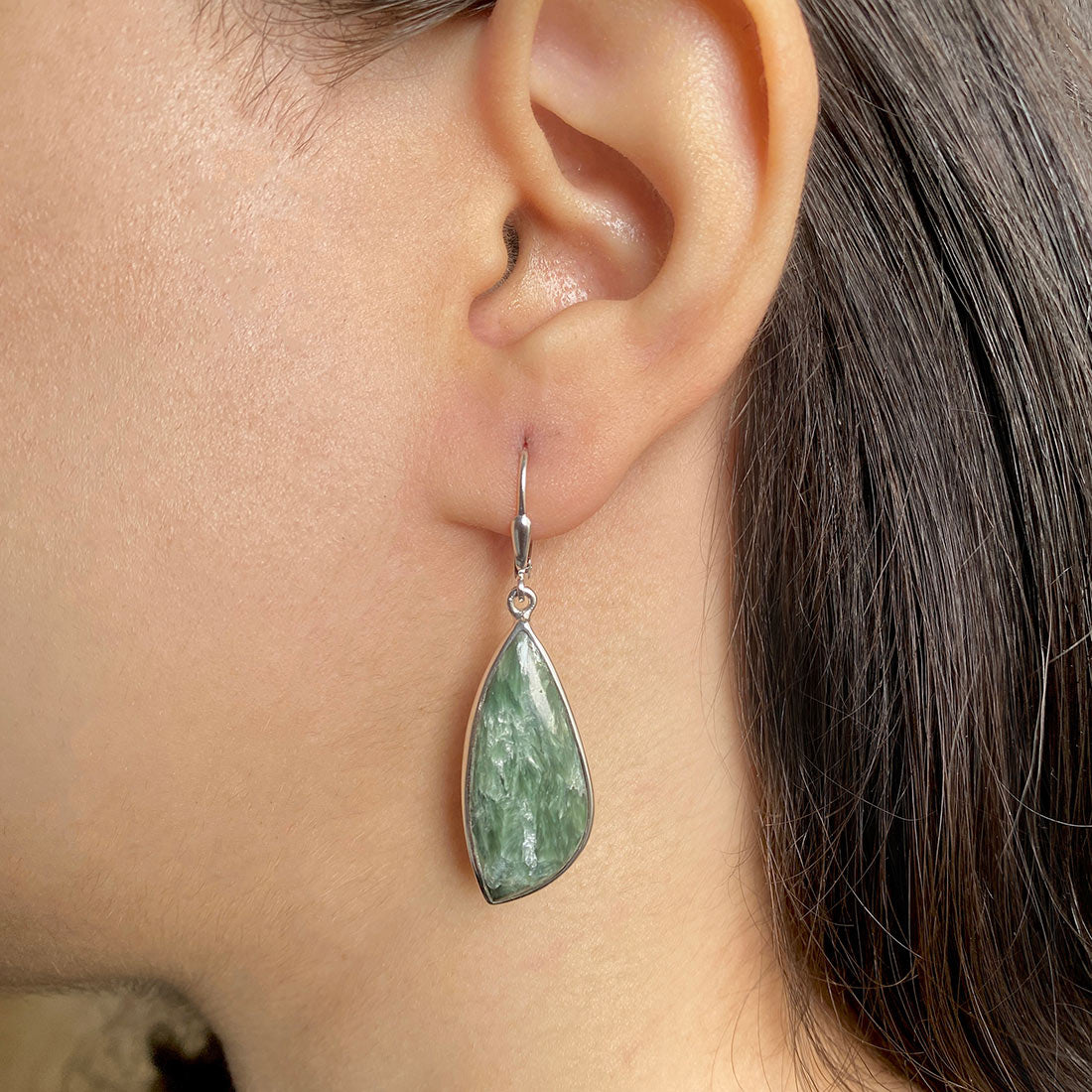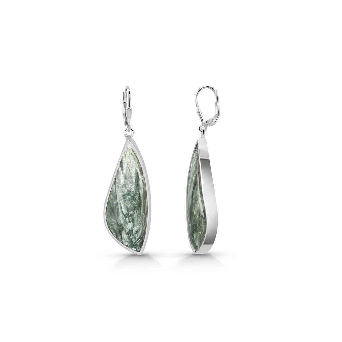 Seraphinite is a gorgeous semi-precious gemstone that creates the most sumptuous statement Seraphinite earrings that you can add to your wardrobe to exude class and grace. It comes with deep forest green to gray shades with silvery, feather-like patterns, making the stone a hot topic among connoisseurs and gem collectors. When crafted with pure 925 sterling silver, gold, or platinum, the beauty of Seraphinite earrings goes to the next level, spellbinding everyone. No wonder the stone's popularity is increasing daily among fashionistas, celebrities and Jewelry influencers seeking something unconventional and offbeat to add to their Jewelry box.