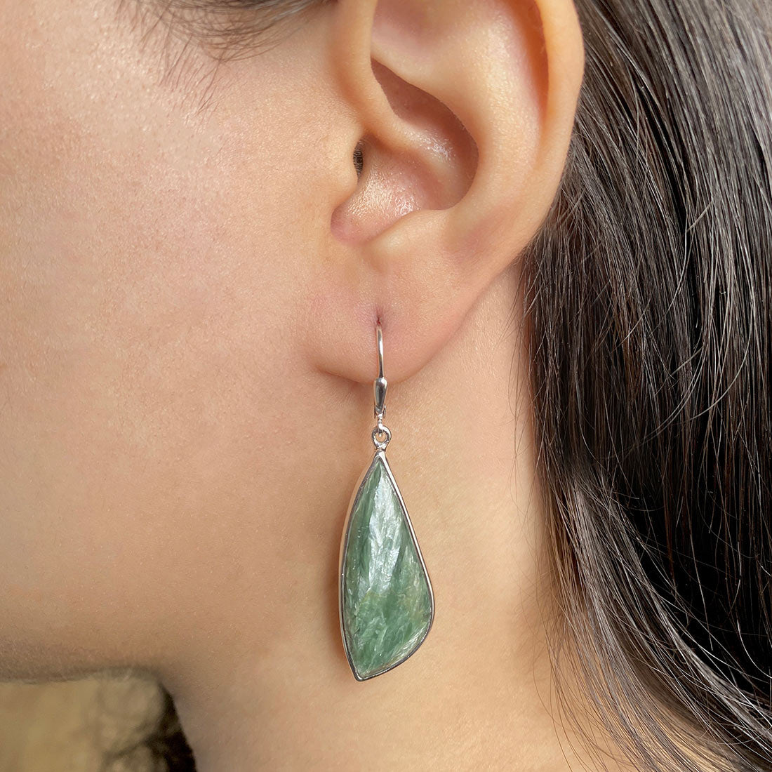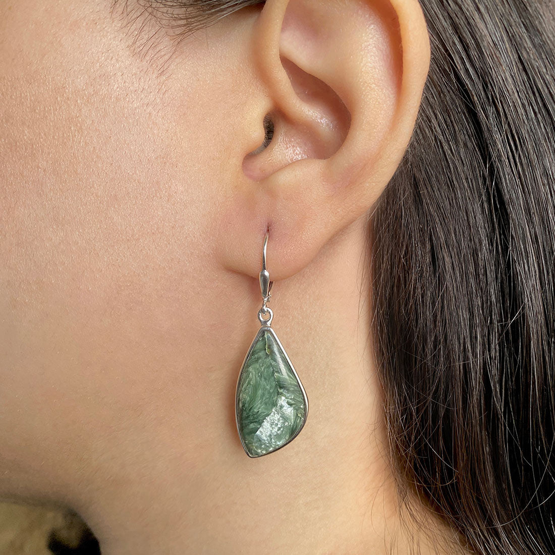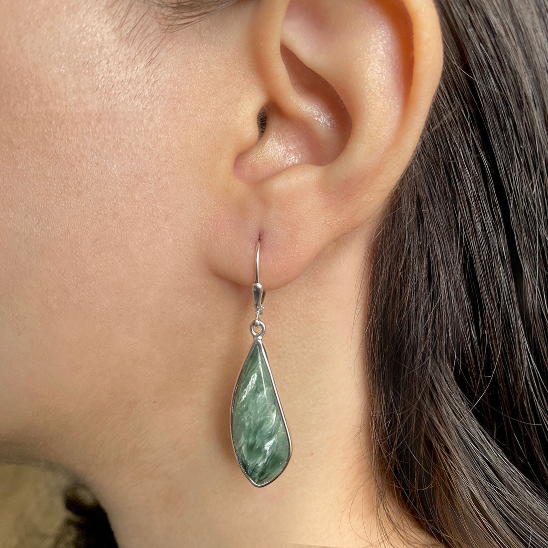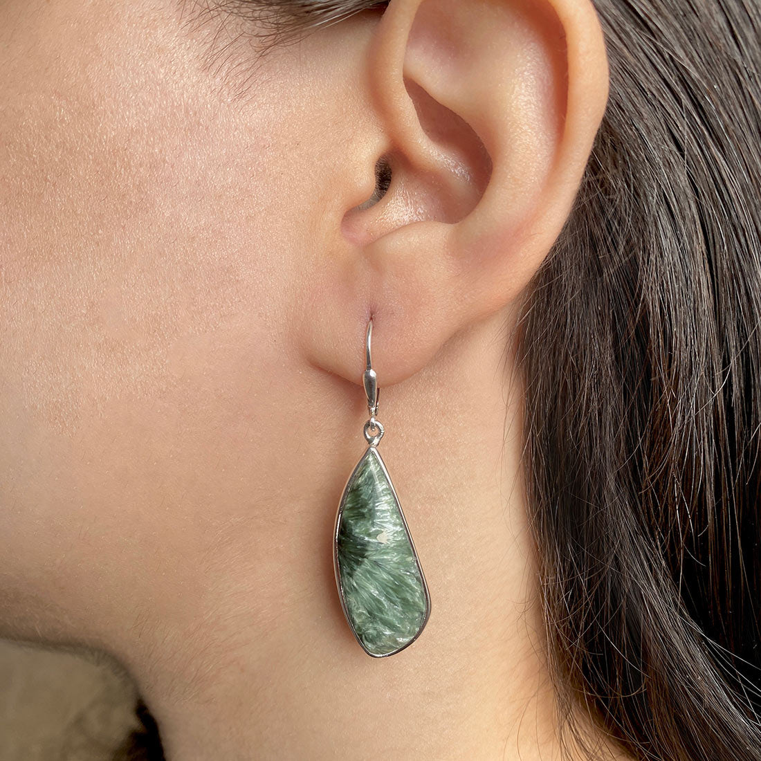 Seraphinite is a gorgeous semi-precious gemstone that creates the most sumptuous statement Seraphinite earrings that you can add to your wardrobe to exude class and grace. It comes with deep forest green to gray shades with silvery, feather-like patterns, making the stone a hot topic among connoisseurs and gem collectors. When crafted with pure 925 sterling silver, gold, or platinum, the beauty of Seraphinite earrings goes to the next level, spellbinding everyone. No wonder the stone's popularity is increasing daily among fashionistas, celebrities and Jewelry influencers seeking something unconventional and offbeat to add to their Jewelry box.