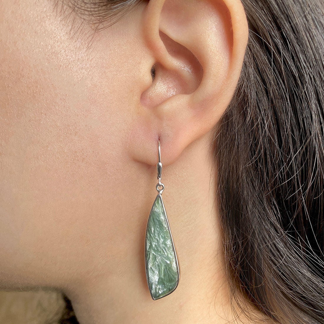 Now, let's move our Seraphinite ride toward its geological and chemical symphony, where we came to learn that it is a specific type of clinochlore, a typically rare stone that is only mined in eastern Siberia, Russia, near Lake Baikal. Also known as Serafina or Green Chlorite, it forms in metamorphic rocks when hot, mineral-rich fluids are exposed to high temperatures and pressures. The chemical formula is Mg, Fe2+, 5Al(Si3Al)O10(OH)8. With a hardness of 2 to 2.5, the stone makes soft and delicate Seraphinite earrings that you can flaunt on special occasions. They are usually green in color, ranging from light to dark green, defined by distinctive silver or gold feathers on the stone; you can also cherish them in other colors like red, yellow, gold, or black, which are rare.