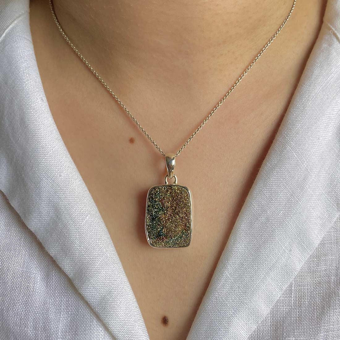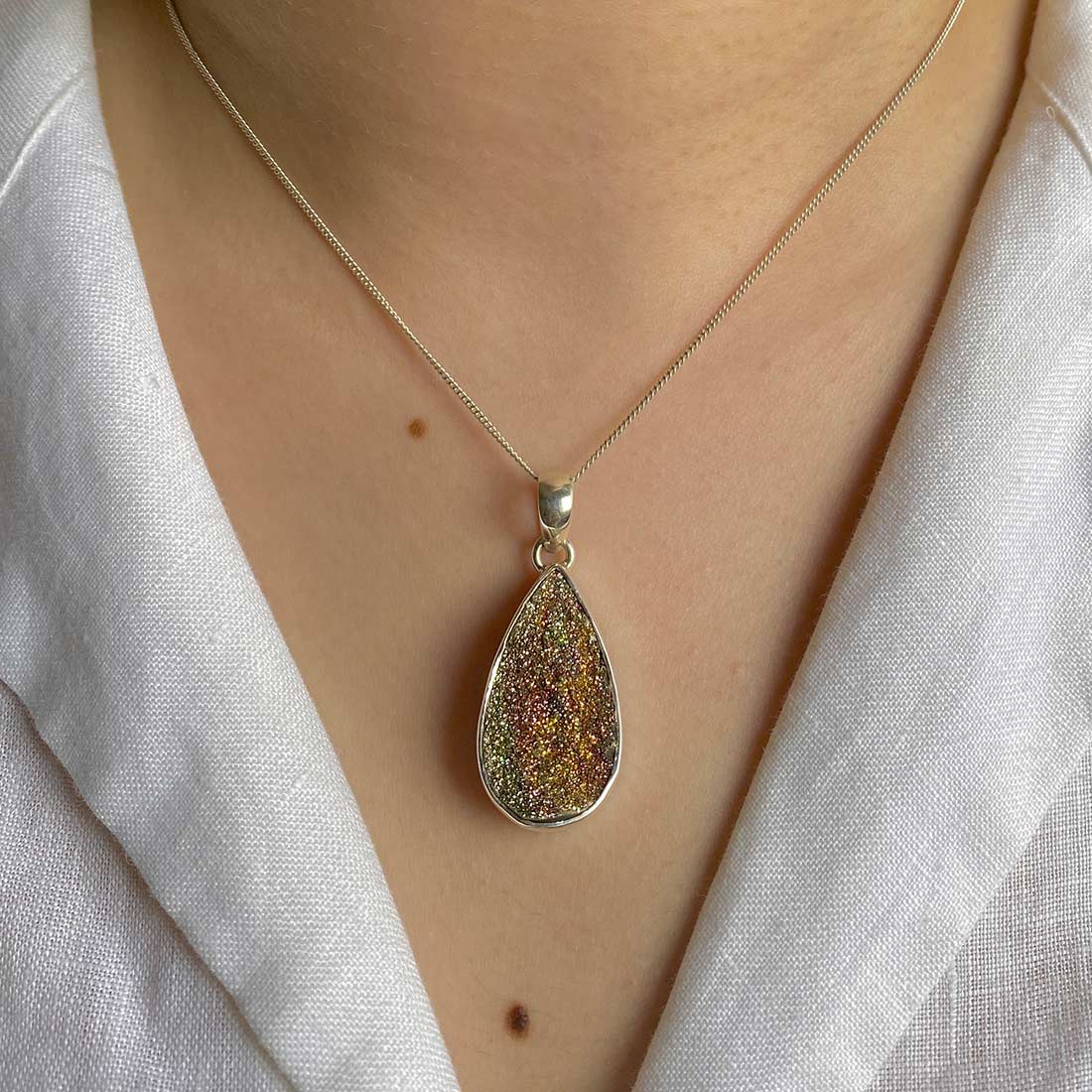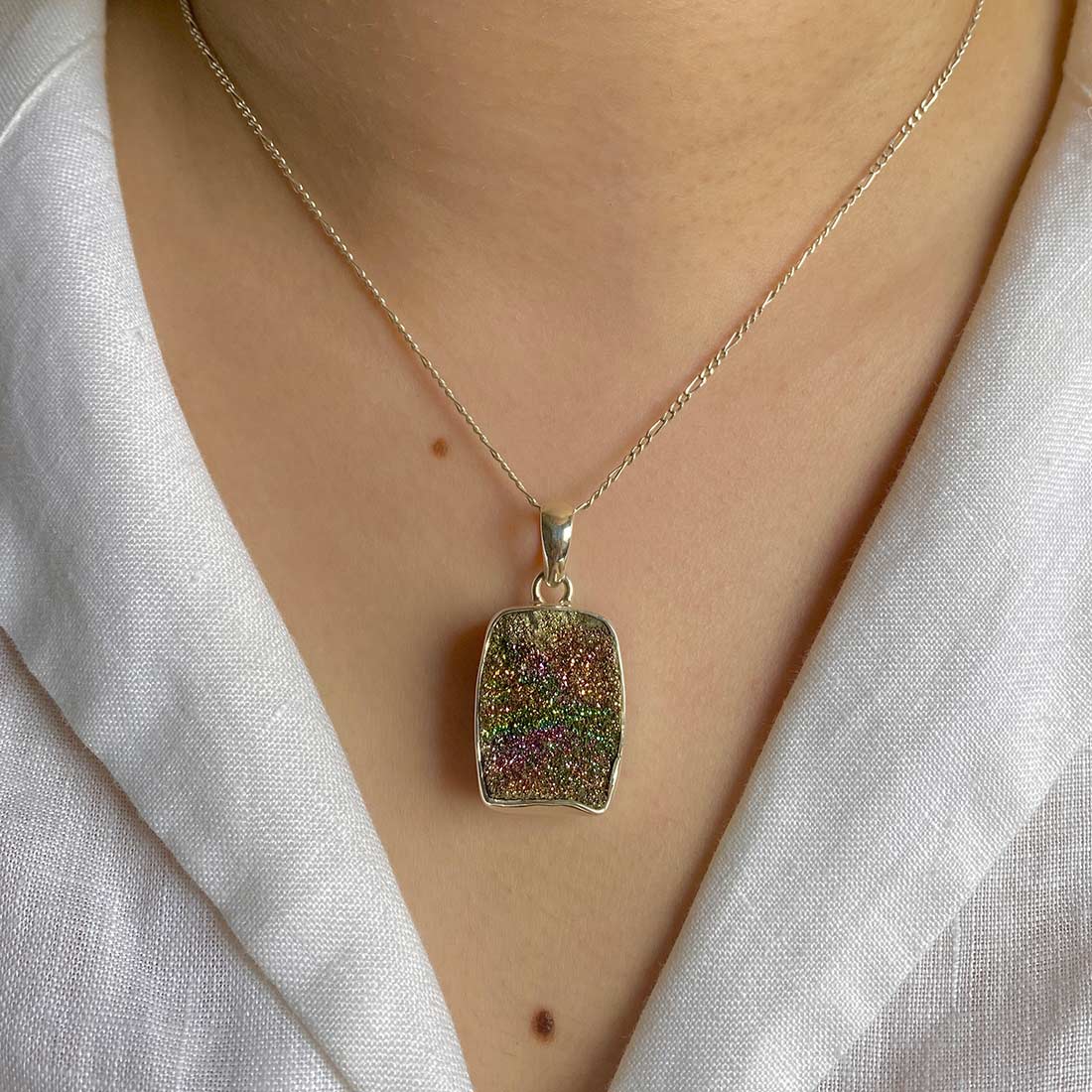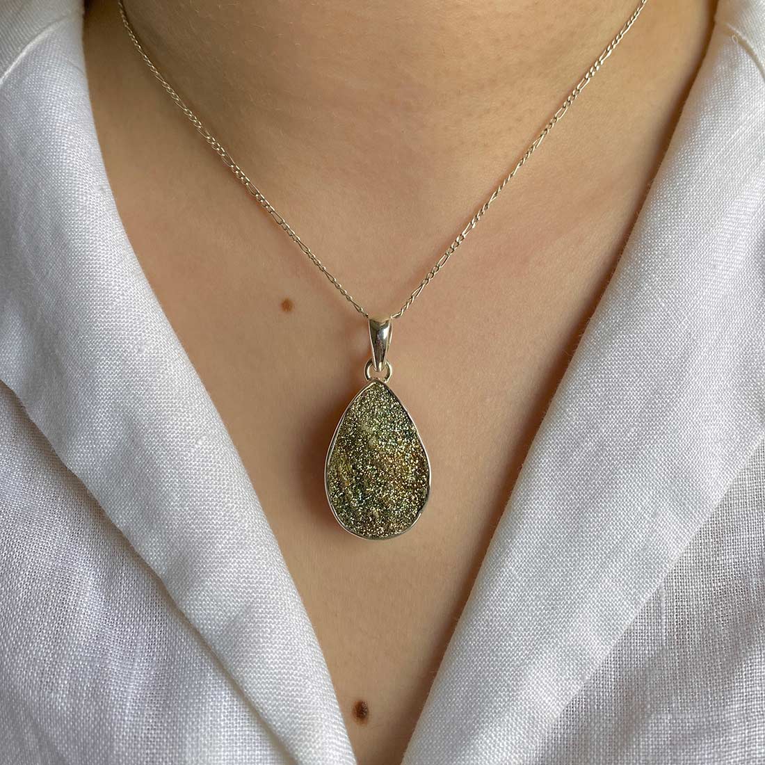 People say, “First impression is the last impression, and you won’t get any second opportunity to make up for it.” Quite true, after all, the way we carry our personality and present ourselves in front of others surely leaves a lasting mark on our presence at a place. But have you ever thought that the kind of accessory you wear could say unspoken things about you? Well, yes, your choice of Jewelry can uplift curtains off your personality. Not only this, it serves as a medium for others to communicate about who you are.Among all types of Jewelry, pendants like spectropyrite druzy pendants play a vital role in elevating our whole personality by finely defining our elegant neckline and clavicles.