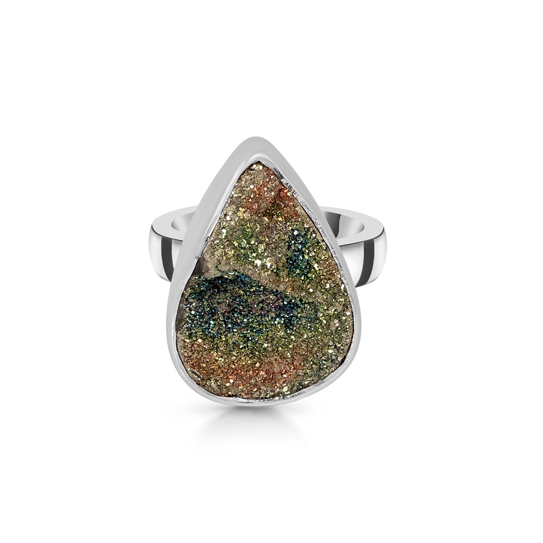 Undoubtedly, the stunning gemstone creates the most elite and luxurious Spectropyrite Druzy Jewelry that showcases something extraordinary and keeps eyes locked. In fact, when it gets exposed to light, this gleaming crystal creates an optical iridescent effect of spectrum colors, ranging from metallic Gold and silver to brilliant blues, greens, reds, purples, and pink. Fascinating, right? But how does it happen? Well, Pyrite is made of iron sulfide, and this optical phenomenon is created by thin layers of iron oxides within it. No wonder wearing a single piece of our Spectropyrite Druzy rings can help you create a perfect look while adding a hint of glimmer and shine.