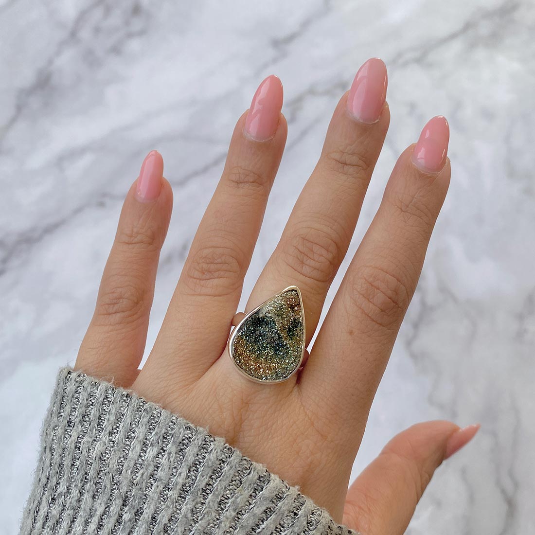 Mastering the art of styling rings should be included in everyone's to-do list by now. Trust us, you'll be spending less time guessing your final look and have more time to turn heads with your fashion sense. As a matter of fact, ring is something that gives you a finishing touch, complimenting your features, and pulls off your look together. Whether you want something subtle or something bold and outgoing, carefully chosen rings add a more polished and defined look to wearers. However, let us jump in and ask what you think, which is a type of accessory that can instantly bring onlookers' attention to your presence and make you stand out in the crowd. Yes, it is none other than these statement Spectropyrite Druzy rings.