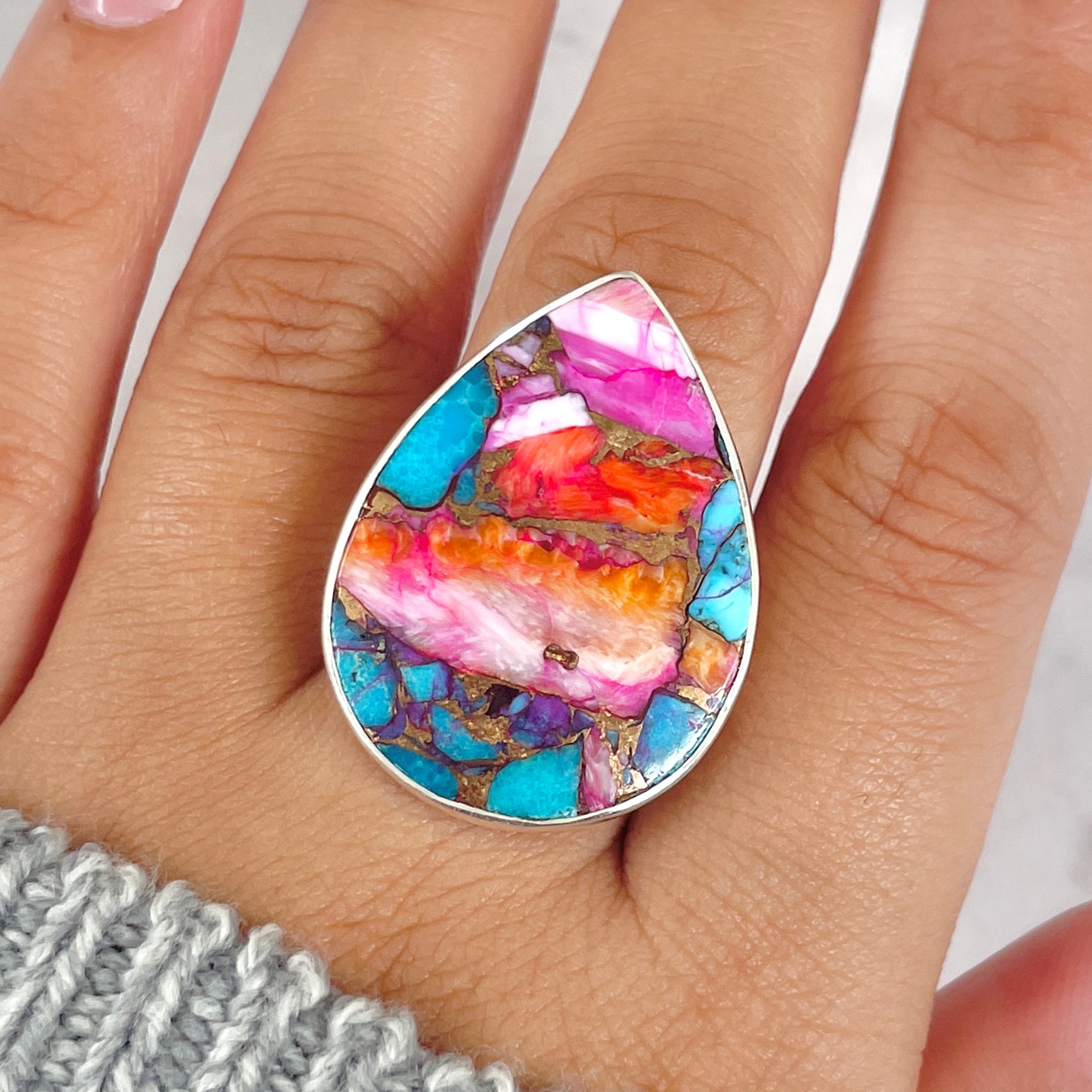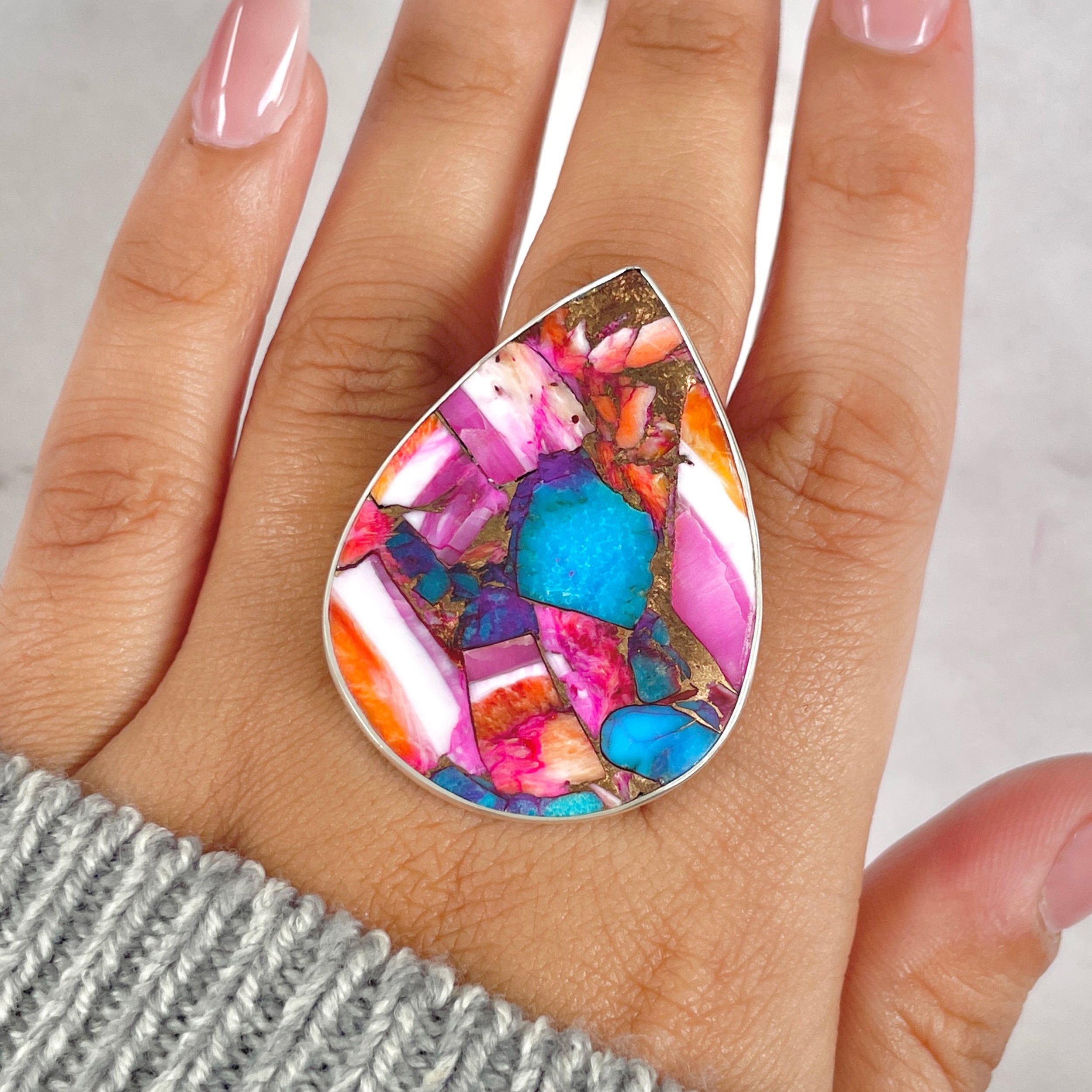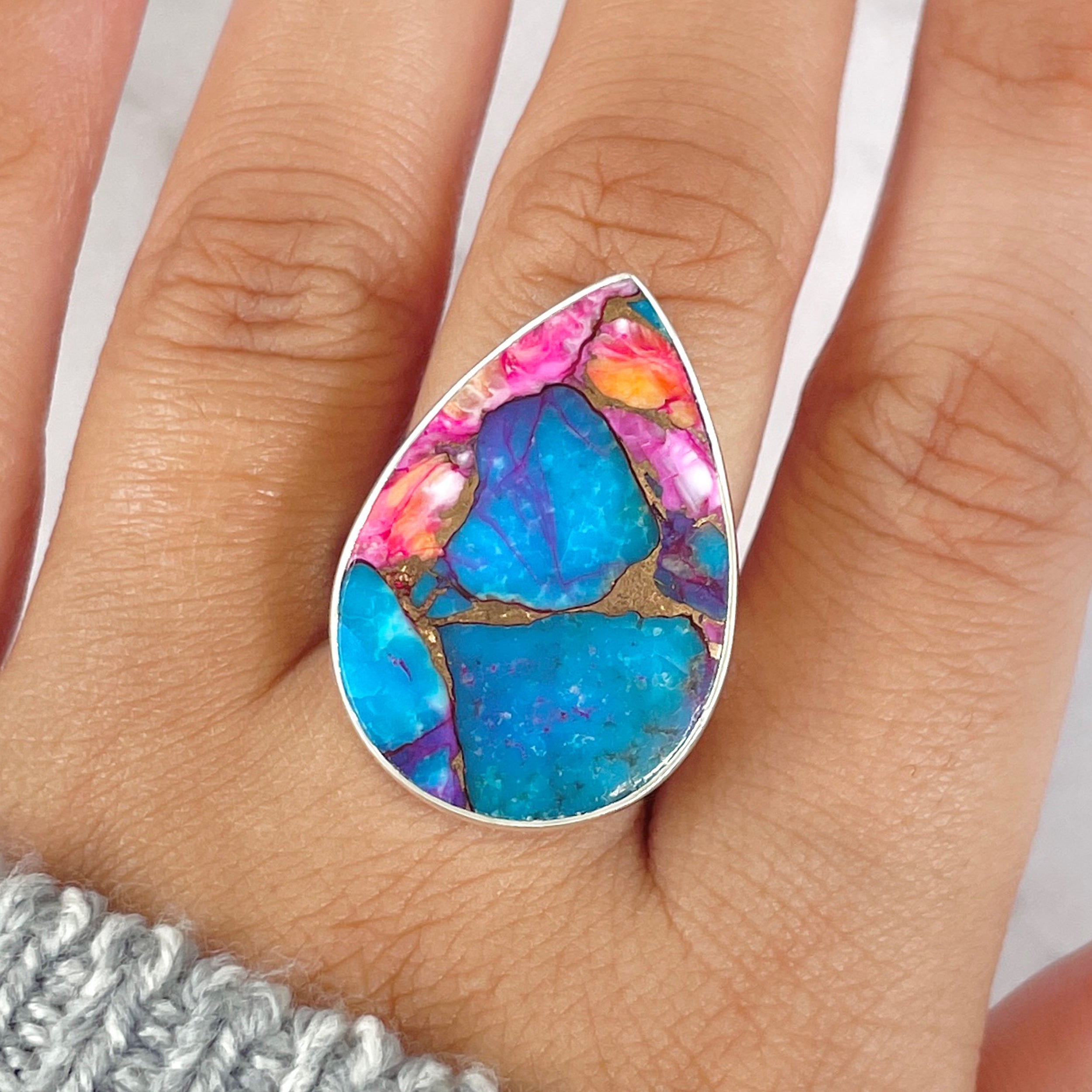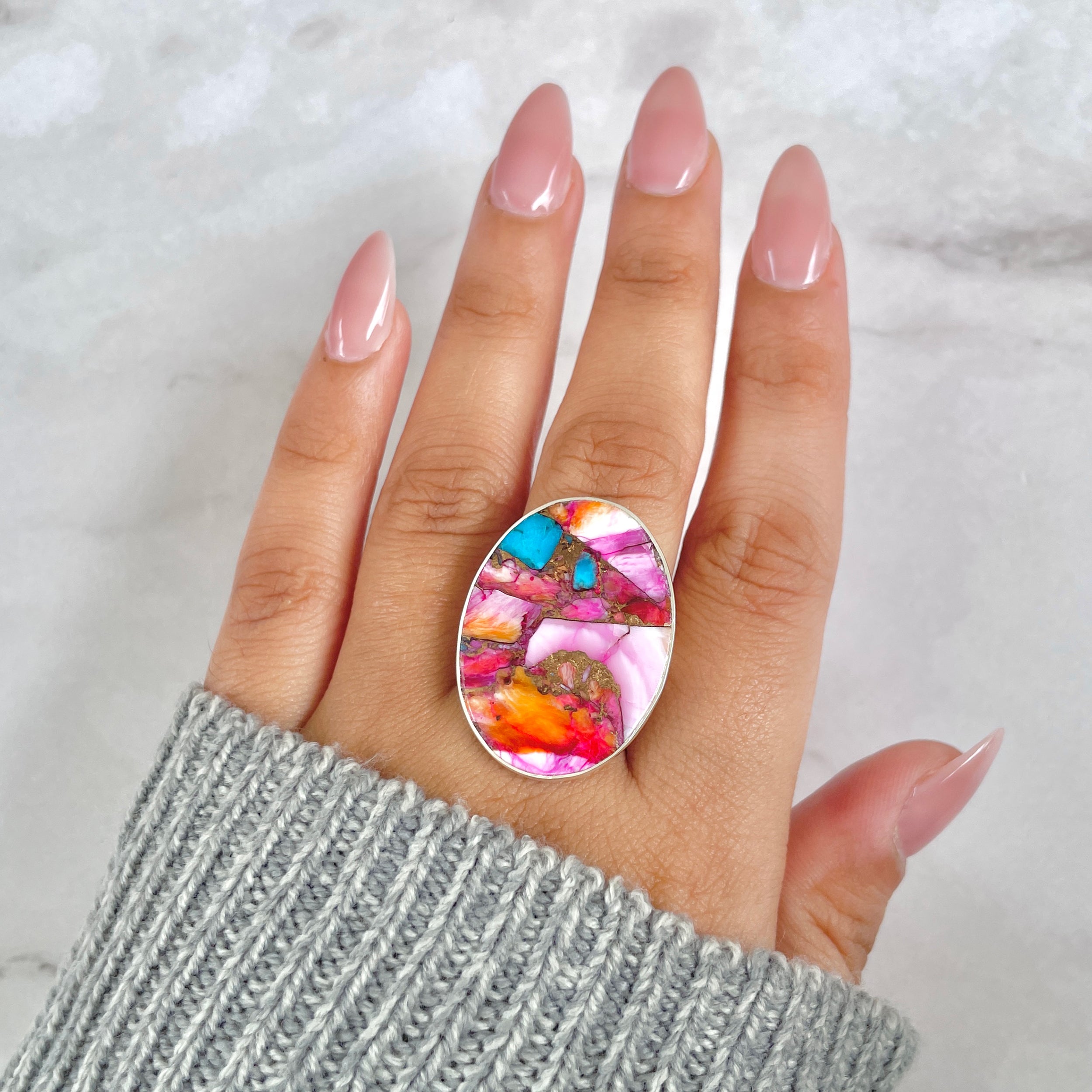 Since most Spiny Oyster Turquoise Jewelry pieces have a natural and beach look, pairing them correctly is essential. This versatile piece will complement either casual or formal looks. For a comfortable daytime look, pair your Spiny Oyster Turquoise rings with a loose white top, jeans, and sandals. The turquoise shades will be very noticeable with such an outfit. For an exquisite alternative, wear these Spiny Oyster Turquoise bracelets for a more formal evening with a navy blue dress or any outfit in any neutral shade. Let the ring take center stage by parrying other jewelry, such as Spiny Oyster Turquoise pendants so that the total power is allowed to radiate from it. Create also an indigenous-inspired look by pairing this ring with earthy tones and natural fabrics. This Spiny Oyster Turquoise ring will give a feel of nature and classic elegance to your attire, whether you are headed to the beach or a high-profile occasion.