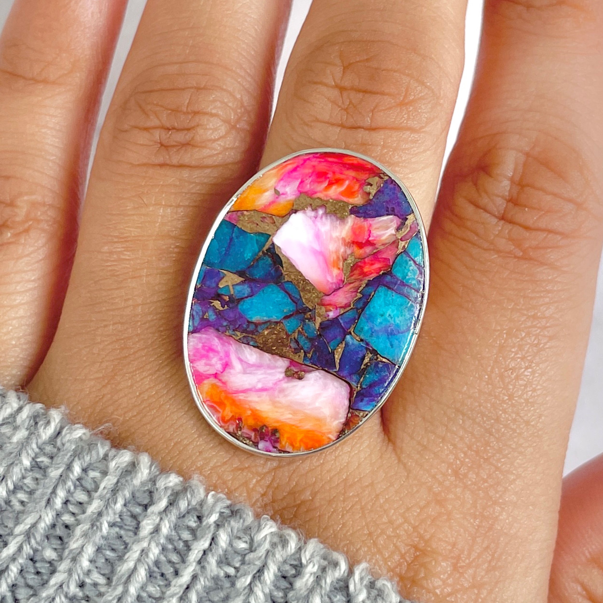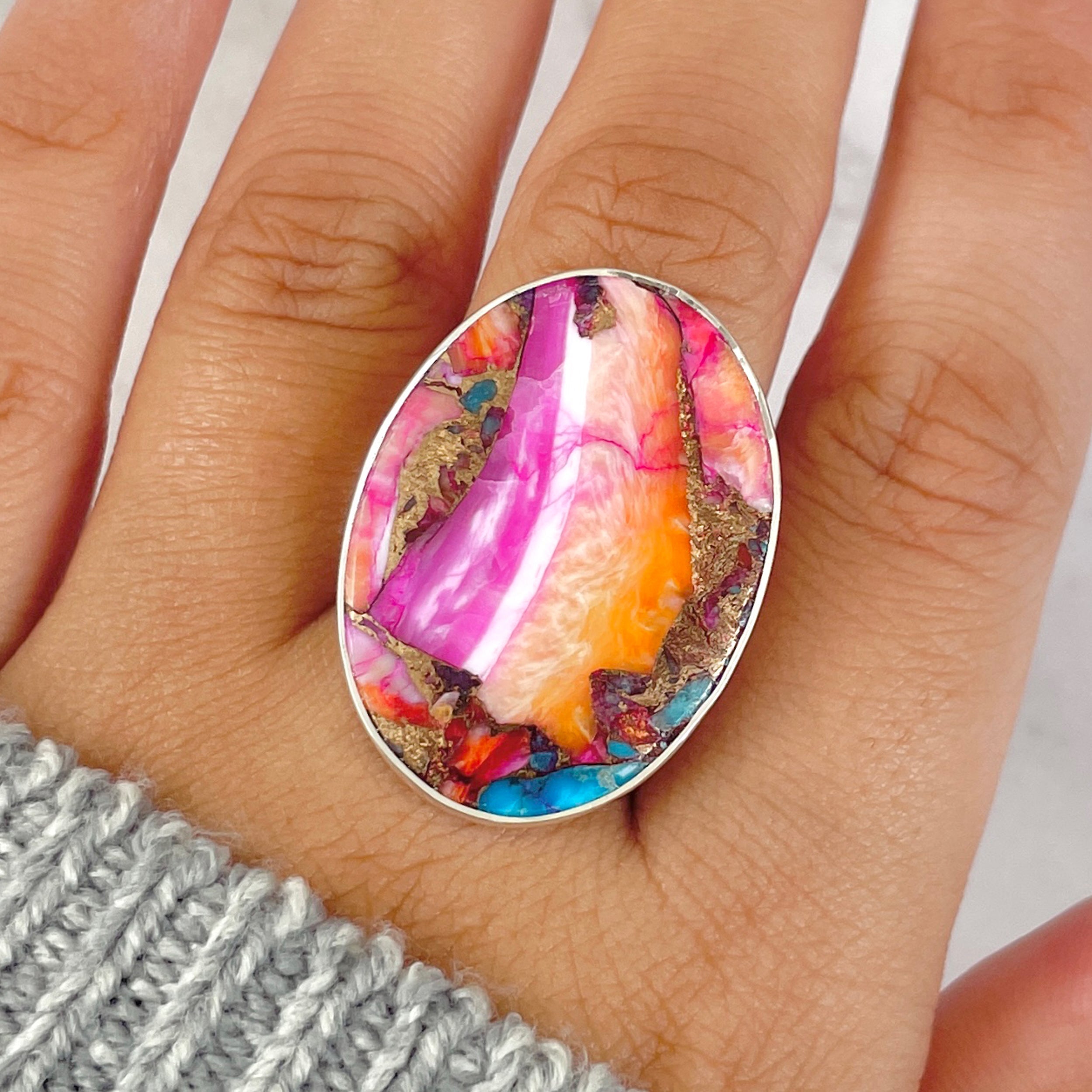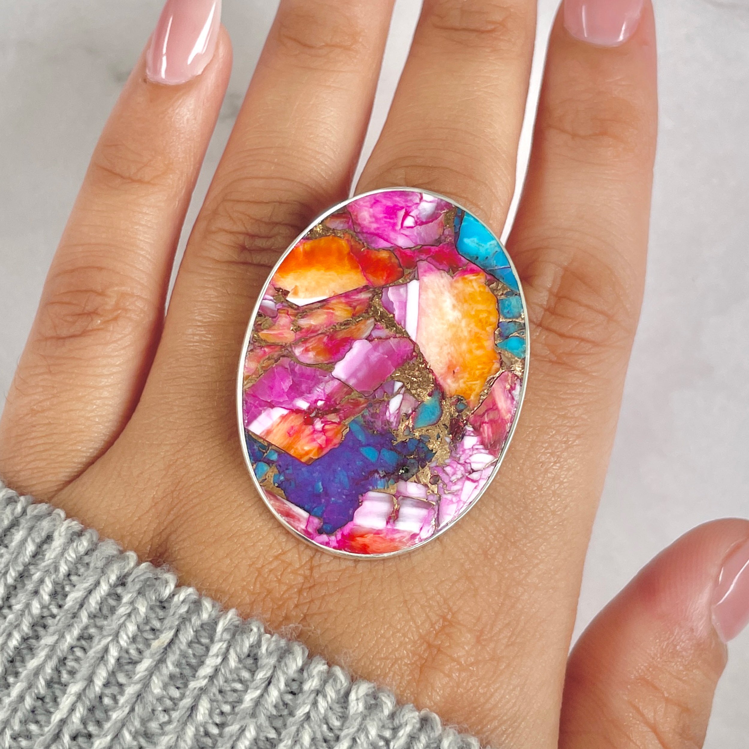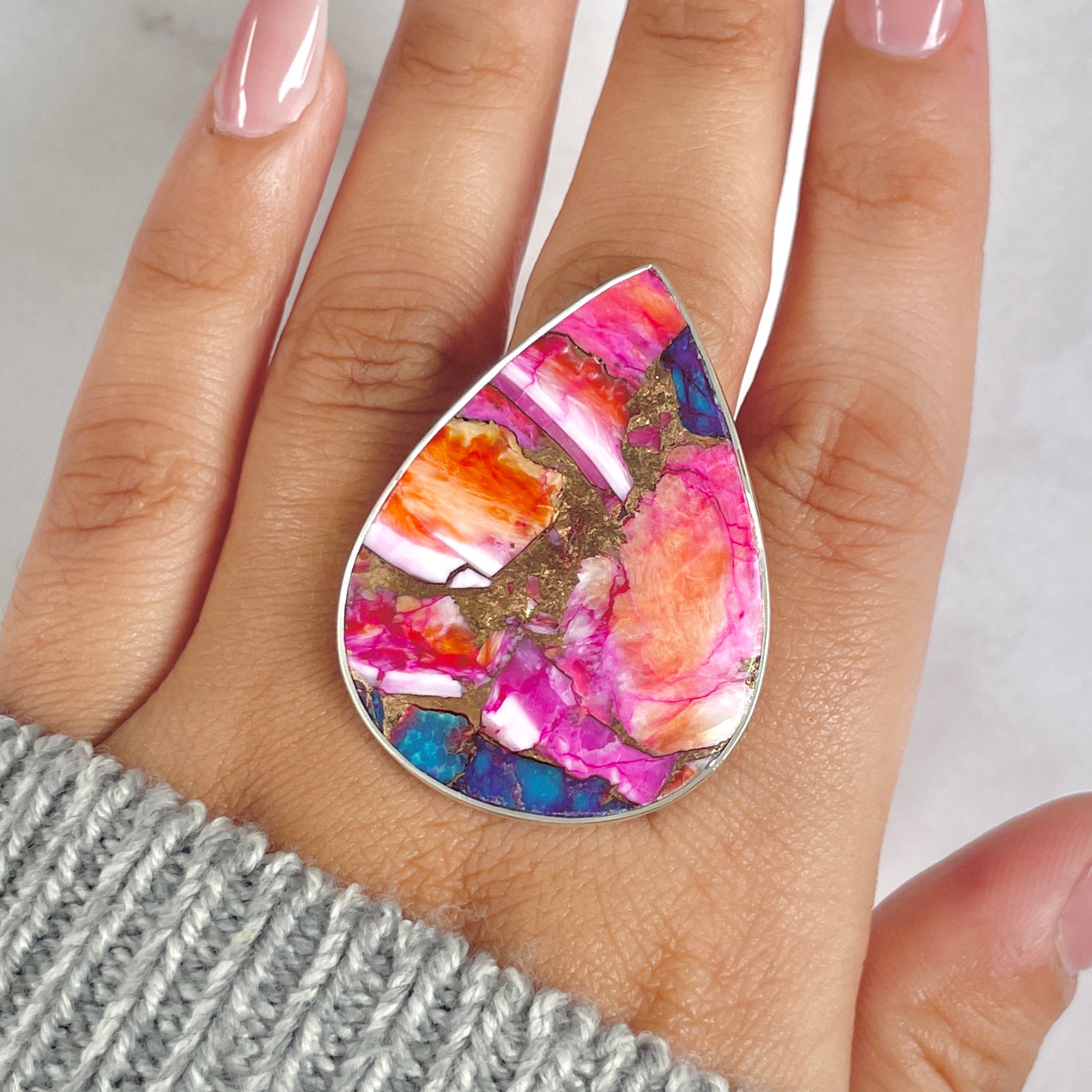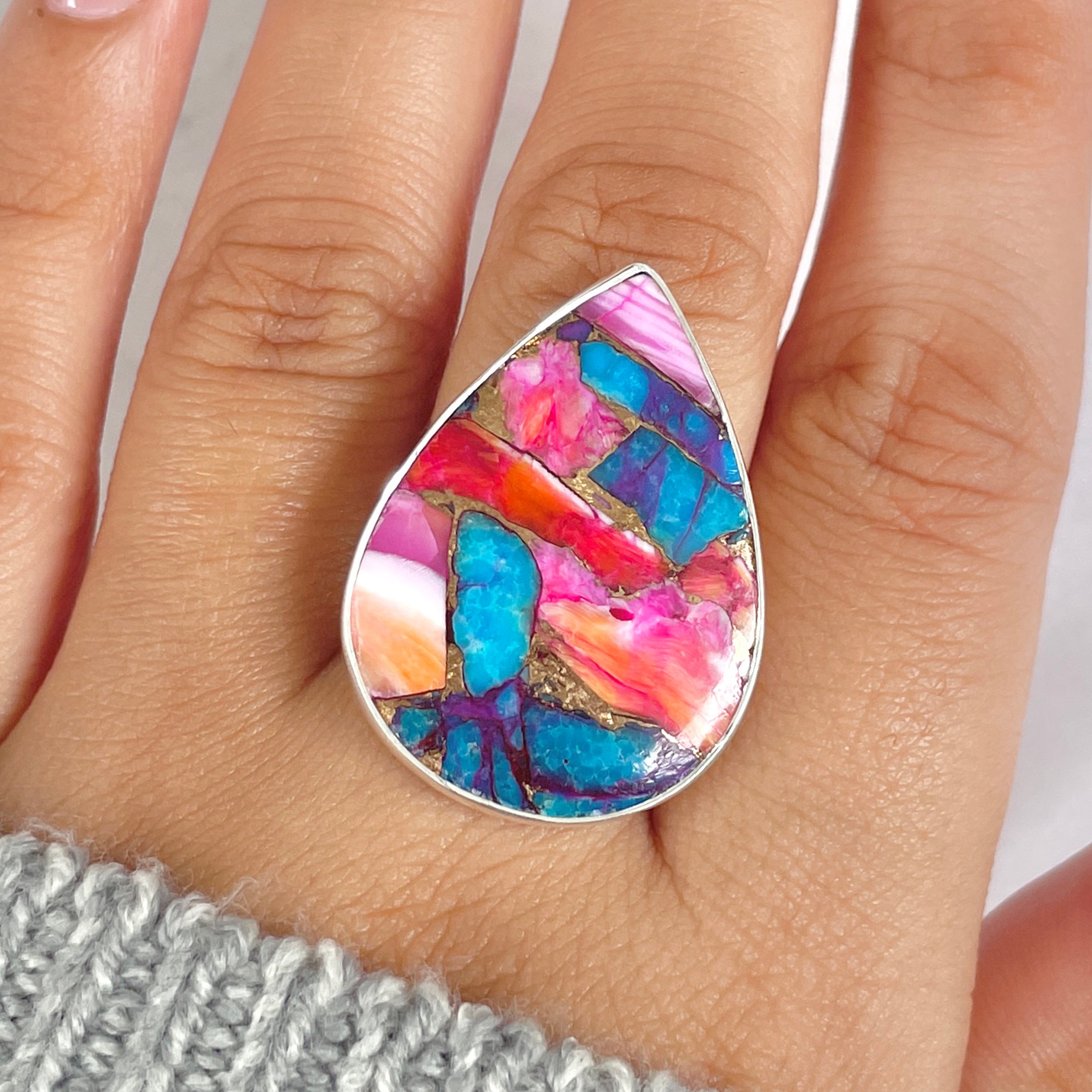 Enrich your personality with the mesmerizing charm of Spiny Oyster Turquoise Rings and other gemstone jewelry, such as larimar, opal, moonstone, Blue agate, and amethyst, from the Sagacia's Jewelry collection. Bring out an aura of quiet, which Spiny Oyster Turquoise harbors, to uplift and add charm to your personal style. This magnificent gemstone forms the crux of communication, creativity, and balance inside. Stack your Spiny Oyster Turquoise ring with others that beautifully complement the stone, allowing this sophisticated, expressive look to spell out your personality, such as Larimar rings, Garnet rings, or Ammolite rings. Explore the captivating blues and greens with Spiny Oyster Turquoise or discover the metaphysical many other available gemstones. Make this Sagacia's Jewelry collection your way to showcase peace and sophistication everywhere you go.