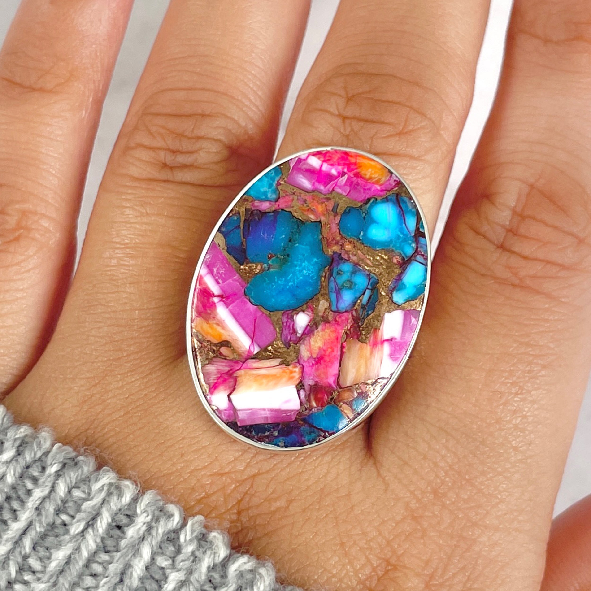 Attuning to Spiny Oyster Turquoise rings has its various healings. This is claimed to instill a sense of peace and inner serenity, hence being helpful for anyone passing stress or anxiety. The stone's prominent blue and green colors are often compared with the ocean's qualities, which inspire peace of mind and tend to soothe emotions. It is also believed that Spiny Oyster Turquoise Jewelry helps improve a person's communication so that he can think and feel precisely and confidently. Wearing an Spiny Oyster Turquoise ring may help liberate creativity and inspirational art, making it a proper ring for creative professionals. It can, therefore, help to remedy challenges and improve breathing problems and the immune system of the body. It helps detoxify and cleanse the body for perfect health. Whether for aesthetic appeal or metaphysical attributes, an added ring, such as an Spiny Oyster Turquoise rings, is one piece that is always kept for attuning to the subconscious self and the balance of inner communication and physical well-being.