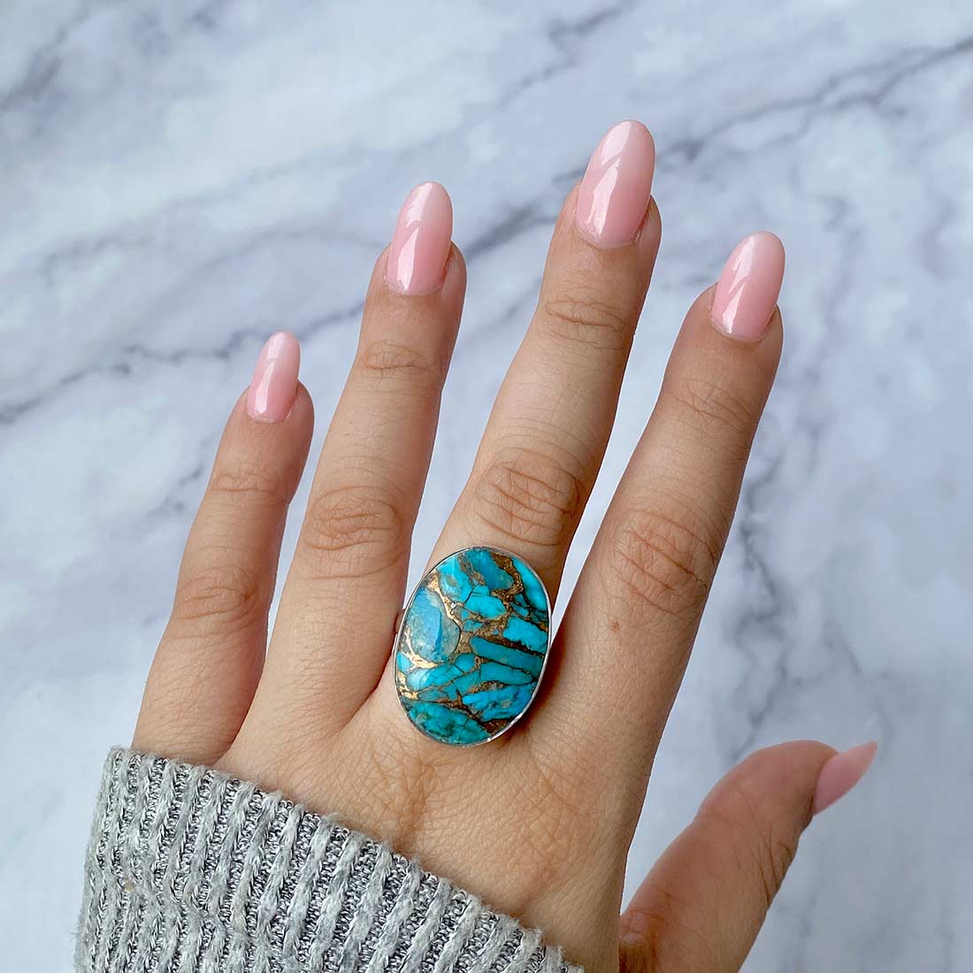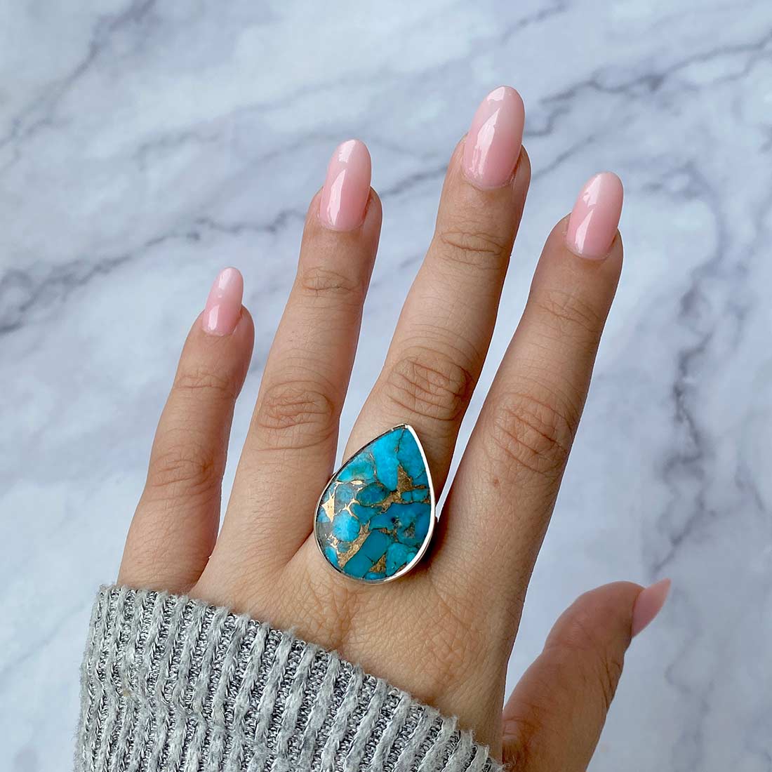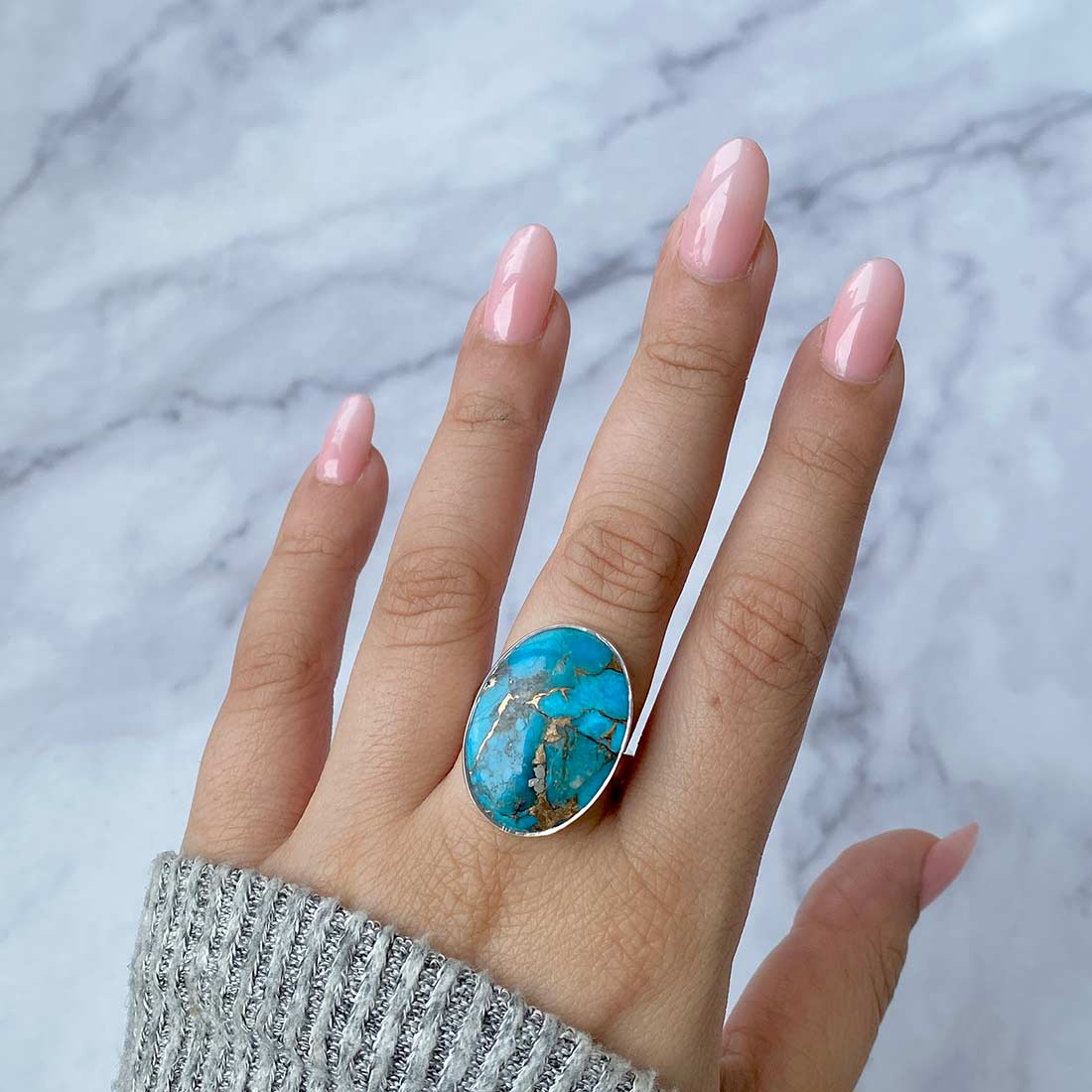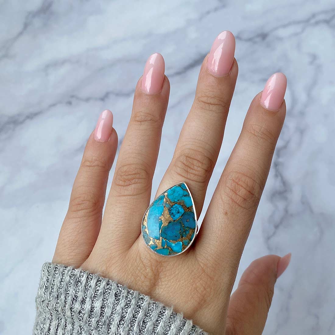 Regarding styling, copper turquoise rings can also be worn as a statement piece because its color and vein patterns are already captivating. Copper Turquoise rings are multi-functional. They can be worn for an uncluttered look or stacked with other rings for a more aesthetic. Wear the set with jeans and a basic T-shirt, and dress up in a black dress or gown with coordinating copper turquoise earrings or pendant. You can wear copper turquoise rings to any event, which adds to their appeal.