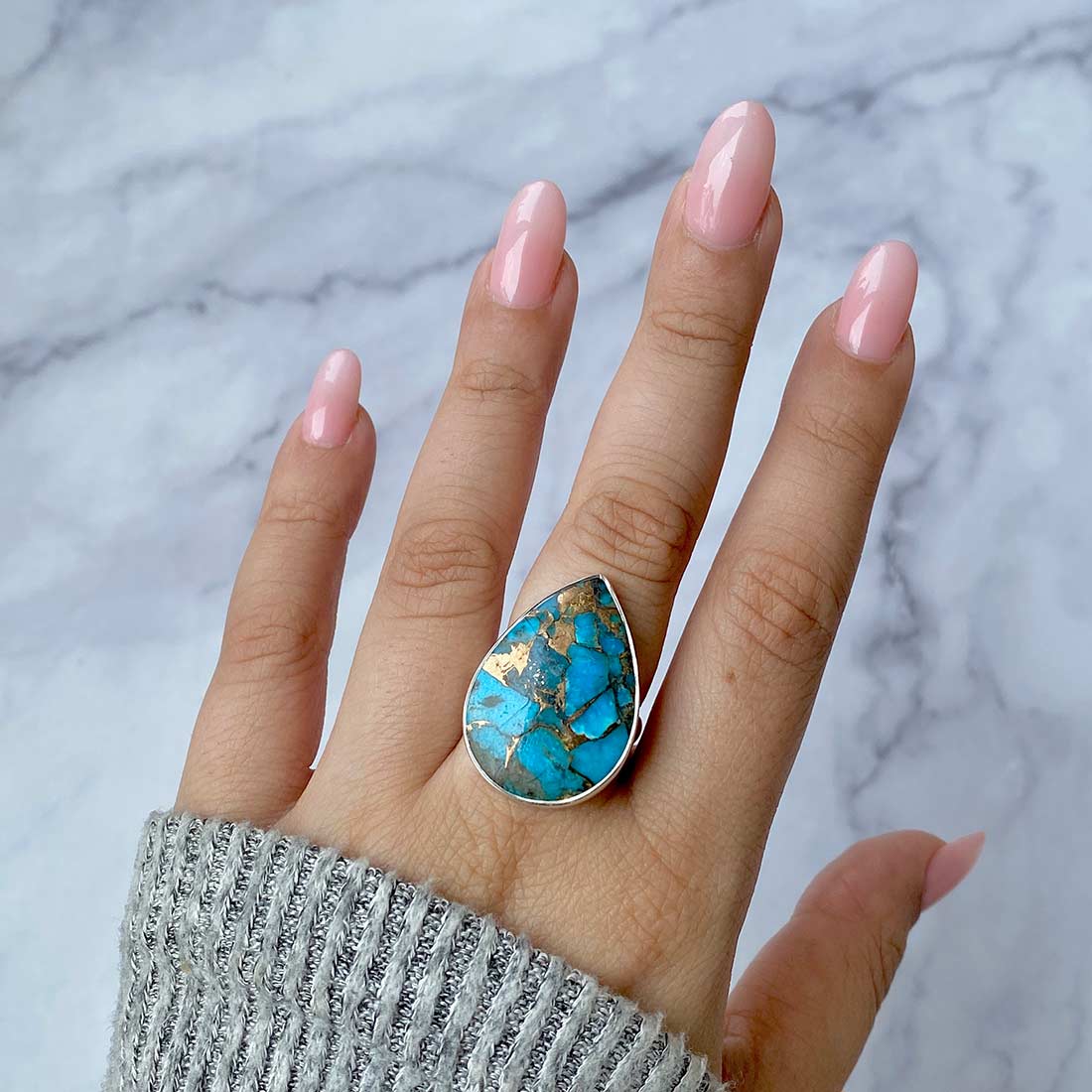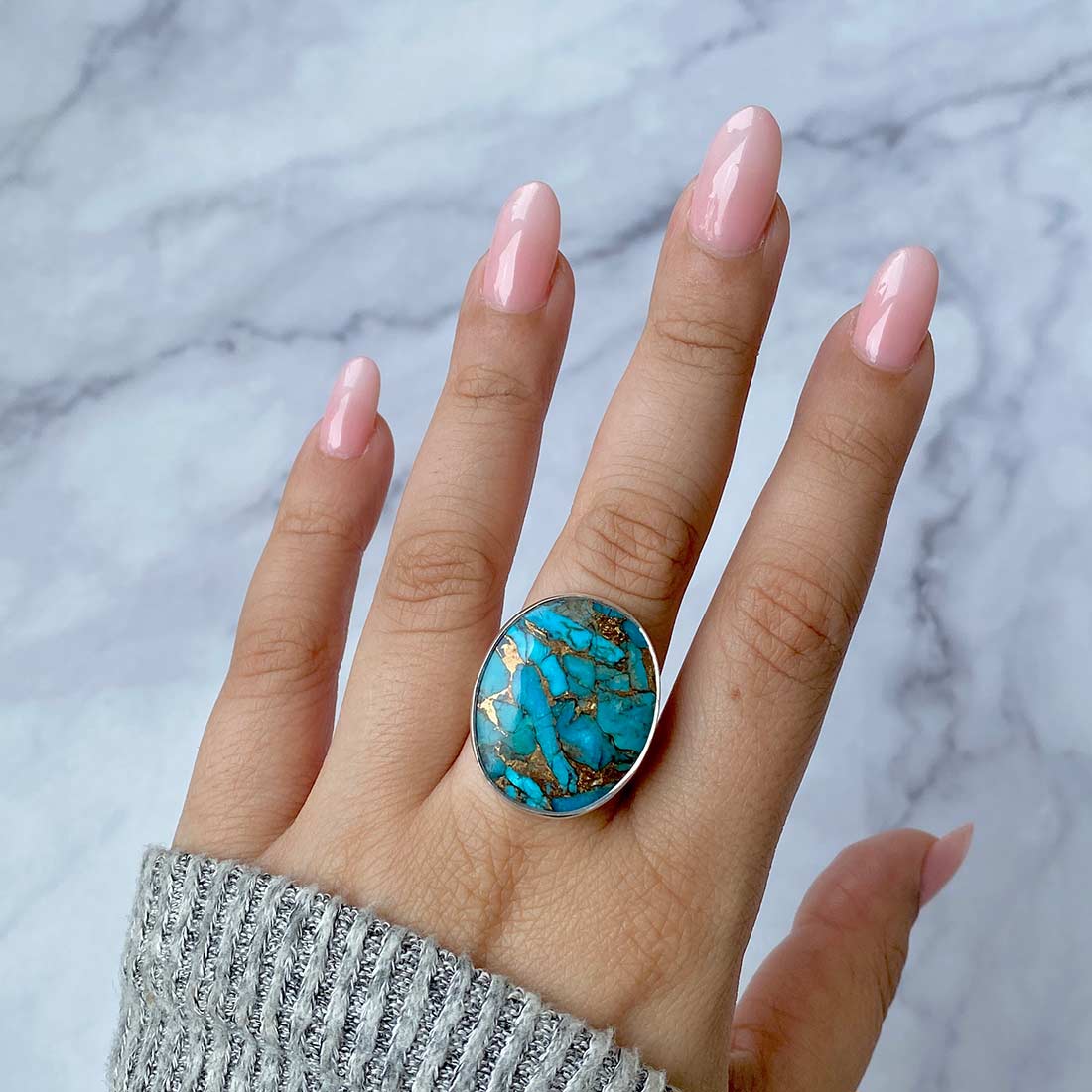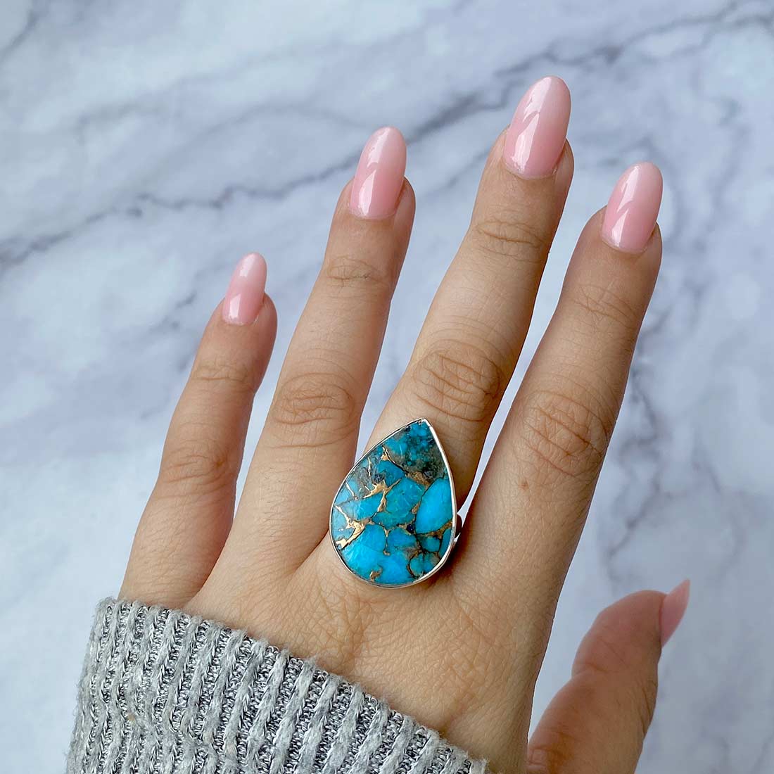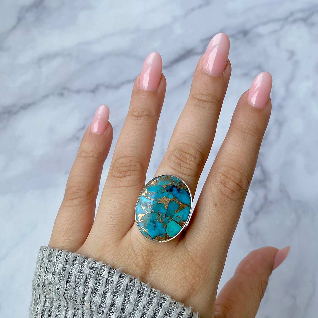 Regarding styling, copper turquoise rings can also be worn as a statement piece because its color and vein patterns are already captivating. Copper Turquoise rings are multi-functional. They can be worn for an uncluttered look or stacked with other rings for a more aesthetic. Wear the set with jeans and a basic T-shirt, and dress up in a black dress or gown with coordinating copper turquoise earrings or pendant. You can wear copper turquoise rings to any event, which adds to their appeal.