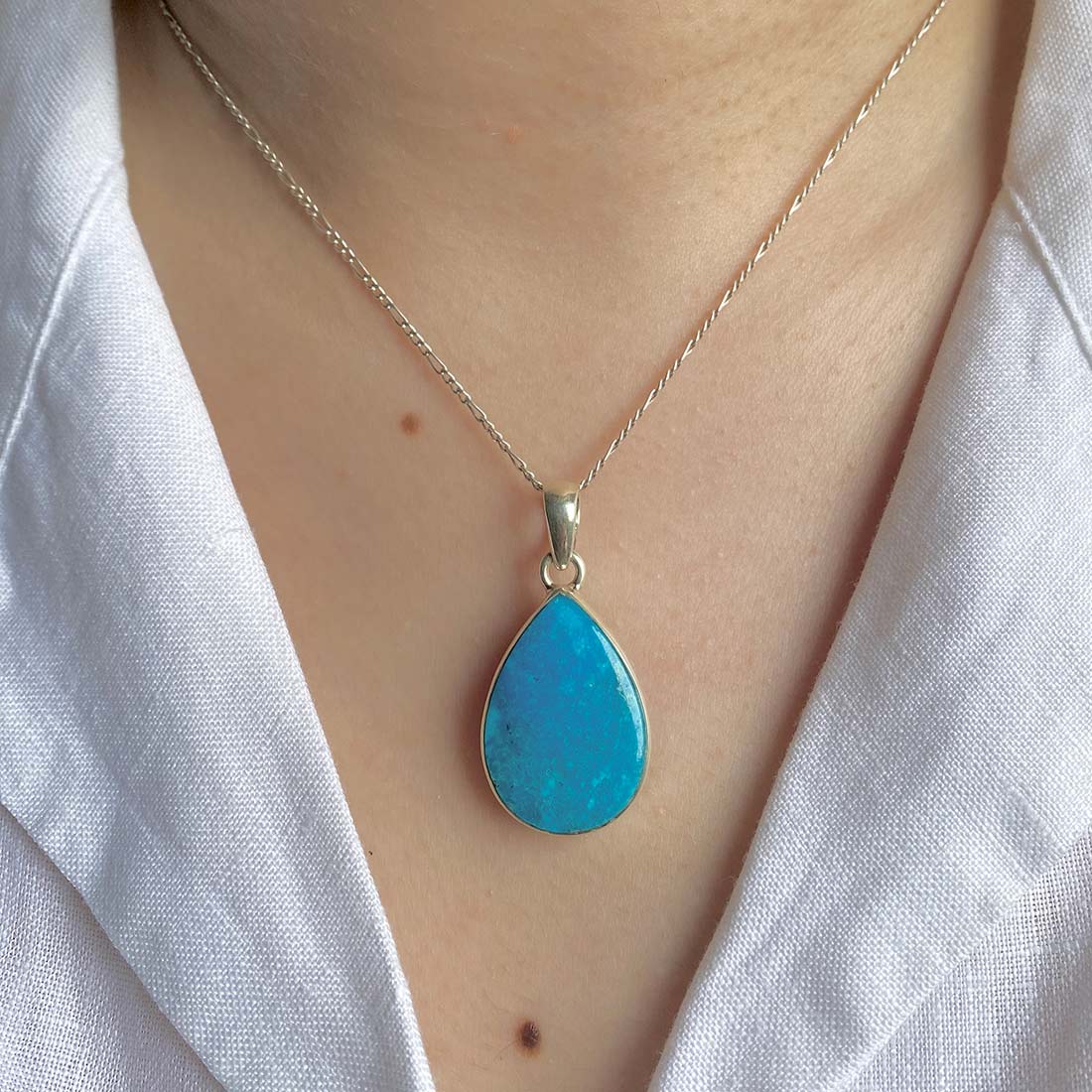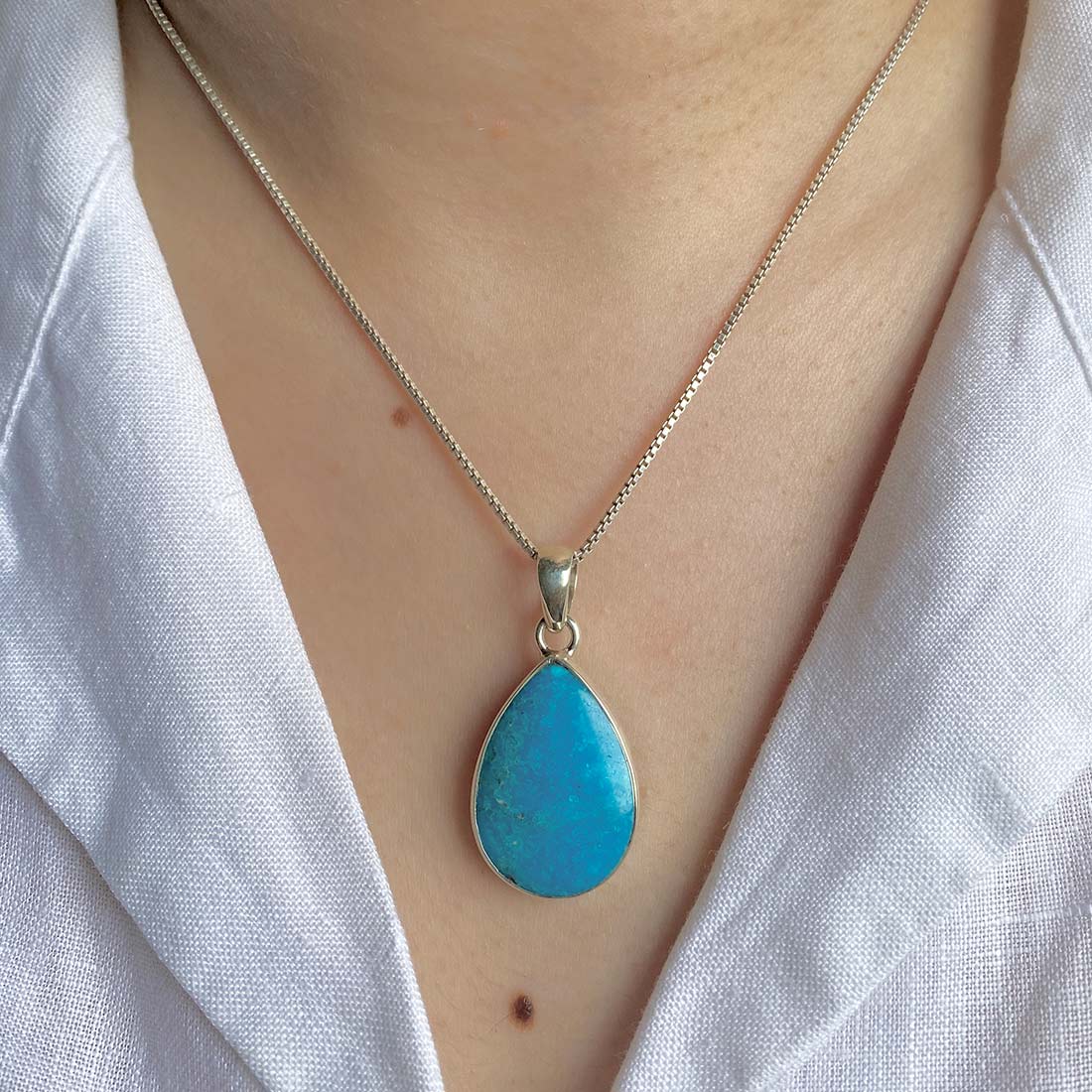 Given its stunning bluish-green shade and exquisite cuts, you can style your Turquoise pendants in many ways. For example, you can adore them with a white blazer and skinny jeans for an elegant office look. If you're going to a friend's home for a party, the combo of an olive top with a blue denim pencil skirt will help you look chic in no time. Level up your look with our Turquoise bracelets. In a while, our Turquoise rings can be impressively paired up with a white one-piece dress for cooler vibes. Adore our Turquoise earrings in studs or hoops with a navy lace bodycon dress, and convey elegant vibes with a leather clutch and heeled sandals.