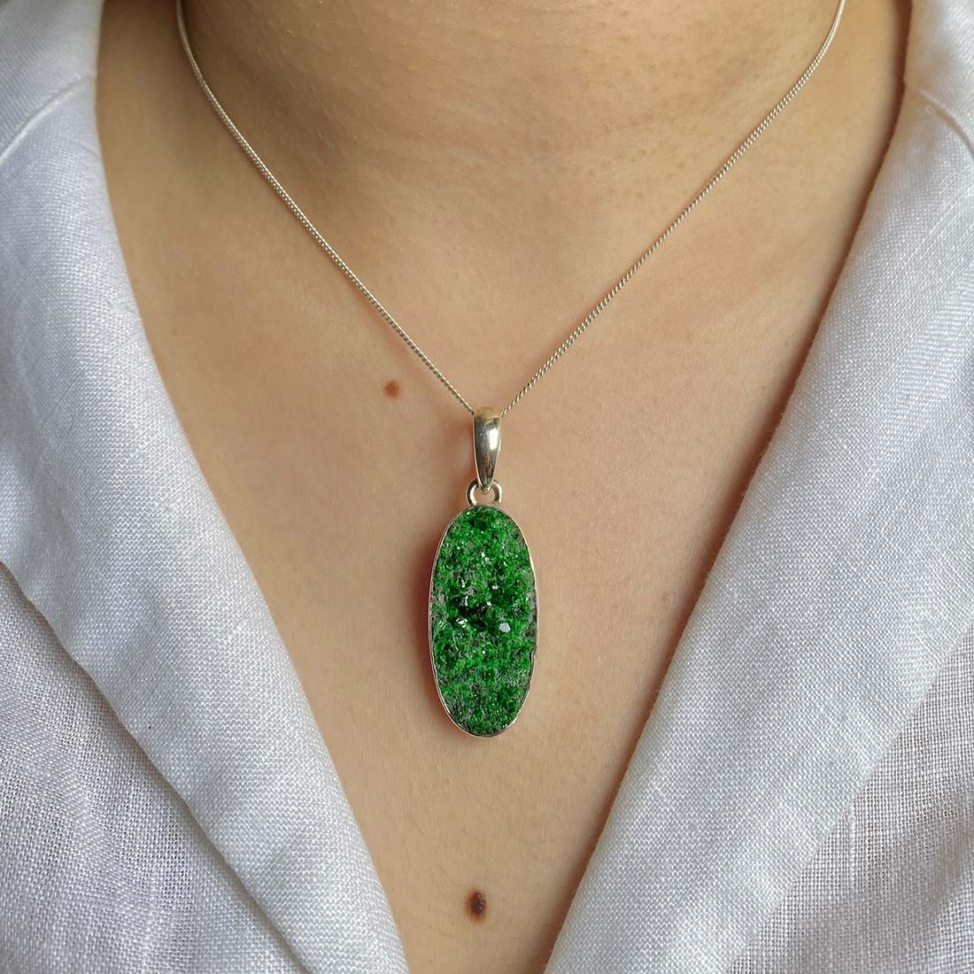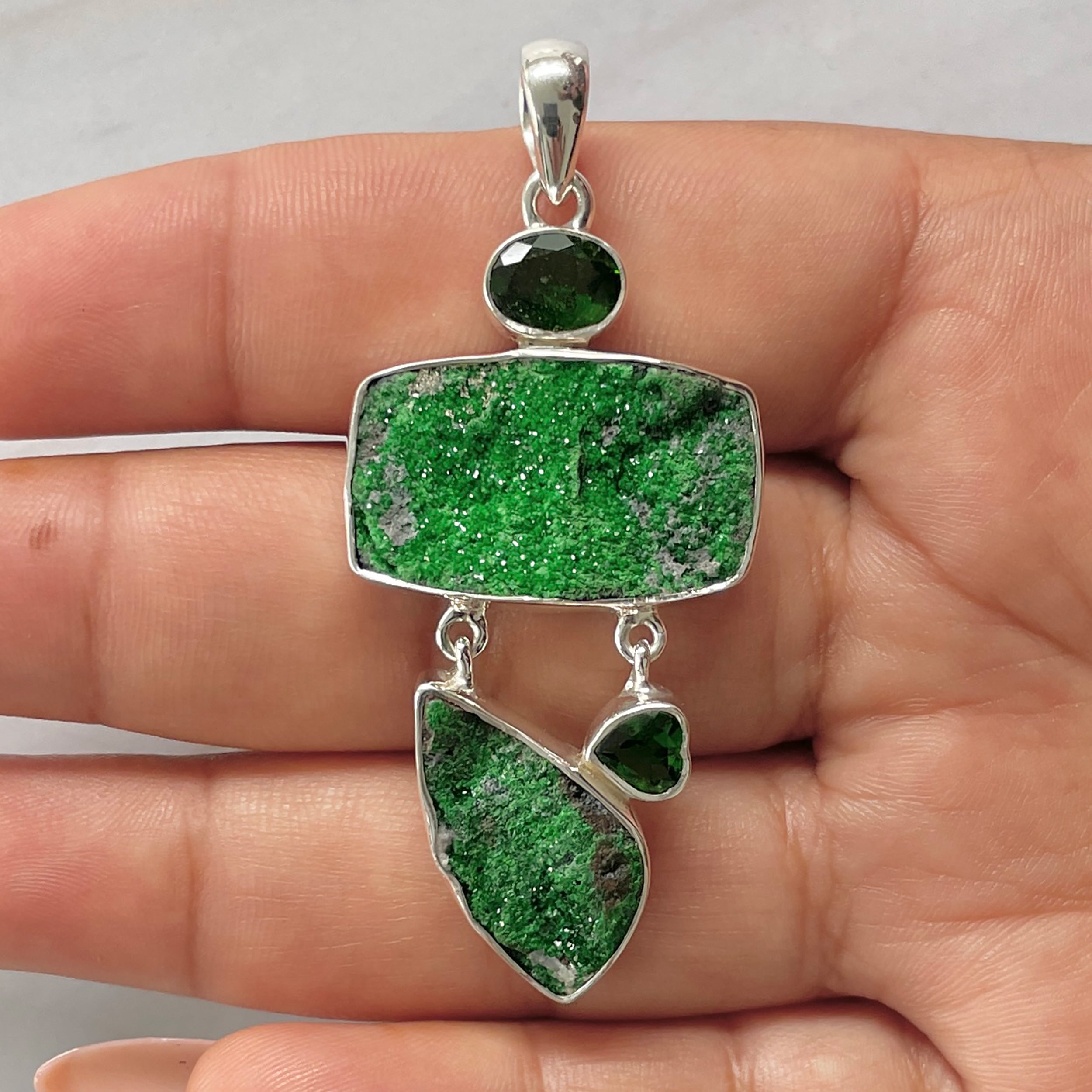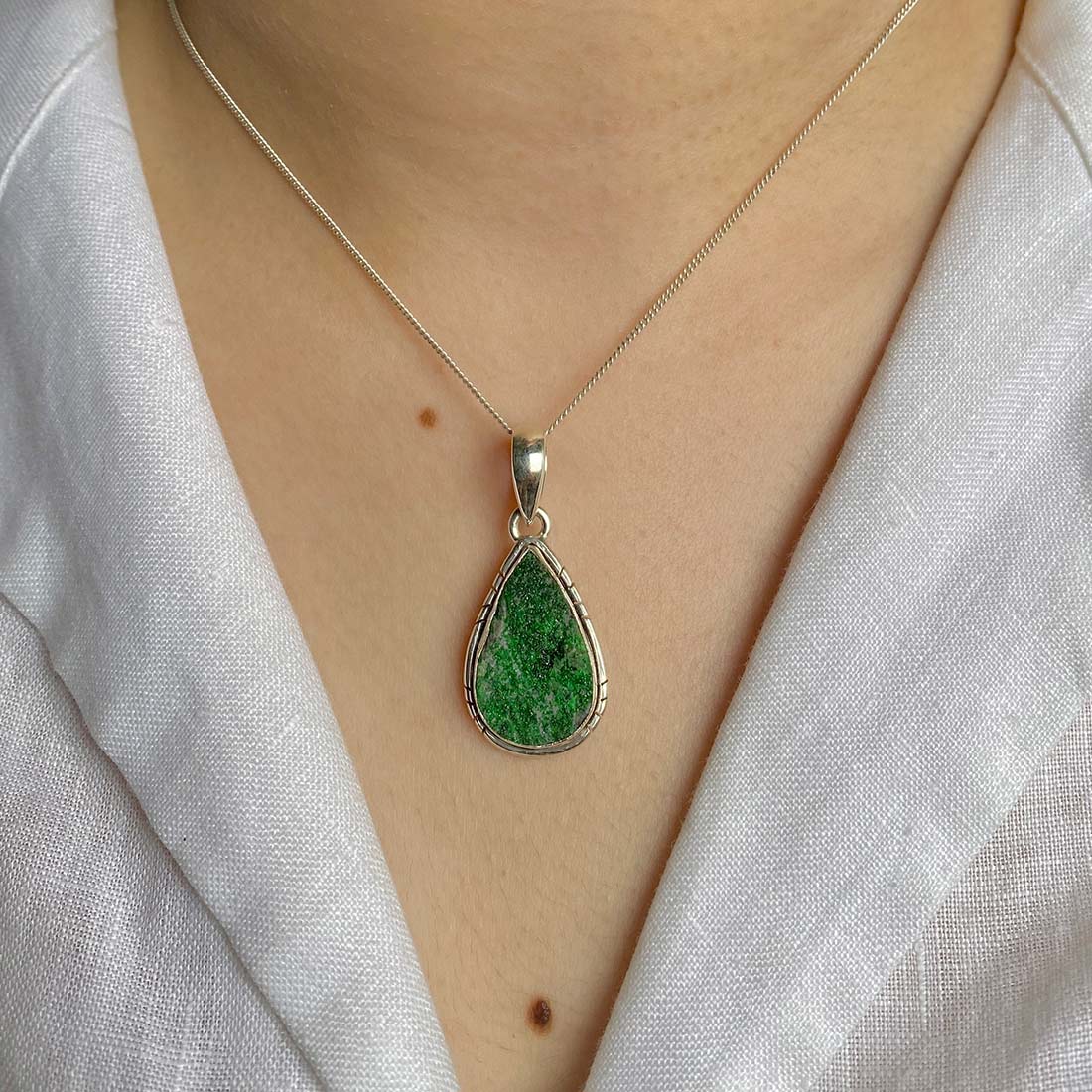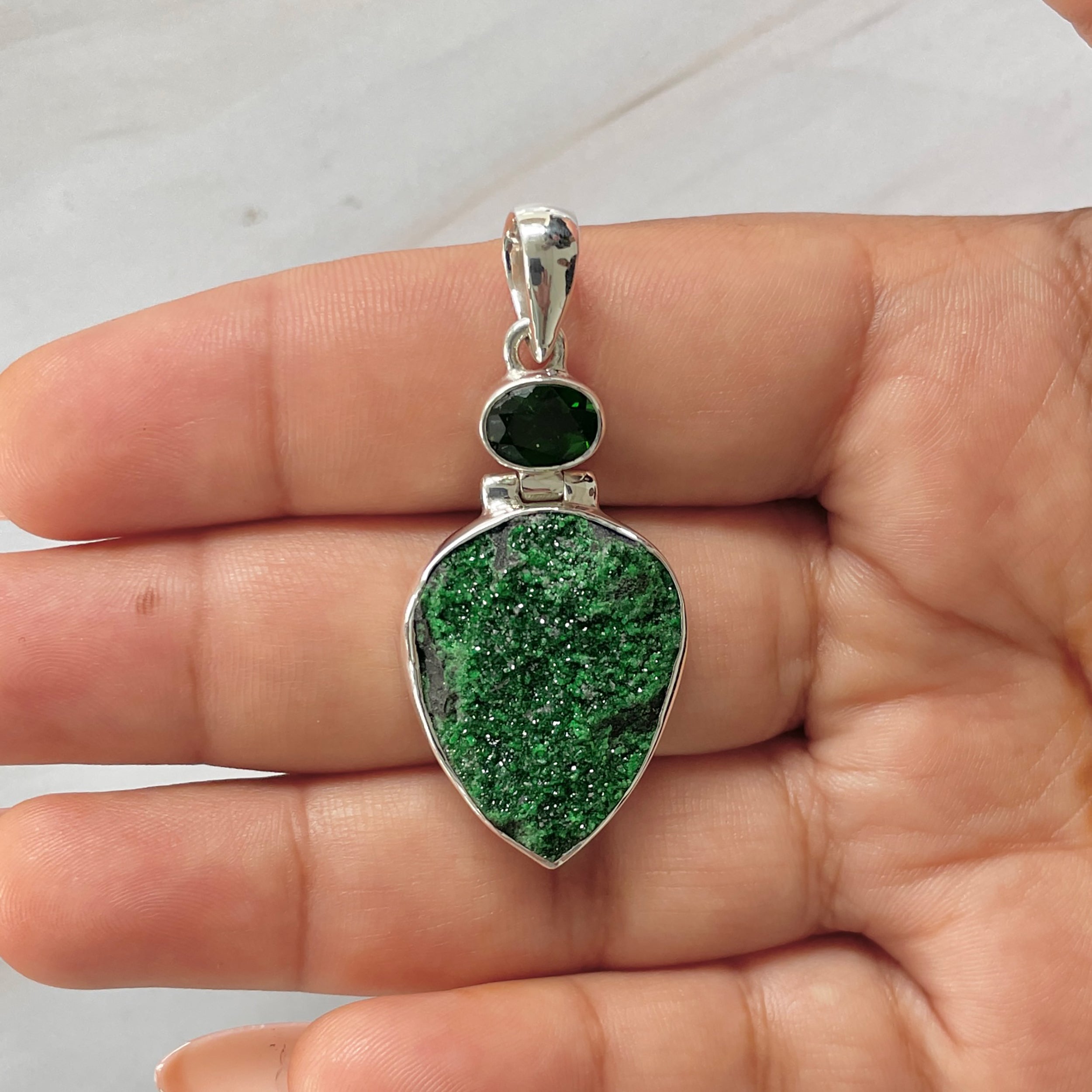 Let’s adorn your statement uvarovite pendant with style. Whether you are looking for a jewelry piece for an office party, a birthday or an anniversary, this enthralling green jewel will set fire on stage. Everywhere, everyone will just roam around to ask where you got this astonishing neckpiece from because it is purely handmade and curated in authentic 925 sterling silver.