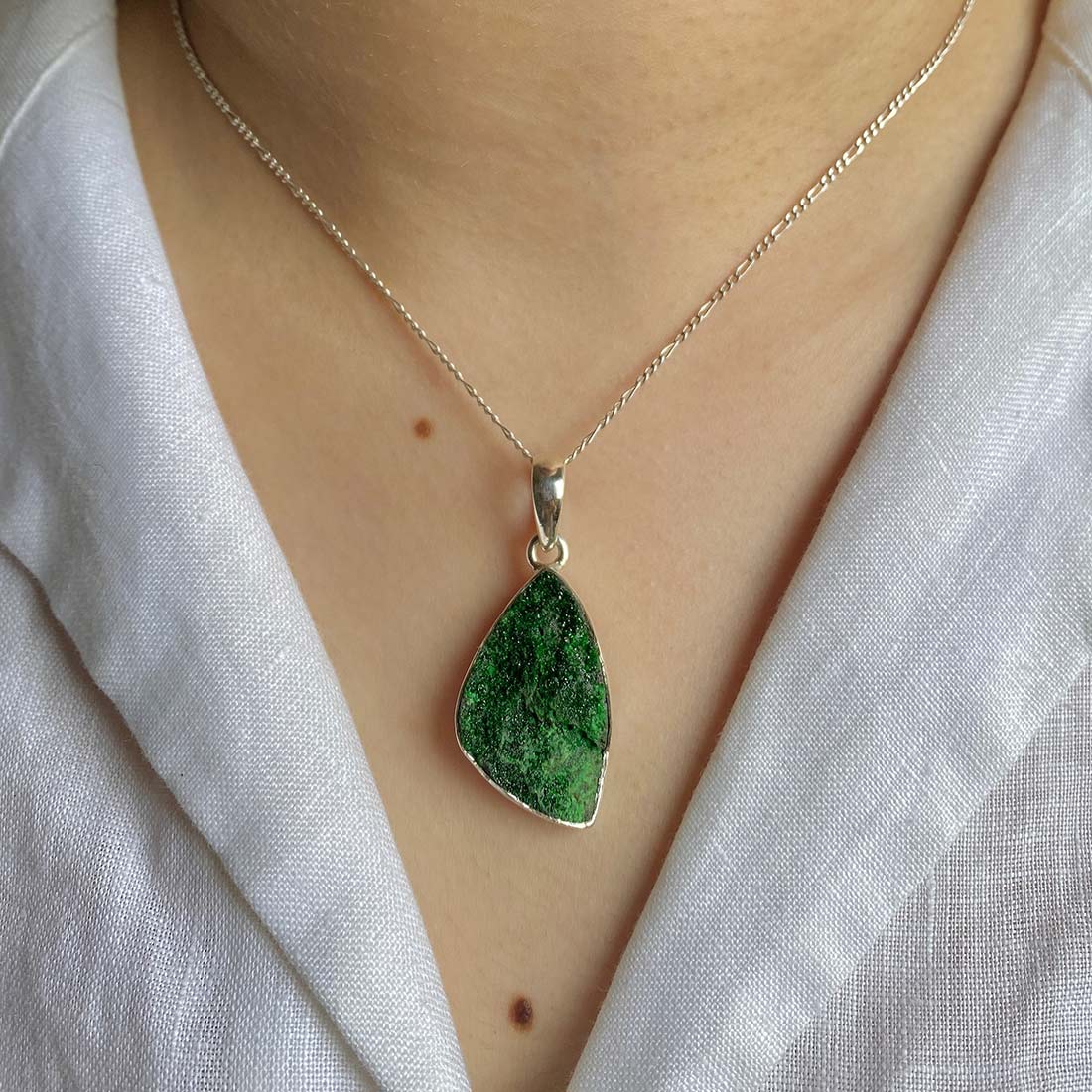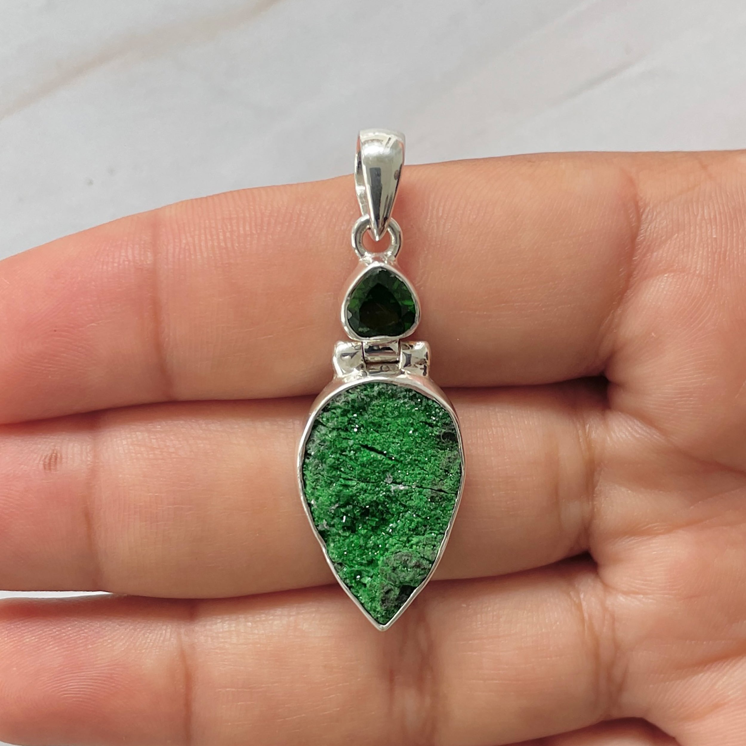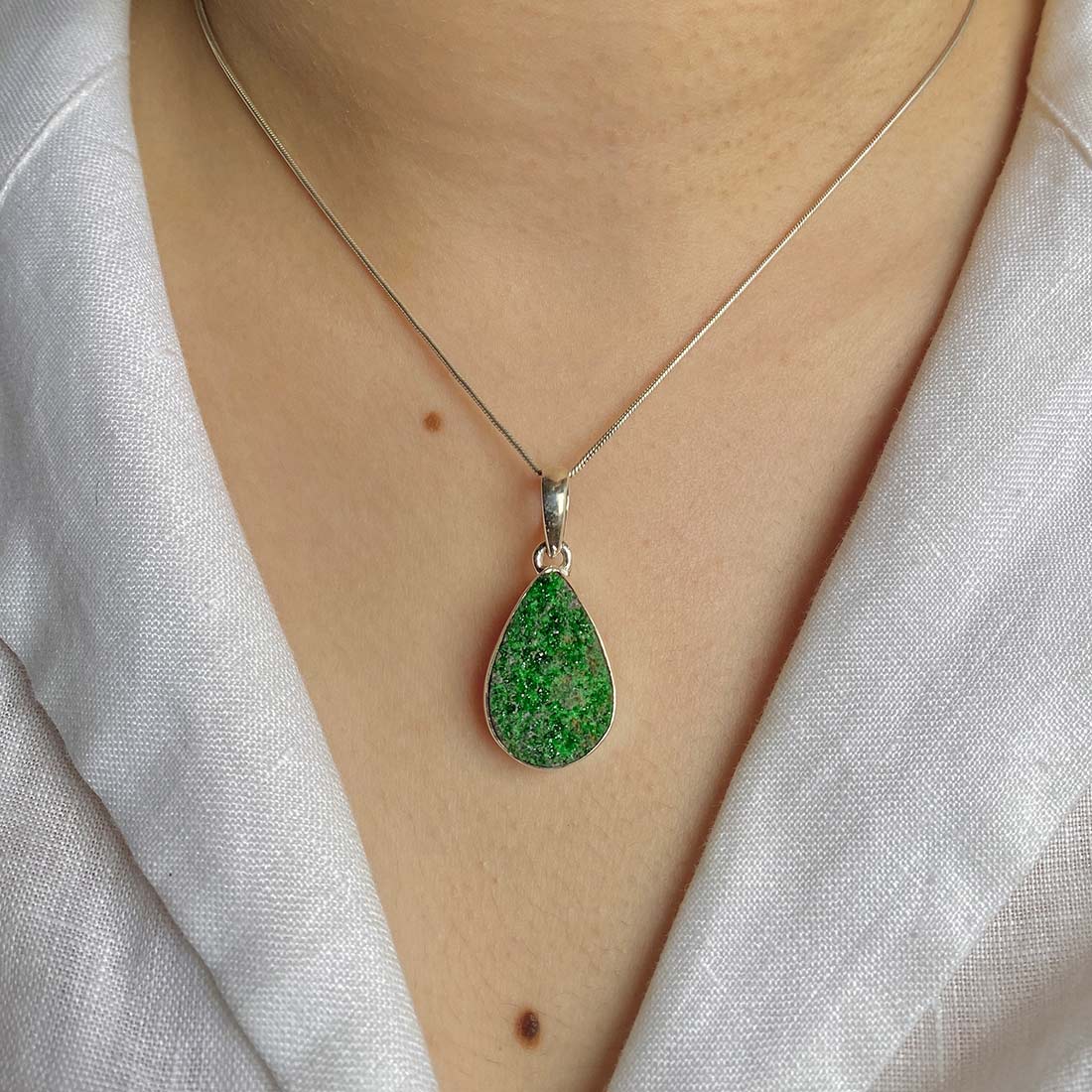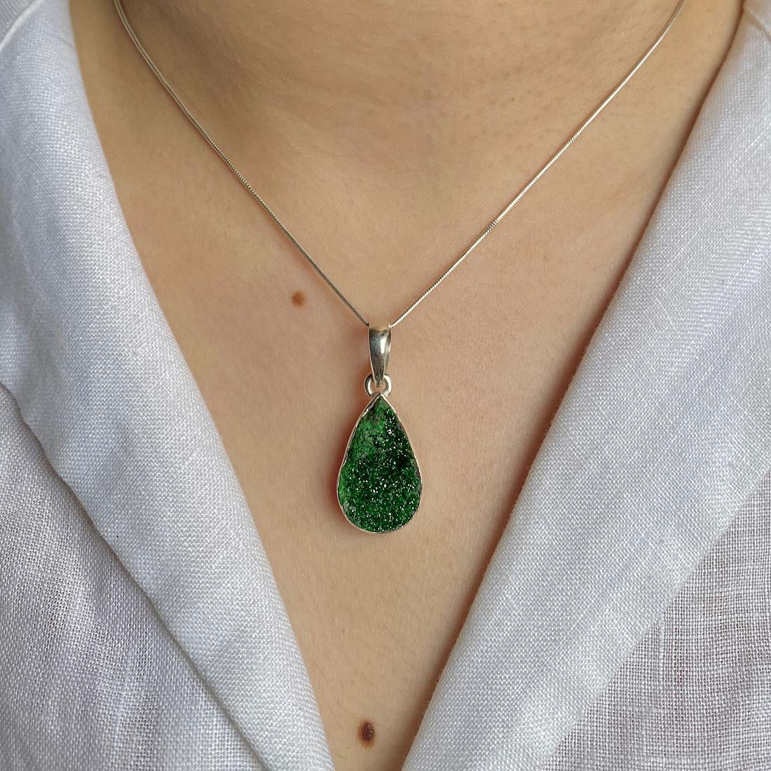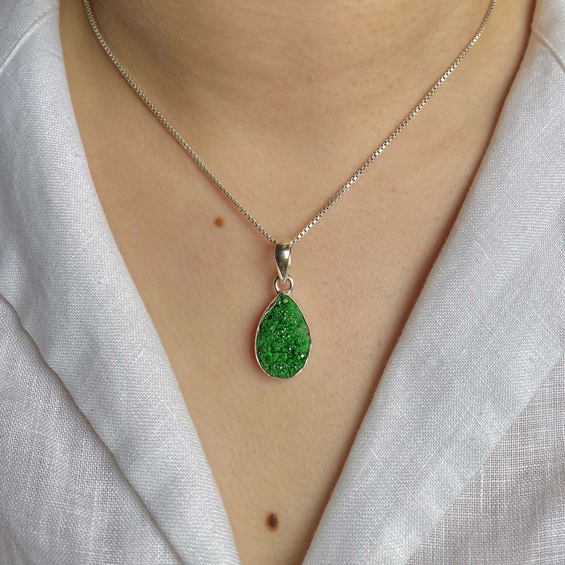 Let’s adorn your statement uvarovite pendant with style. Whether you are looking for a jewelry piece for an office party, a birthday or an anniversary, this enthralling green jewel will set fire on stage. Everywhere, everyone will just roam around to ask where you got this astonishing neckpiece from because it is purely handmade and curated in authentic 925 sterling silver.