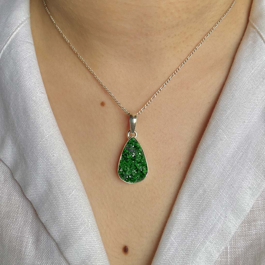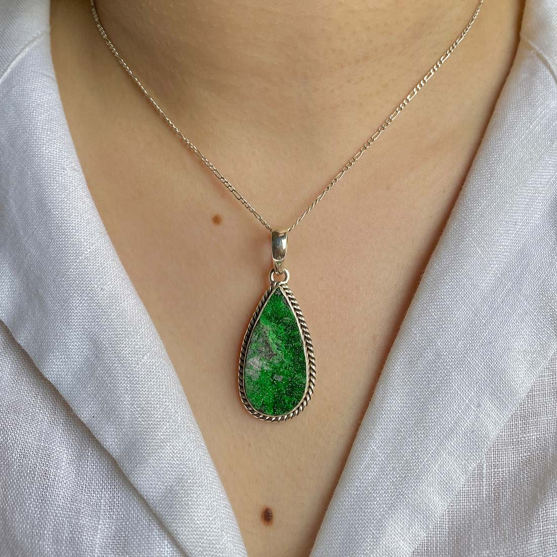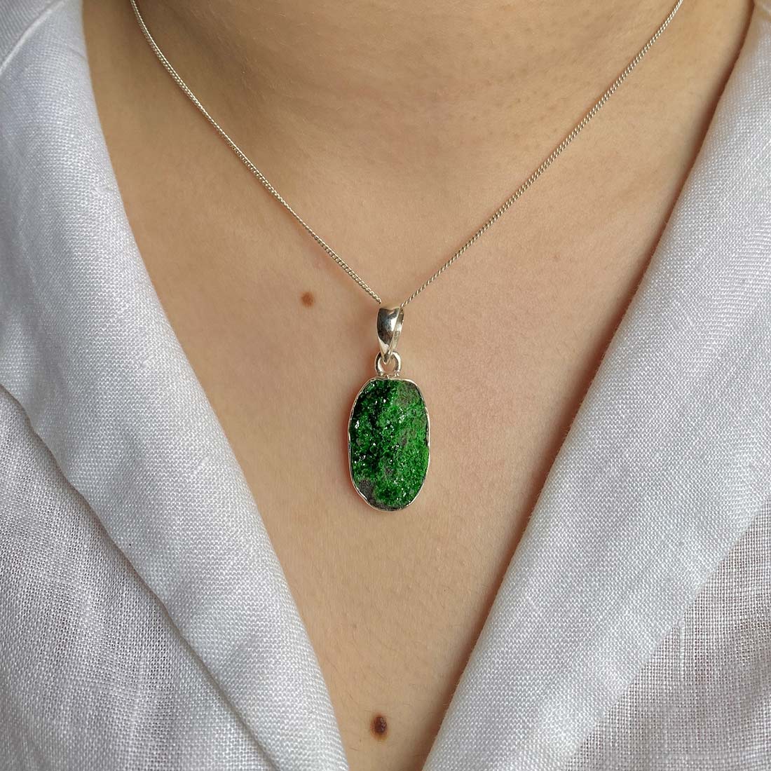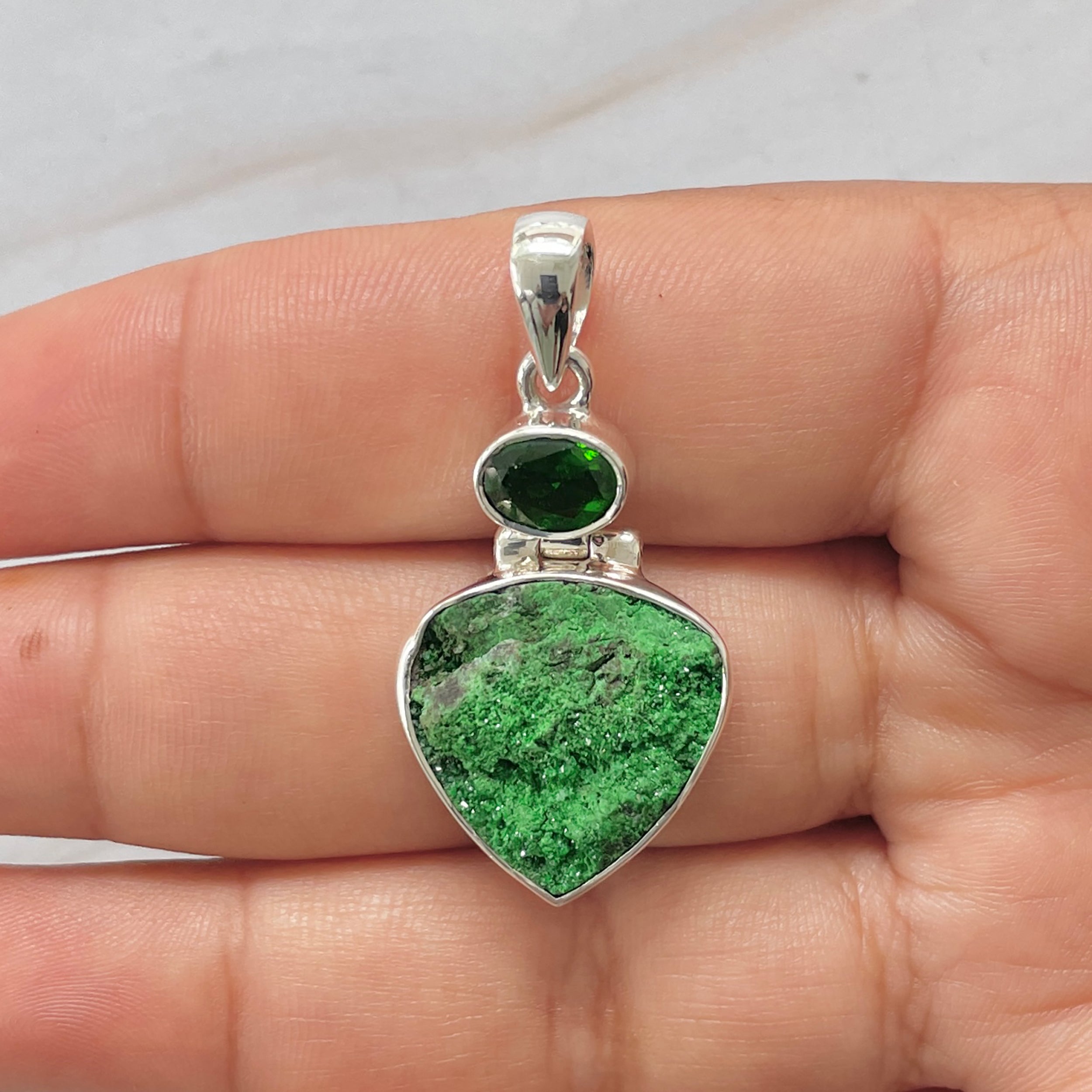 Let’s adorn your statement uvarovite pendant with style. Whether you are looking for a jewelry piece for an office party, a birthday or an anniversary, this enthralling green jewel will set fire on stage. Everywhere, everyone will just roam around to ask where you got this astonishing neckpiece from because it is purely handmade and curated in authentic 925 sterling silver.