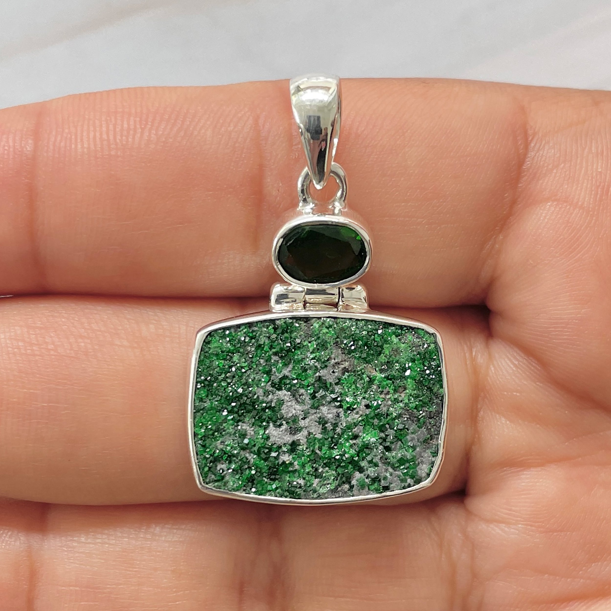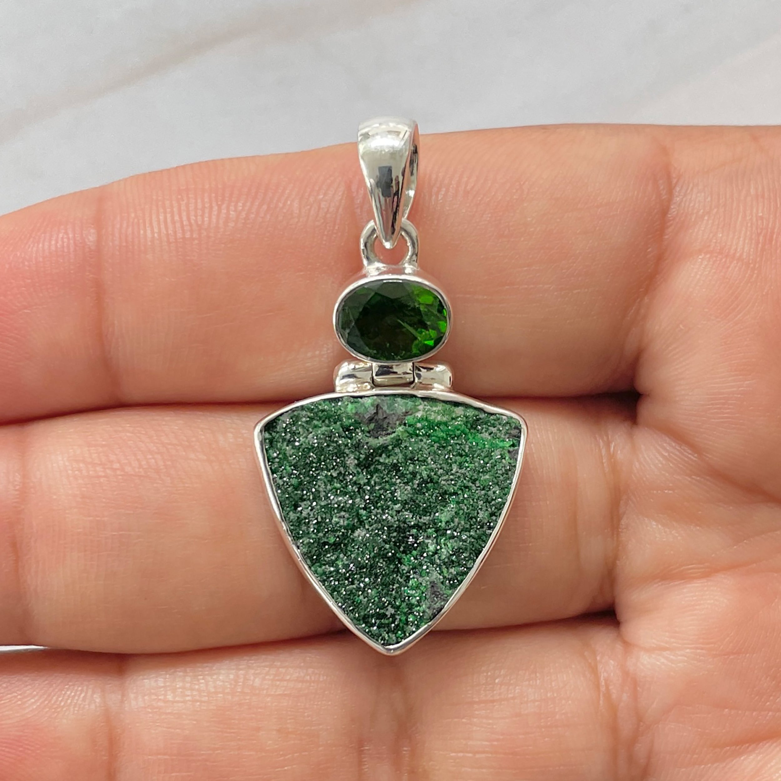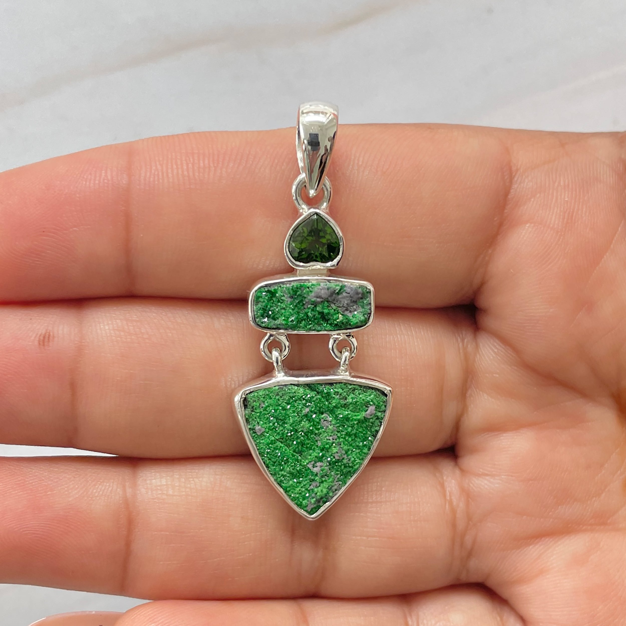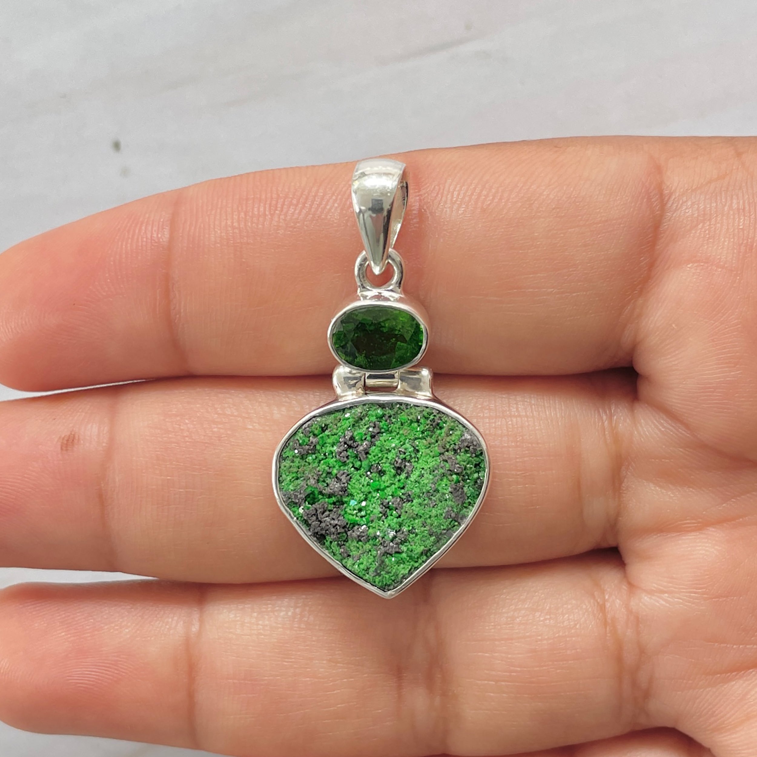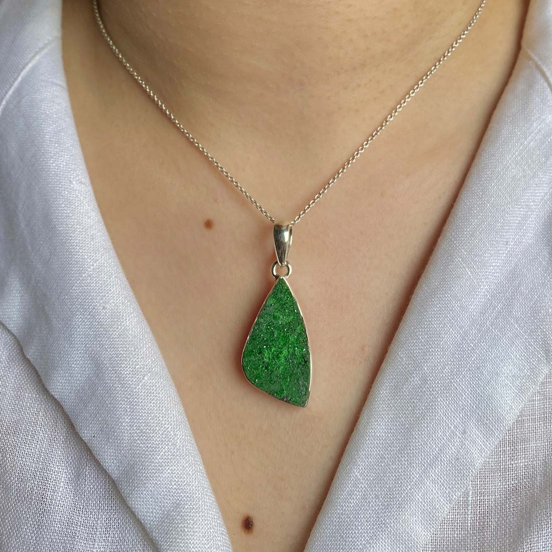 Let’s adorn your statement uvarovite pendant with style. Whether you are looking for a jewelry piece for an office party, a birthday or an anniversary, this enthralling green jewel will set fire on stage. Everywhere, everyone will just roam around to ask where you got this astonishing neckpiece from because it is purely handmade and curated in authentic 925 sterling silver.