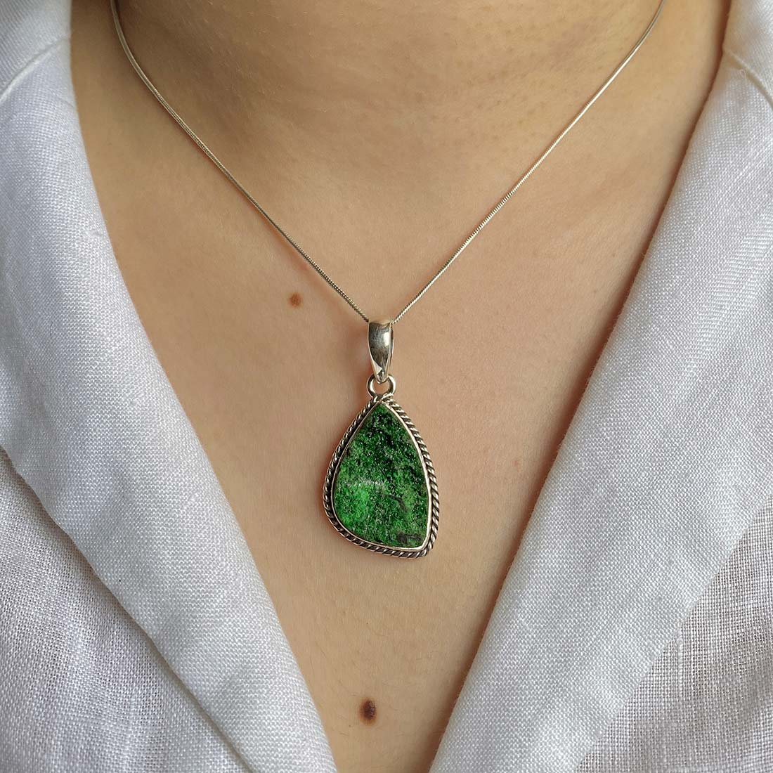 Let’s adorn your statement uvarovite pendant with style. Whether you are looking for a jewelry piece for an office party, a birthday or an anniversary, this enthralling green jewel will set fire on stage. Everywhere, everyone will just roam around to ask where you got this astonishing neckpiece from because it is purely handmade and curated in authentic 925 sterling silver.
