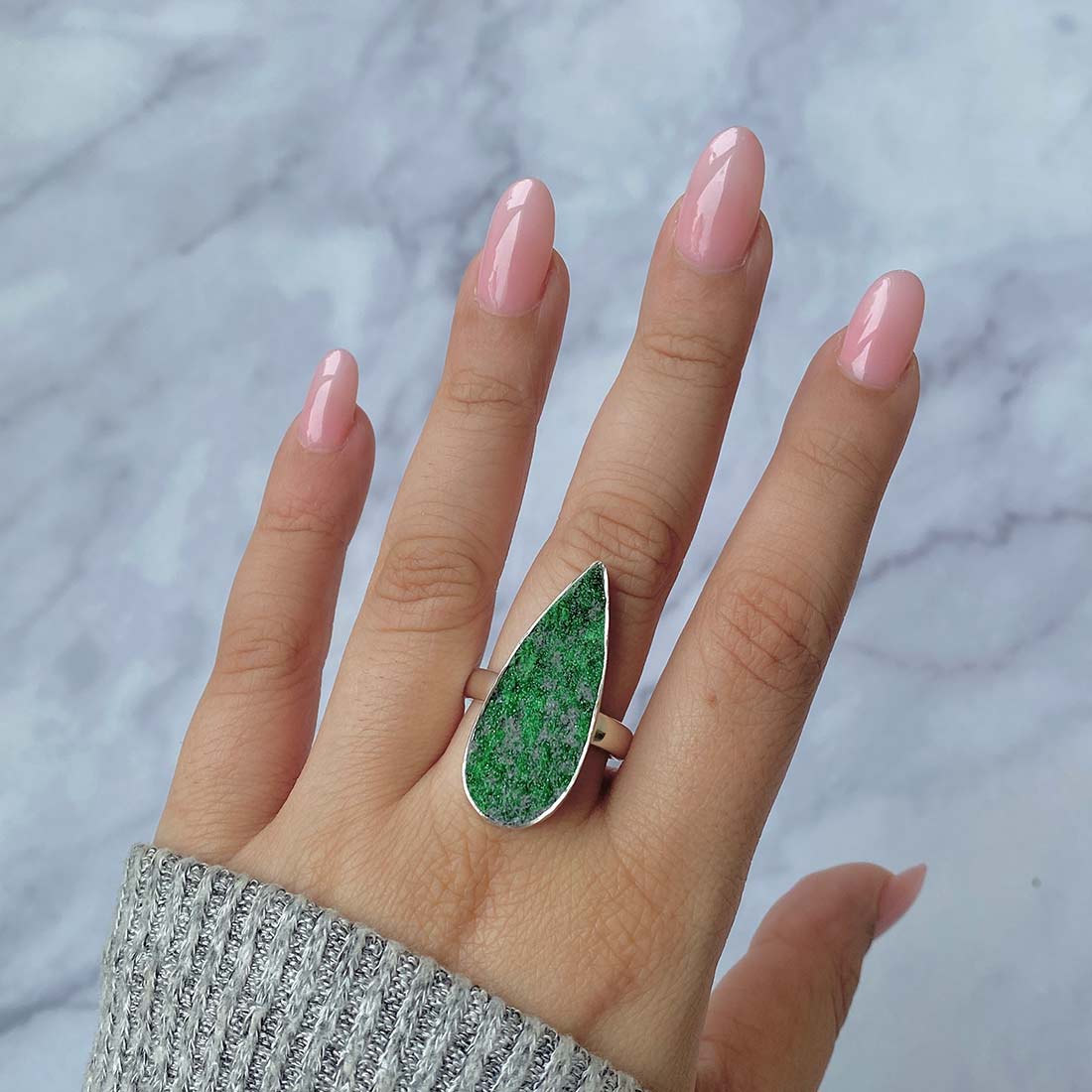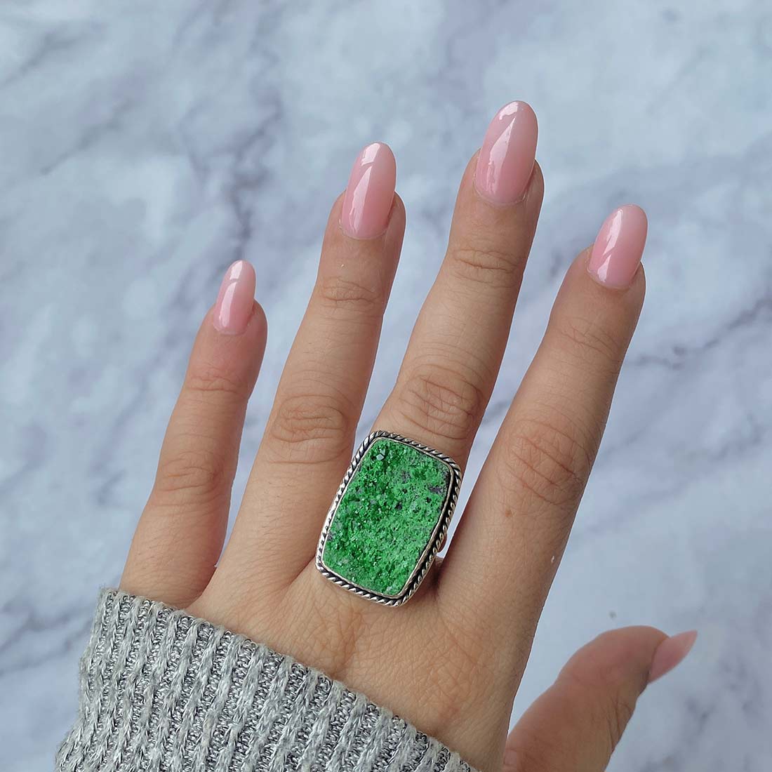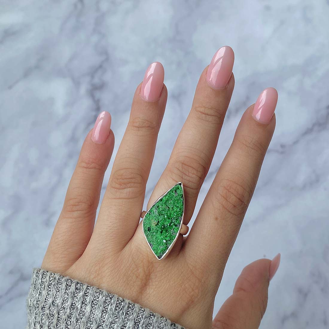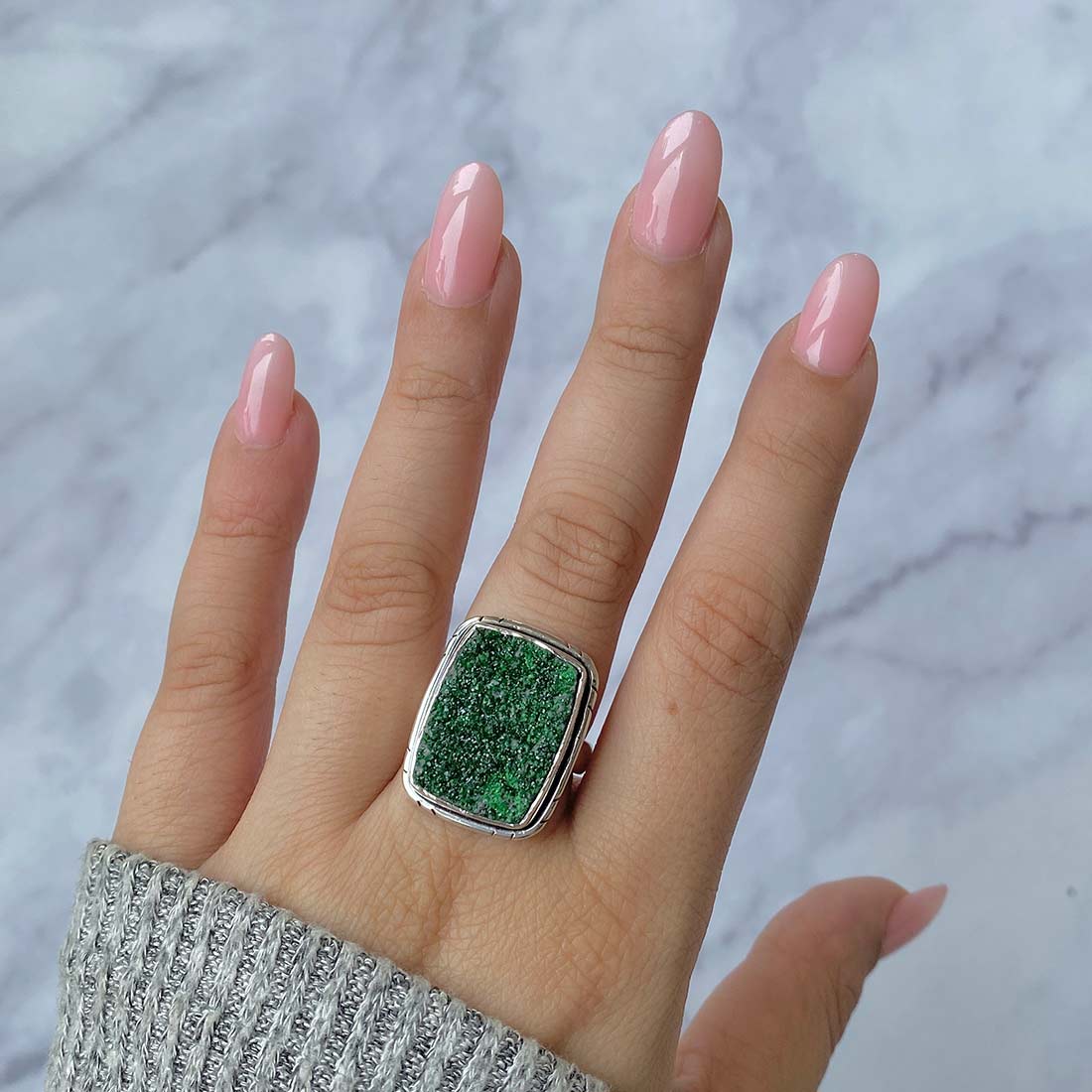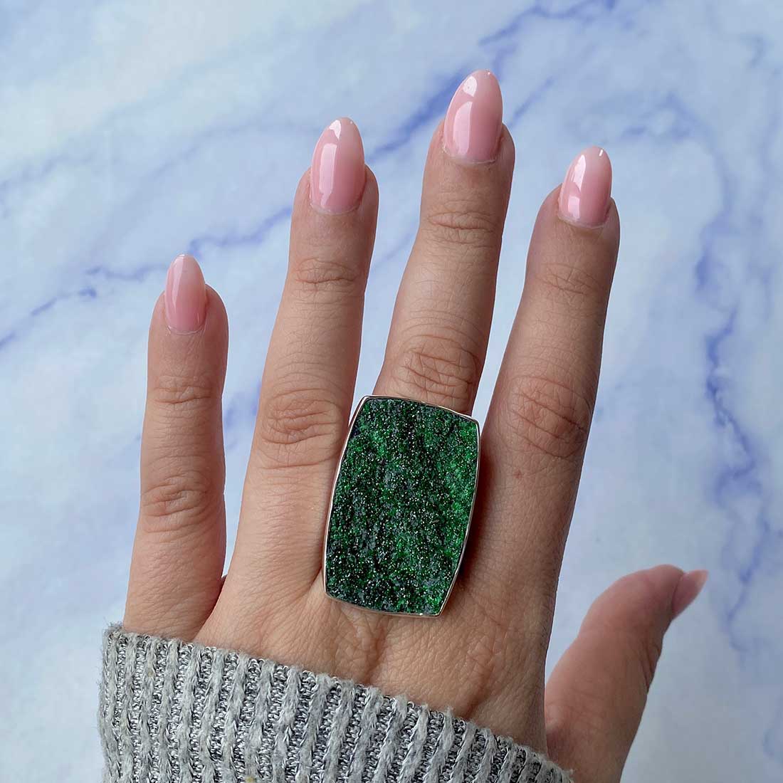Before leaving for an important event, we don't forget to check out ourselves one last time to ensure that we're dressed properly or whether our Jewelry complements our outfit. It signifies how influential Jewelry can be; after all, it's all in the details. Some say shoes or handbags help you make a noticeable arrival, but we beg to differ. Undoubtedly, Jewelry is an essential addition to everyone's wardrobe that lets us accentuate our body features, and pleasingly flaunt them, like wrist, fingers, ears, or neck. If you're also a gem enthusiast, we would love to introduce you a charismatic gemstone, Uvarovite, that can effortlessly create a sumptuous and unique look to reflect the style. Its brilliant emerald green color theme infused within a granulated and Druzy surface makes the exceptional statement Uvarovite rings you can ever desire.