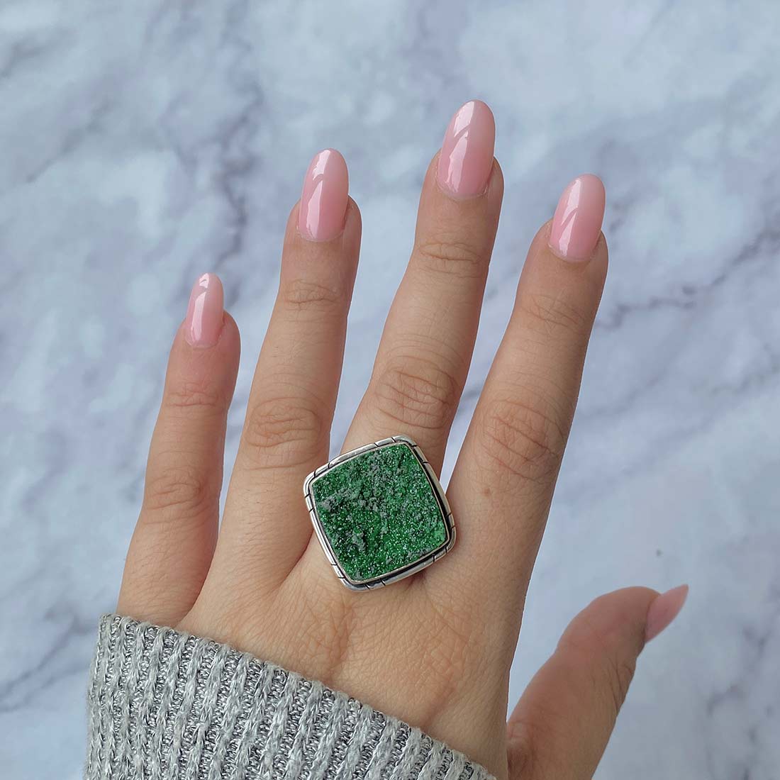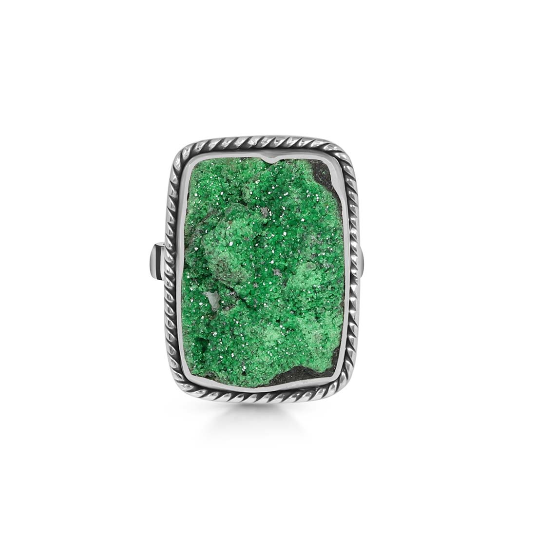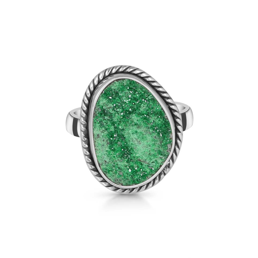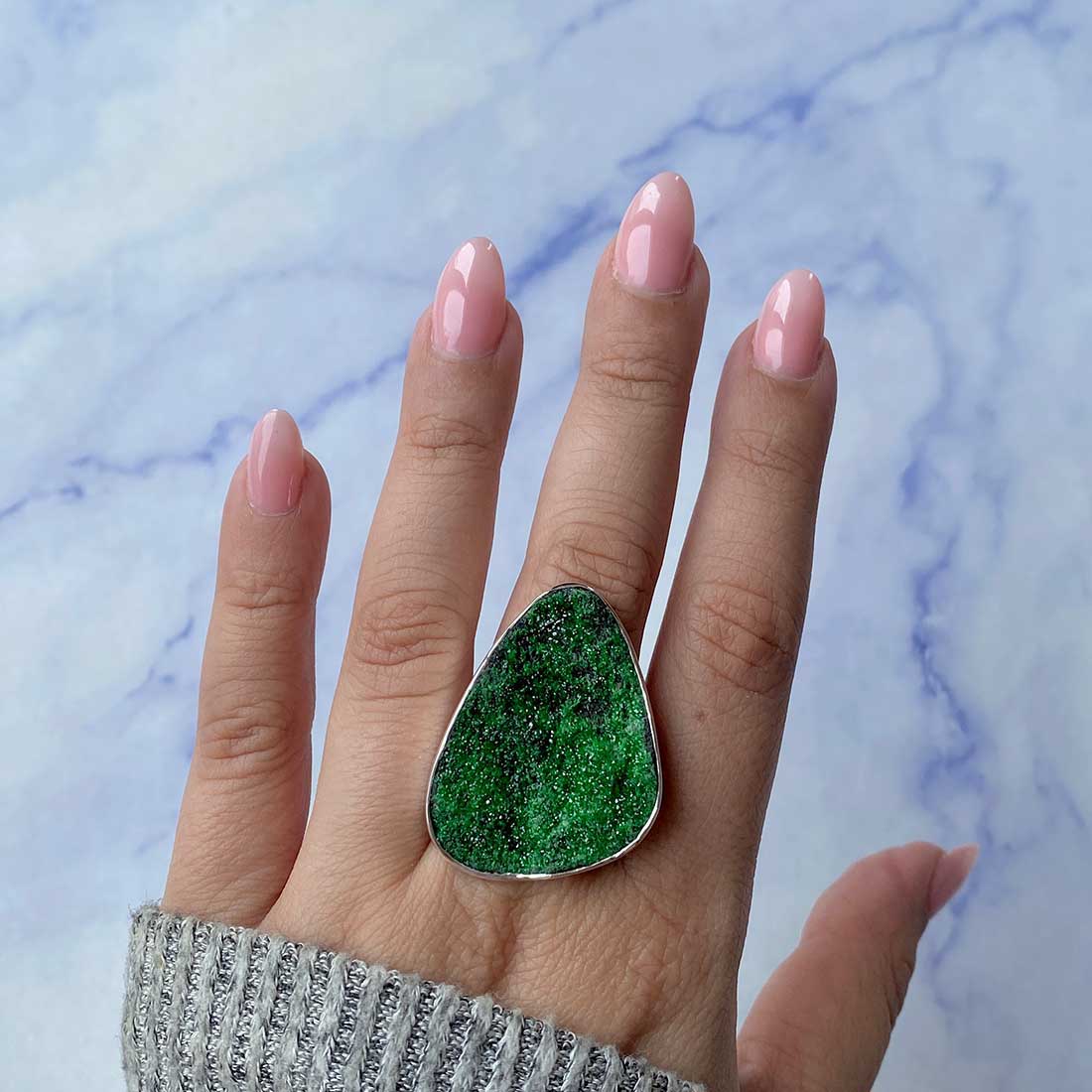 Before leaving for an important event, we don't forget to check out ourselves one last time to ensure that we're dressed properly or whether our Jewelry complements our outfit. It signifies how influential Jewelry can be; after all, it's all in the details. Some say shoes or handbags help you make a noticeable arrival, but we beg to differ. Undoubtedly, Jewelry is an essential addition to everyone's wardrobe that lets us accentuate our body features, and pleasingly flaunt them, like wrist, fingers, ears, or neck. If you're also a gem enthusiast, we would love to introduce you a charismatic gemstone, Uvarovite, that can effortlessly create a sumptuous and unique look to reflect the style. Its brilliant emerald green color theme infused within a granulated and Druzy surface makes the exceptional statement Uvarovite rings you can ever desire.