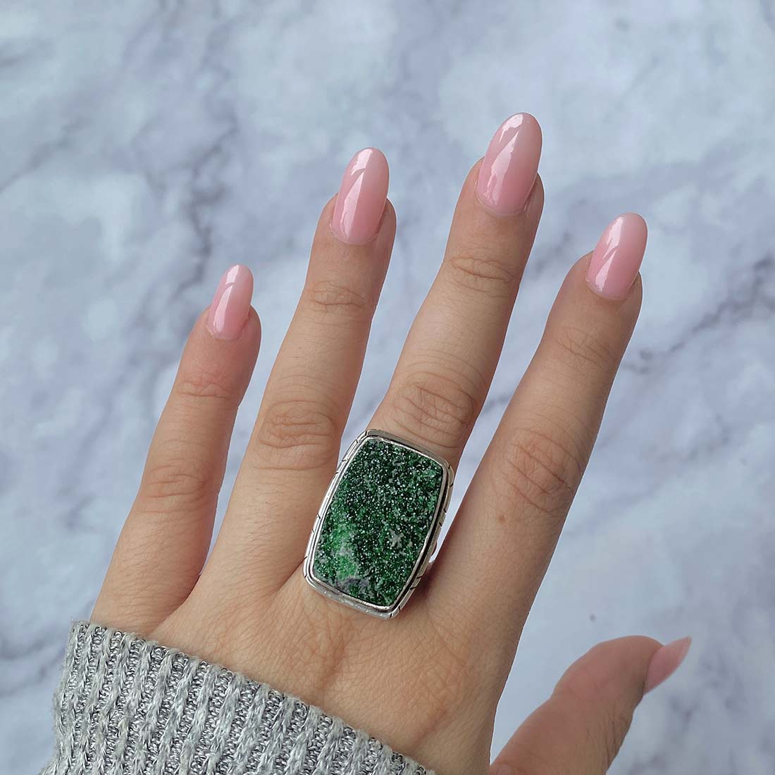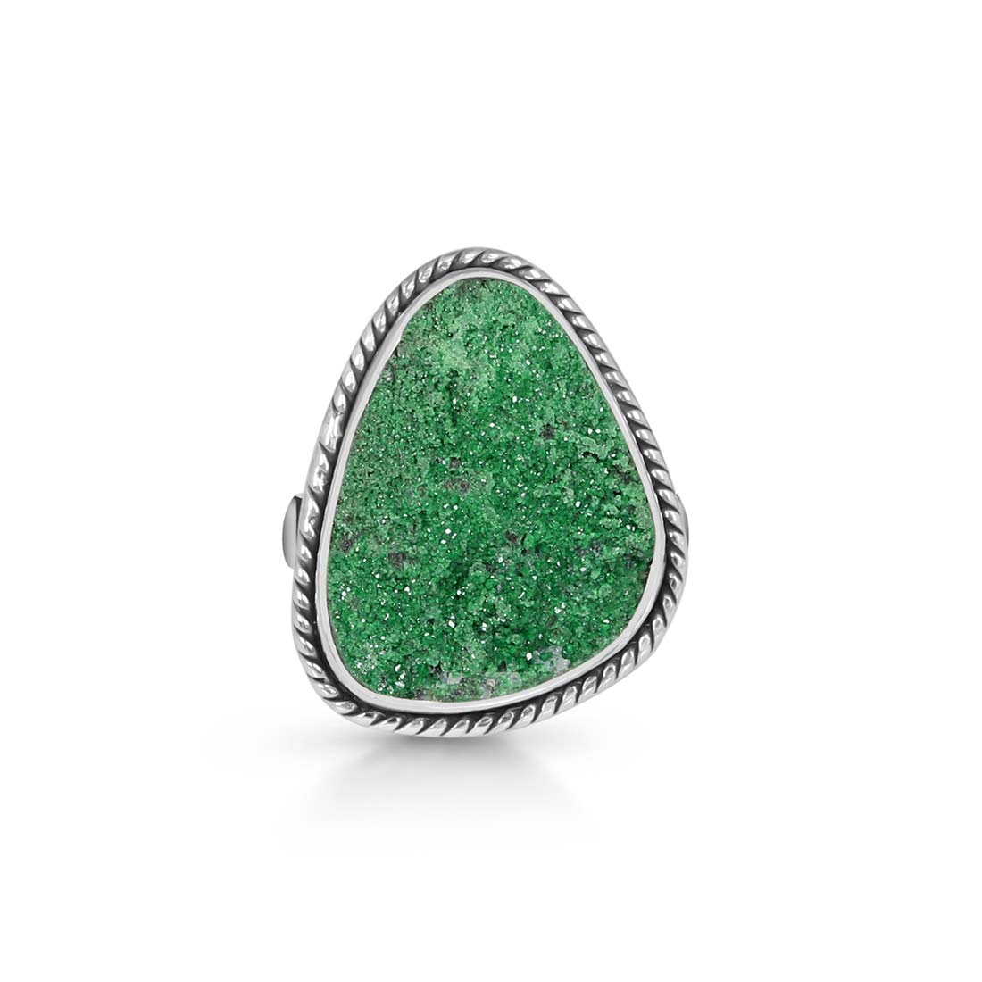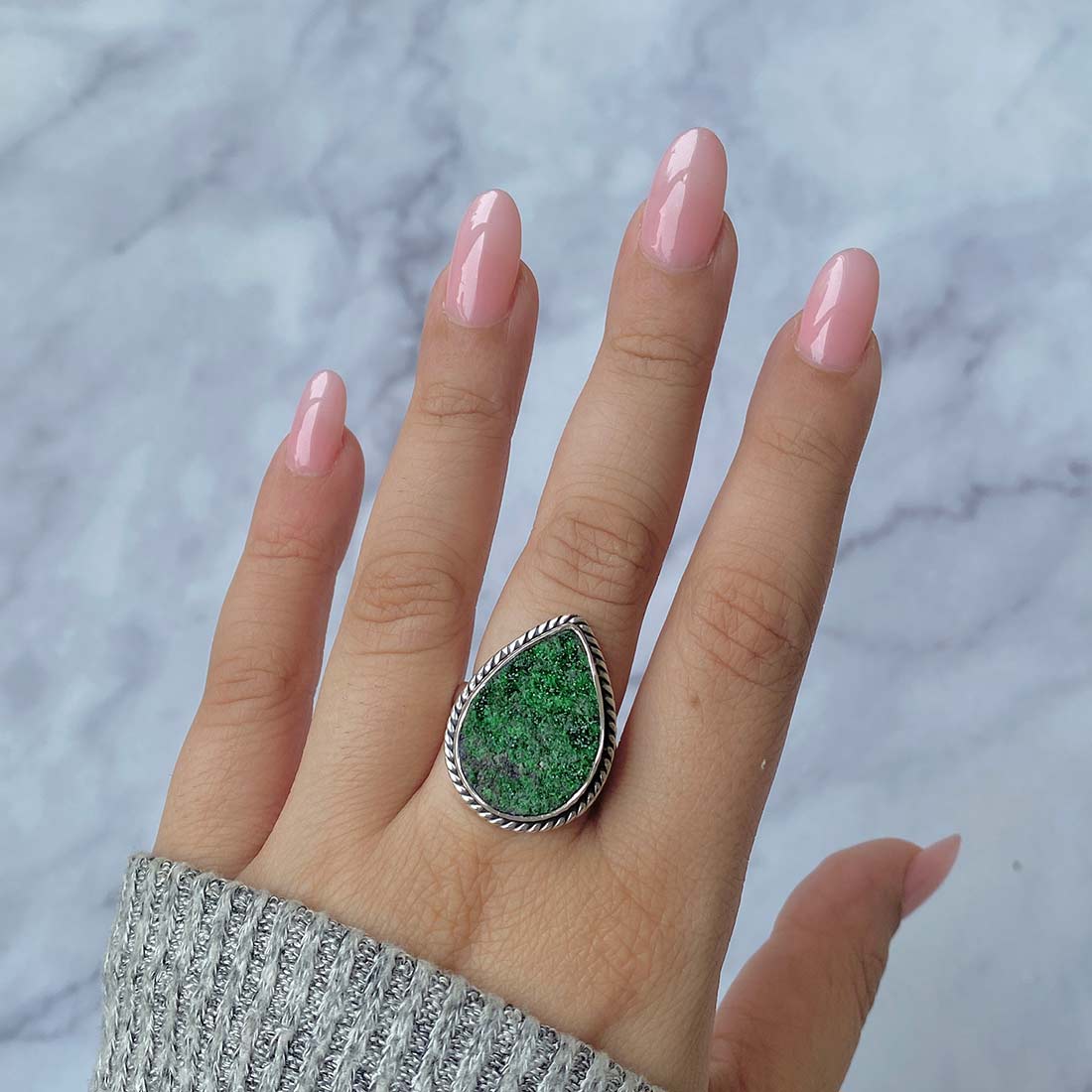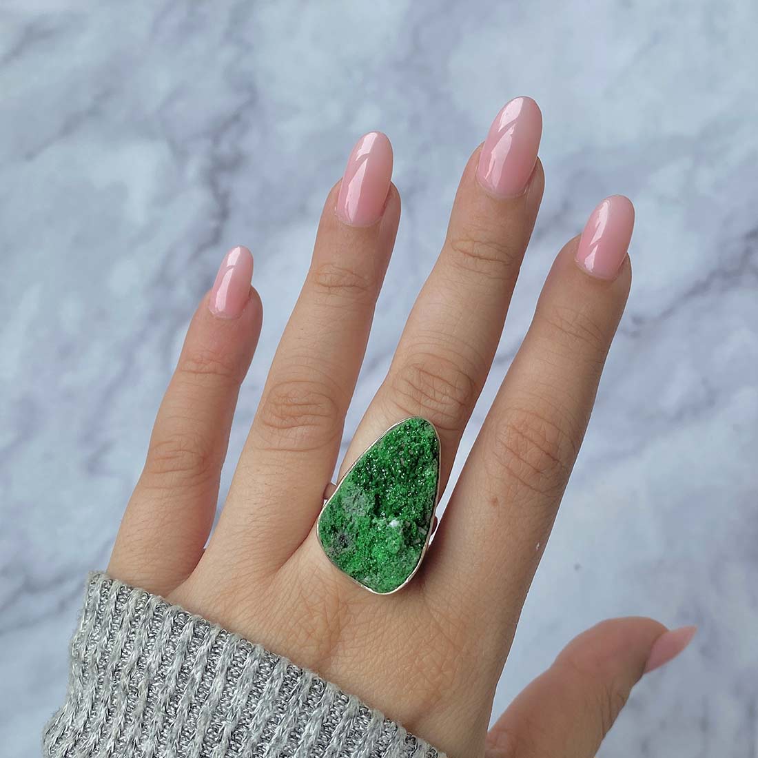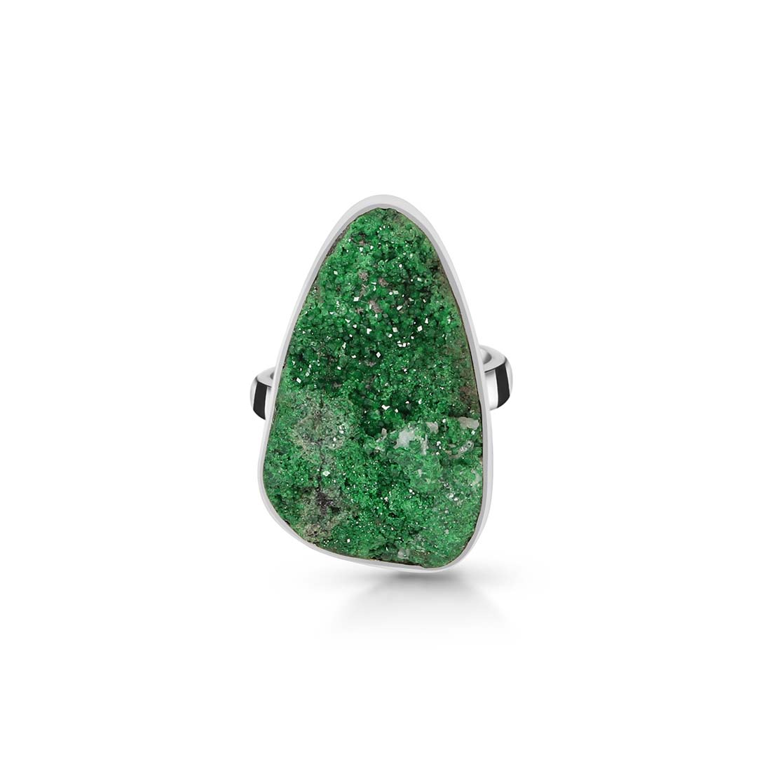 Before leaving for an important event, we don't forget to check out ourselves one last time to ensure that we're dressed properly or whether our Jewelry complements our outfit. It signifies how influential Jewelry can be; after all, it's all in the details. Some say shoes or handbags help you make a noticeable arrival, but we beg to differ. Undoubtedly, Jewelry is an essential addition to everyone's wardrobe that lets us accentuate our body features, and pleasingly flaunt them, like wrist, fingers, ears, or neck. If you're also a gem enthusiast, we would love to introduce you a charismatic gemstone, Uvarovite, that can effortlessly create a sumptuous and unique look to reflect the style. Its brilliant emerald green color theme infused within a granulated and Druzy surface makes the exceptional statement Uvarovite rings you can ever desire.