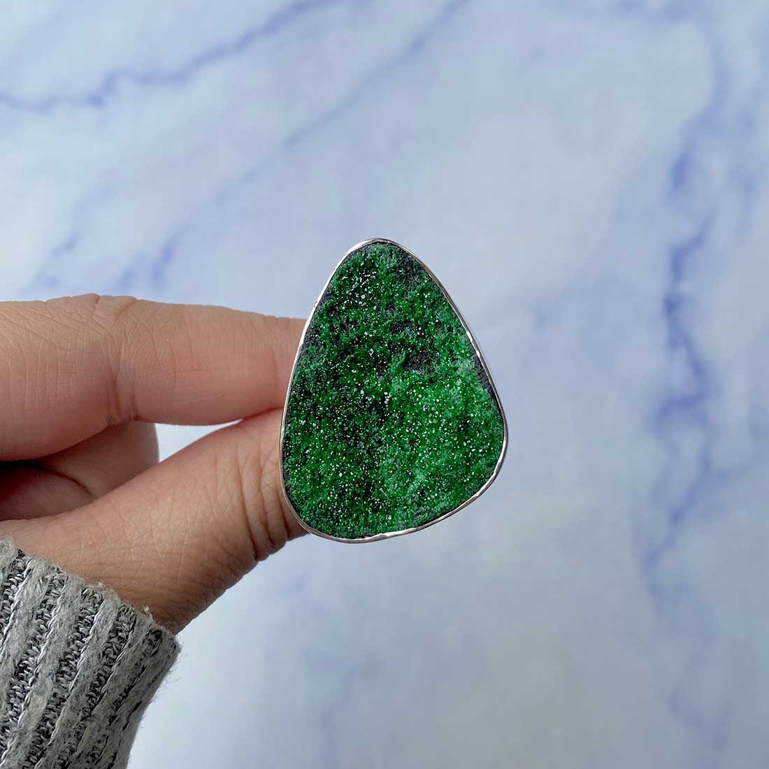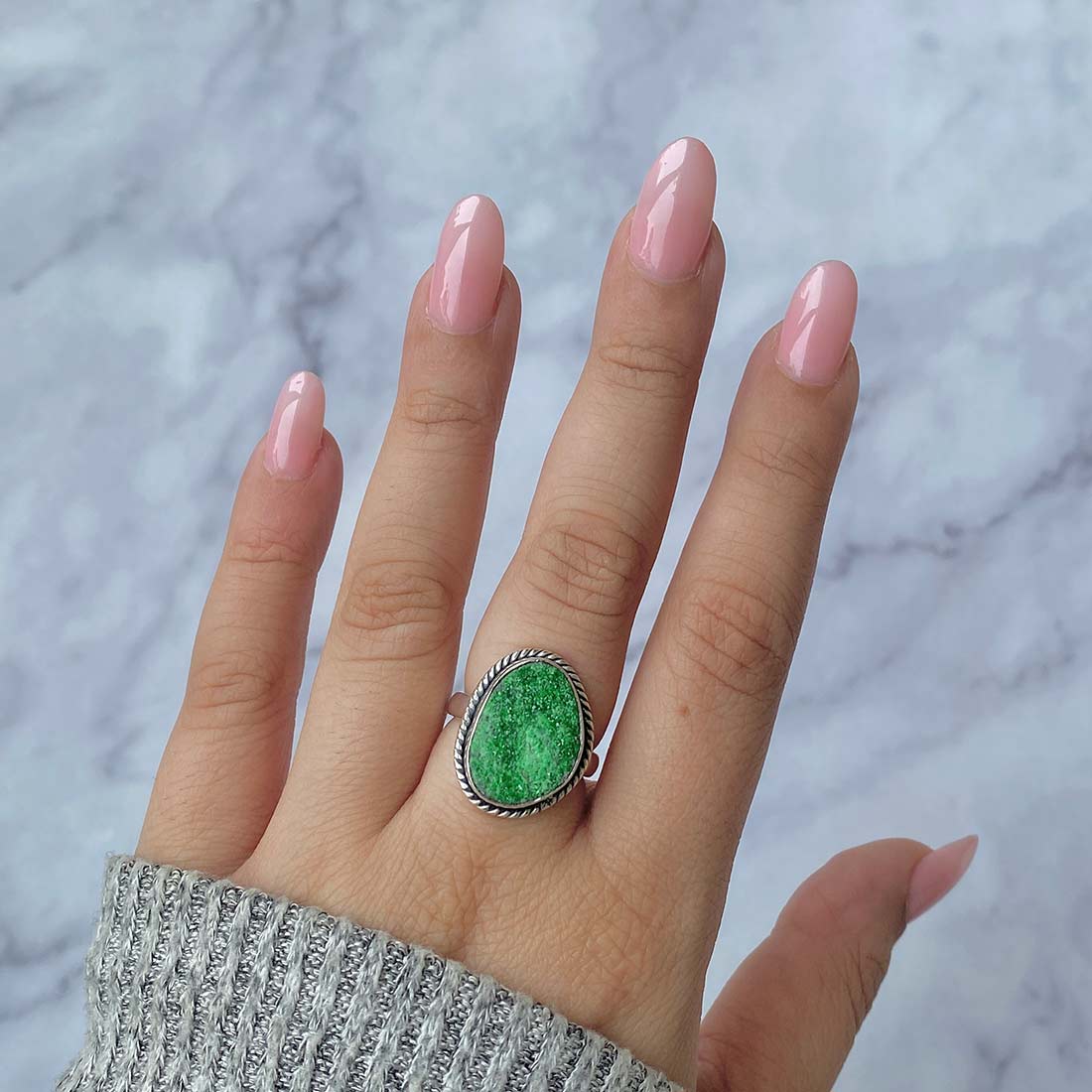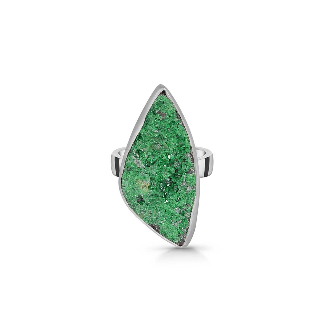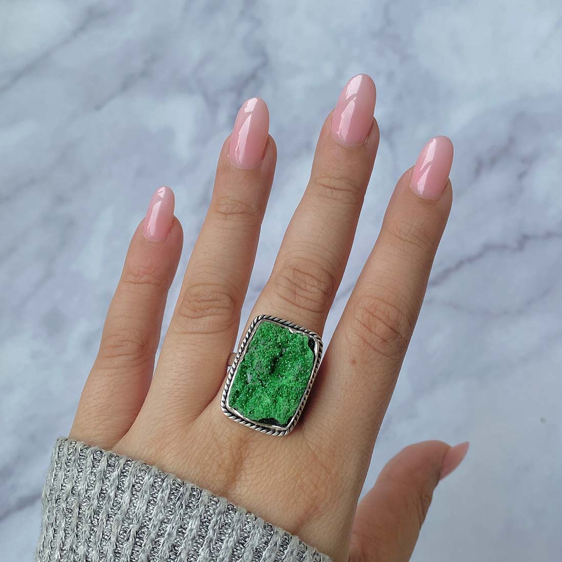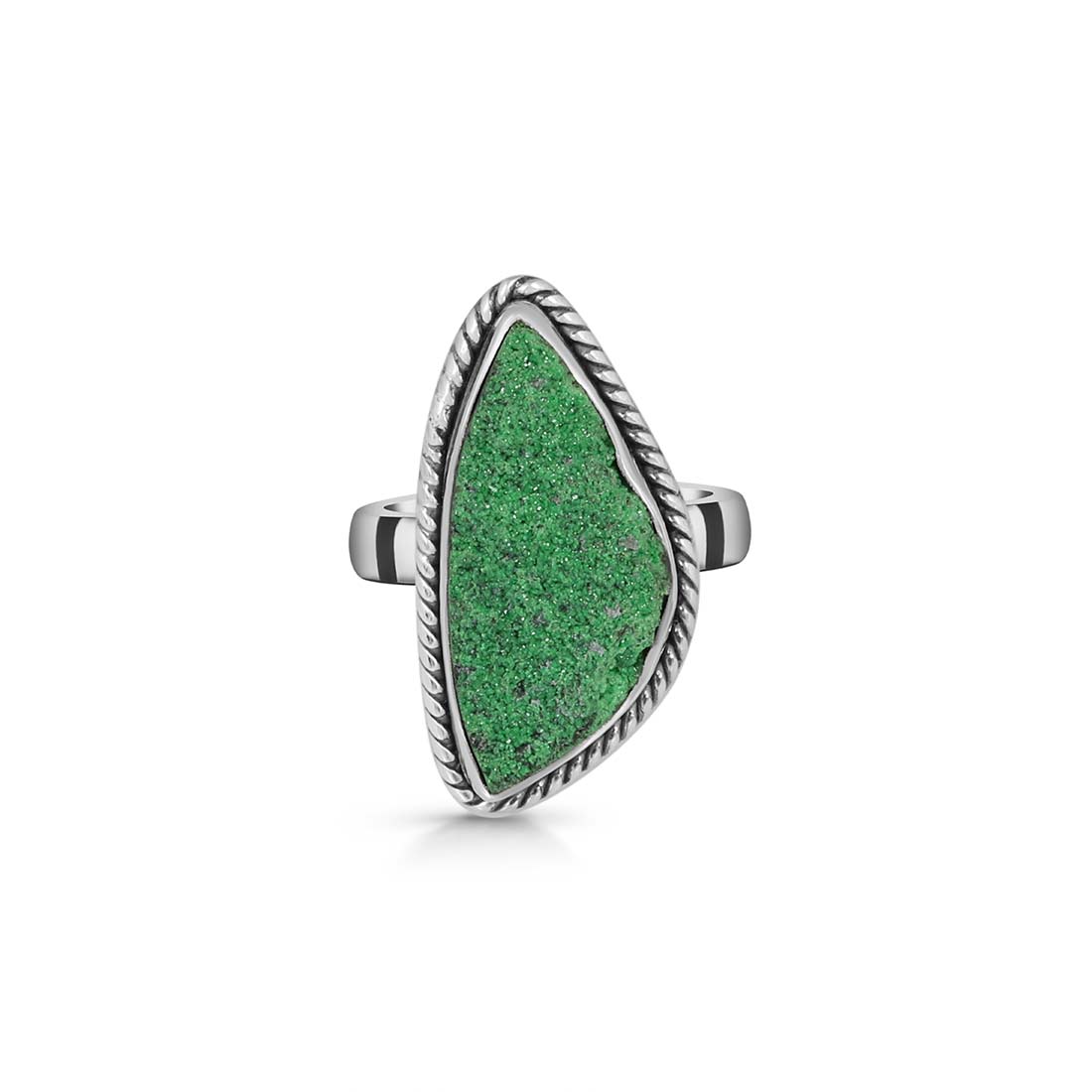 Before leaving for an important event, we don't forget to check out ourselves one last time to ensure that we're dressed properly or whether our Jewelry complements our outfit. It signifies how influential Jewelry can be; after all, it's all in the details. Some say shoes or handbags help you make a noticeable arrival, but we beg to differ. Undoubtedly, Jewelry is an essential addition to everyone's wardrobe that lets us accentuate our body features, and pleasingly flaunt them, like wrist, fingers, ears, or neck. If you're also a gem enthusiast, we would love to introduce you a charismatic gemstone, Uvarovite, that can effortlessly create a sumptuous and unique look to reflect the style. Its brilliant emerald green color theme infused within a granulated and Druzy surface makes the exceptional statement Uvarovite rings you can ever desire.