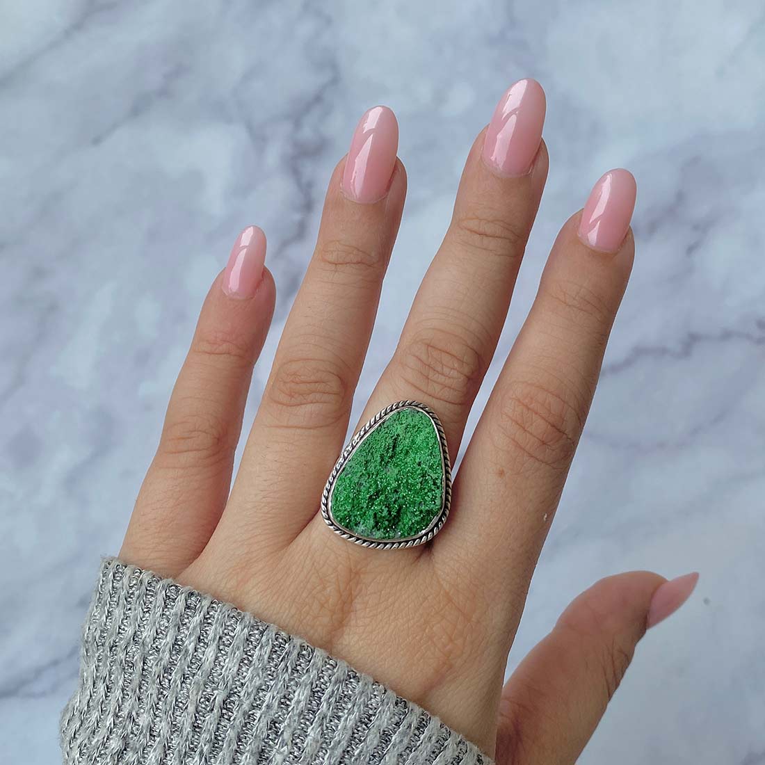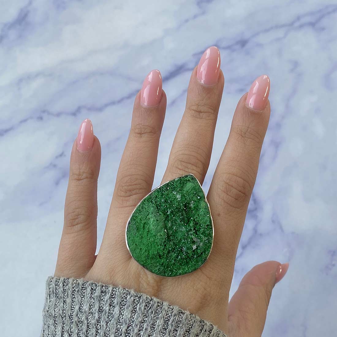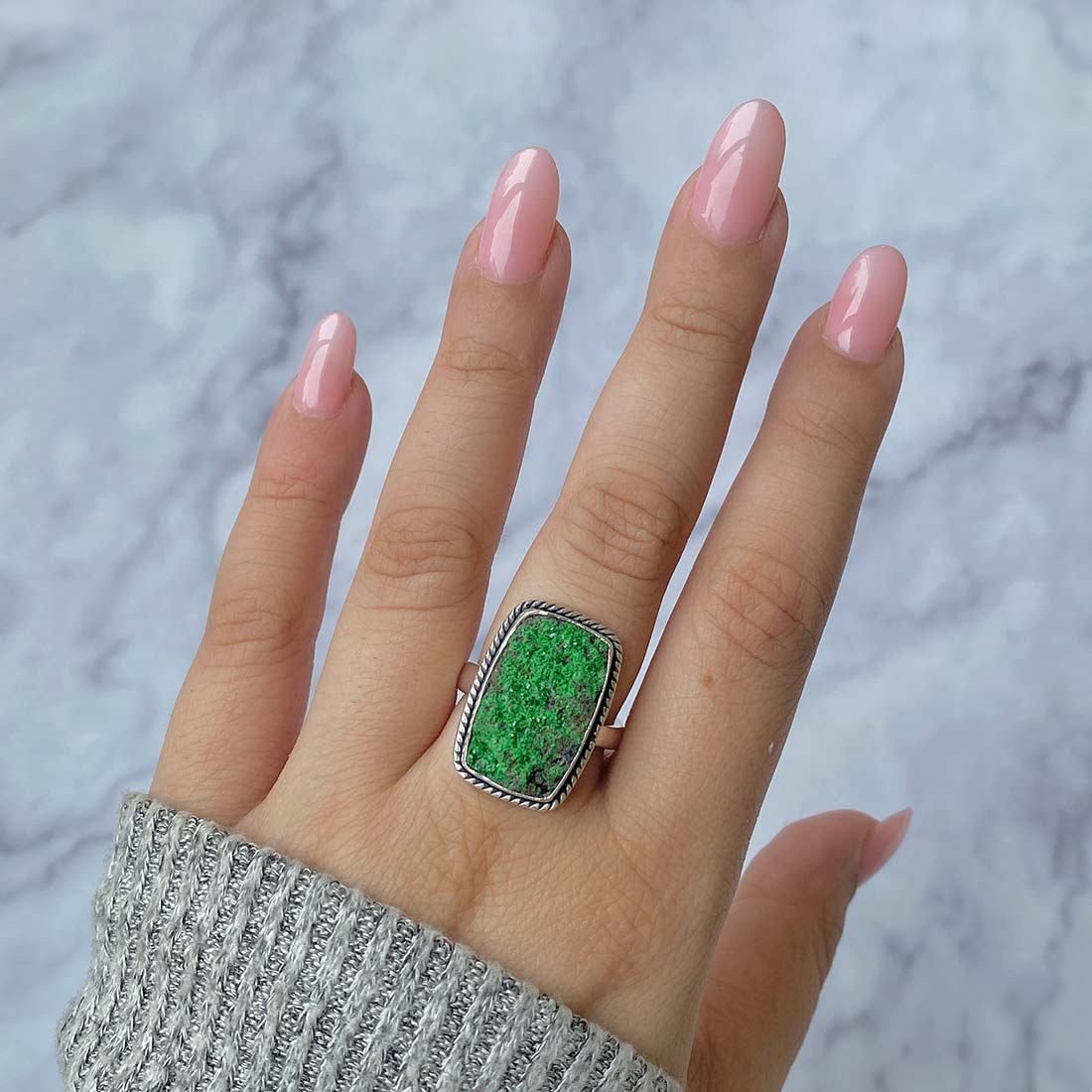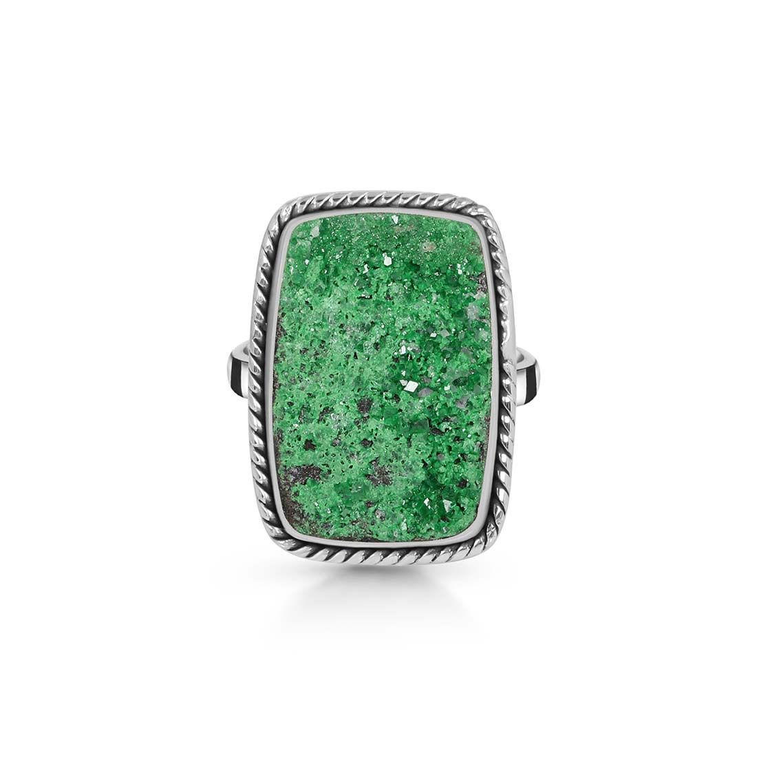 Before leaving for an important event, we don't forget to check out ourselves one last time to ensure that we're dressed properly or whether our Jewelry complements our outfit. It signifies how influential Jewelry can be; after all, it's all in the details. Some say shoes or handbags help you make a noticeable arrival, but we beg to differ. Undoubtedly, Jewelry is an essential addition to everyone's wardrobe that lets us accentuate our body features, and pleasingly flaunt them, like wrist, fingers, ears, or neck. If you're also a gem enthusiast, we would love to introduce you a charismatic gemstone, Uvarovite, that can effortlessly create a sumptuous and unique look to reflect the style. Its brilliant emerald green color theme infused within a granulated and Druzy surface makes the exceptional statement Uvarovite rings you can ever desire.