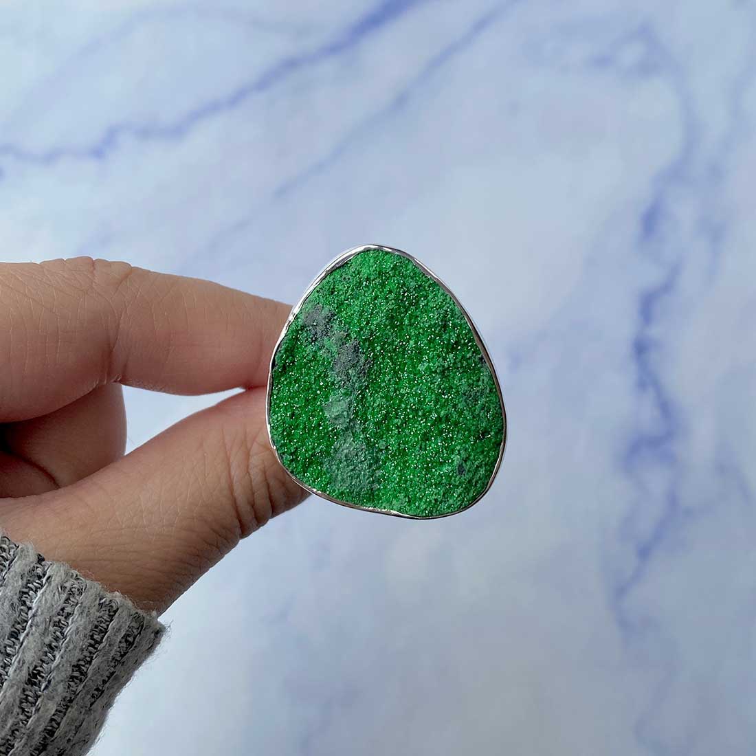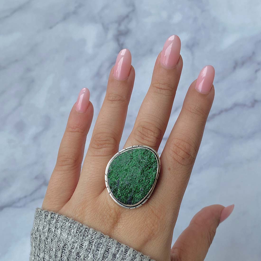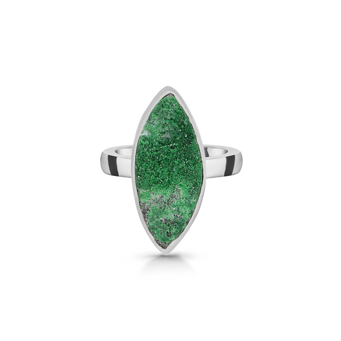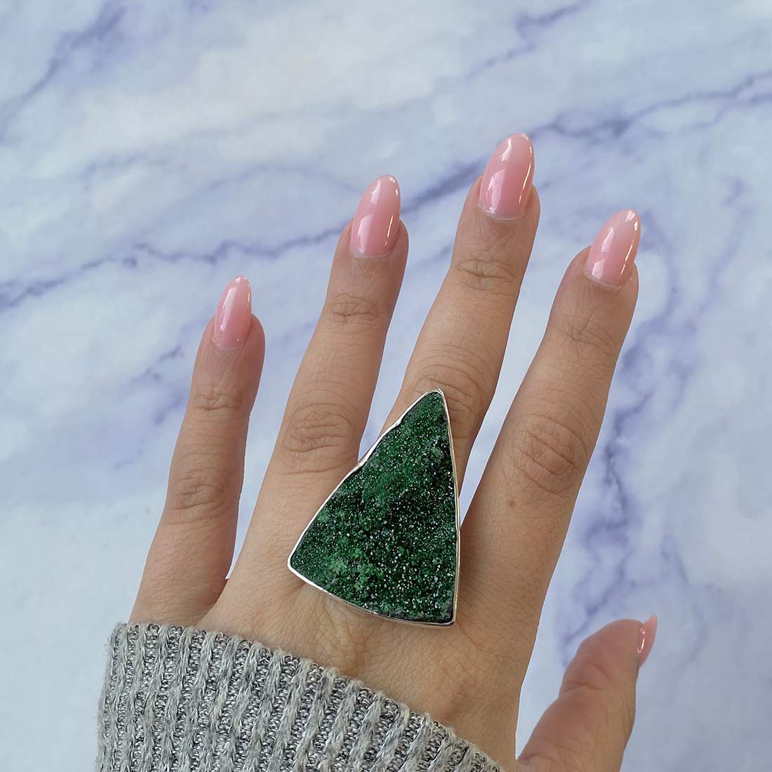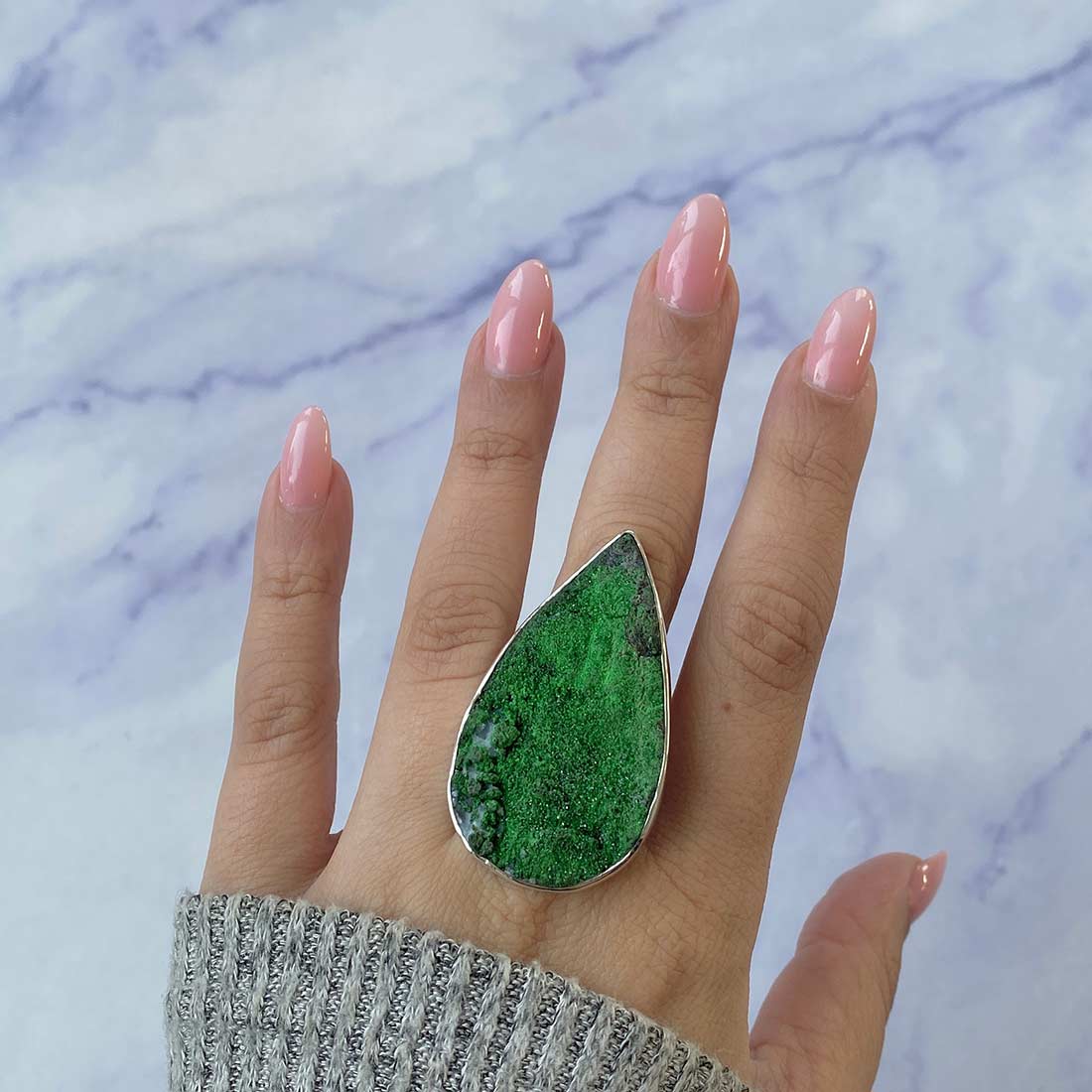 Before leaving for an important event, we don't forget to check out ourselves one last time to ensure that we're dressed properly or whether our Jewelry complements our outfit. It signifies how influential Jewelry can be; after all, it's all in the details. Some say shoes or handbags help you make a noticeable arrival, but we beg to differ. Undoubtedly, Jewelry is an essential addition to everyone's wardrobe that lets us accentuate our body features, and pleasingly flaunt them, like wrist, fingers, ears, or neck. If you're also a gem enthusiast, we would love to introduce you a charismatic gemstone, Uvarovite, that can effortlessly create a sumptuous and unique look to reflect the style. Its brilliant emerald green color theme infused within a granulated and Druzy surface makes the exceptional statement Uvarovite rings you can ever desire.