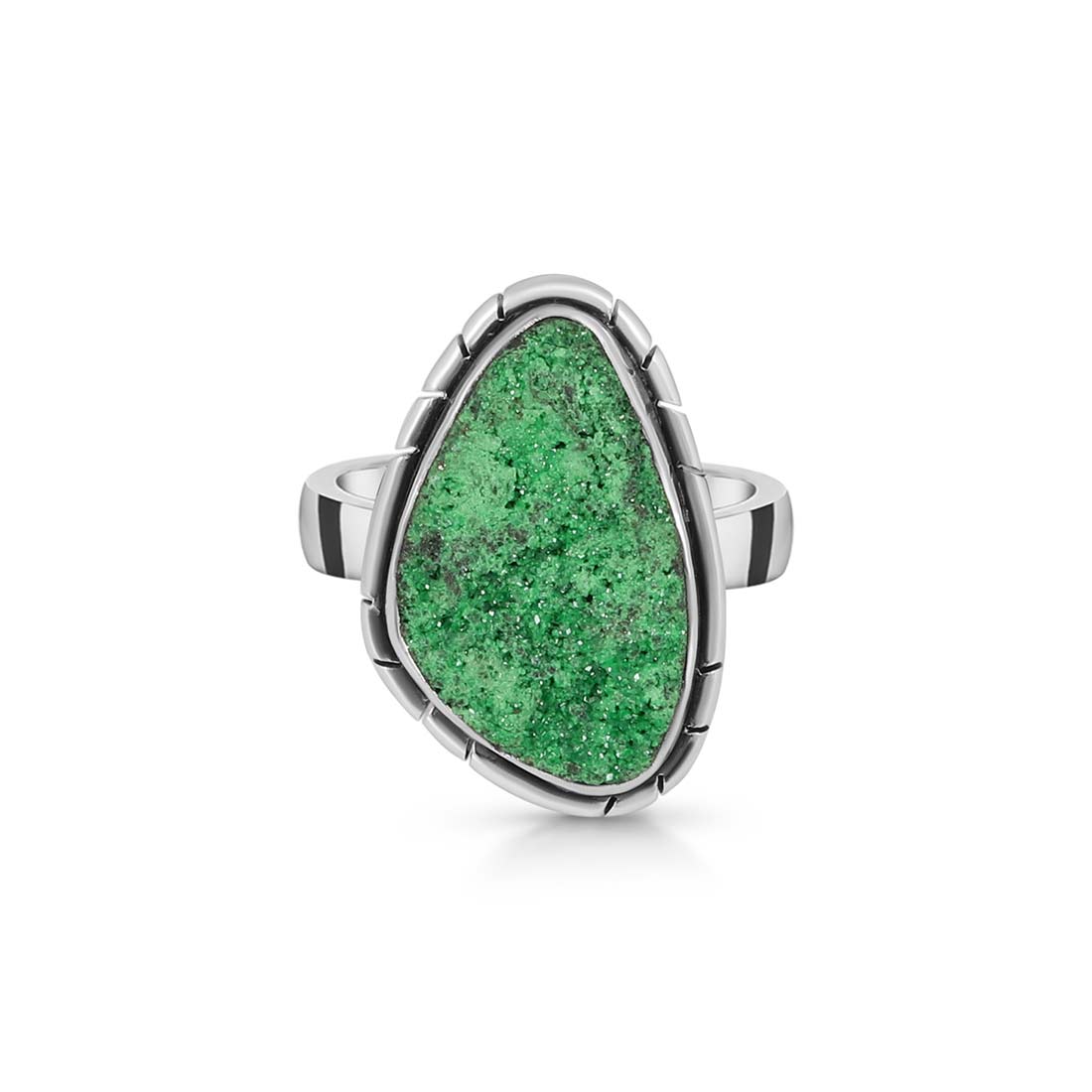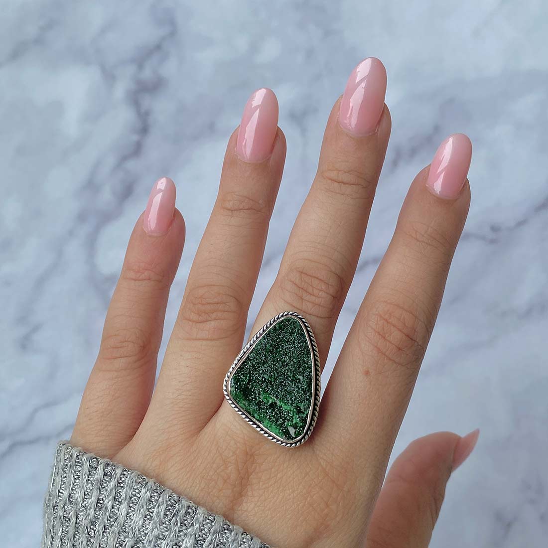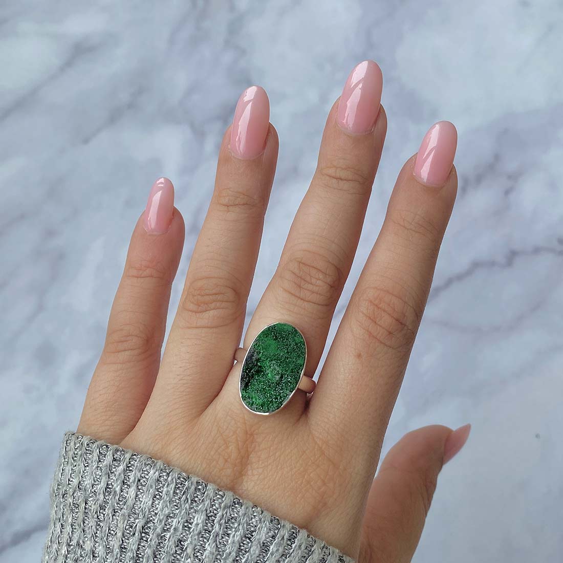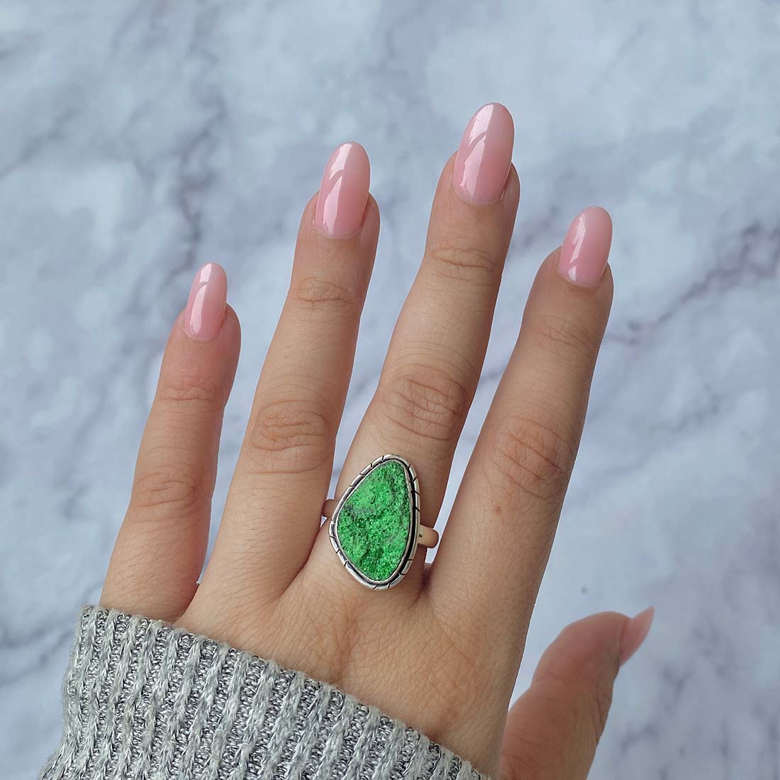 Before leaving for an important event, we don't forget to check out ourselves one last time to ensure that we're dressed properly or whether our Jewelry complements our outfit. It signifies how influential Jewelry can be; after all, it's all in the details. Some say shoes or handbags help you make a noticeable arrival, but we beg to differ. Undoubtedly, Jewelry is an essential addition to everyone's wardrobe that lets us accentuate our body features, and pleasingly flaunt them, like wrist, fingers, ears, or neck. If you're also a gem enthusiast, we would love to introduce you a charismatic gemstone, Uvarovite, that can effortlessly create a sumptuous and unique look to reflect the style. Its brilliant emerald green color theme infused within a granulated and Druzy surface makes the exceptional statement Uvarovite rings you can ever desire.