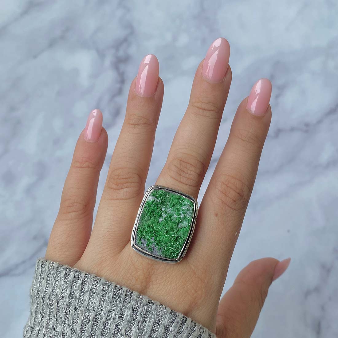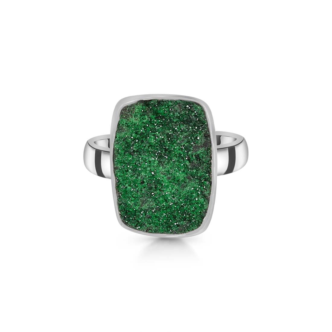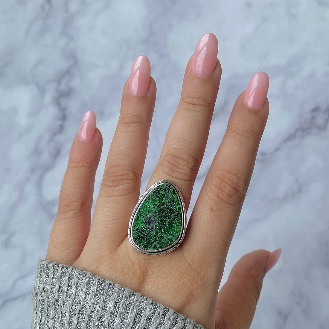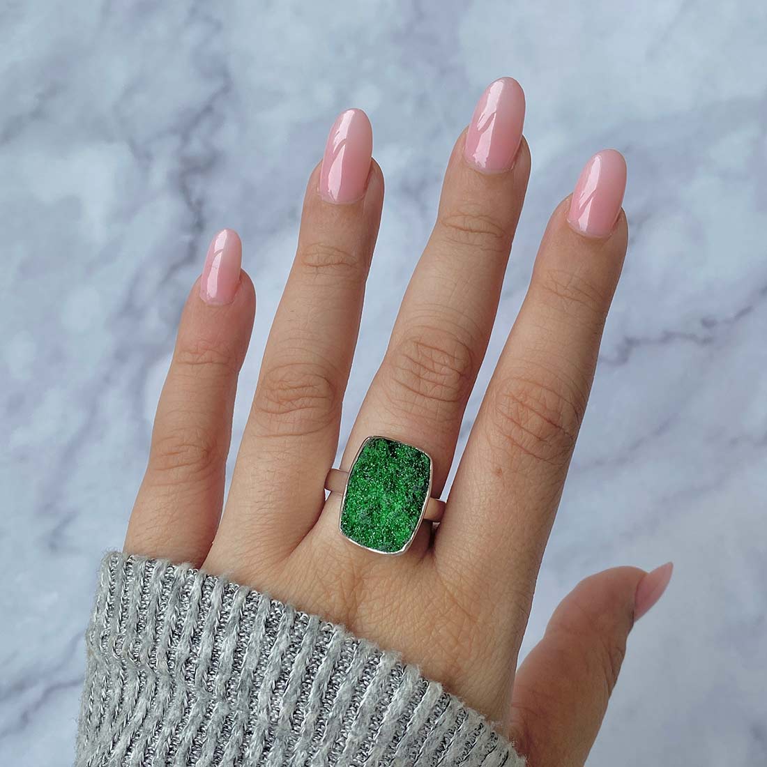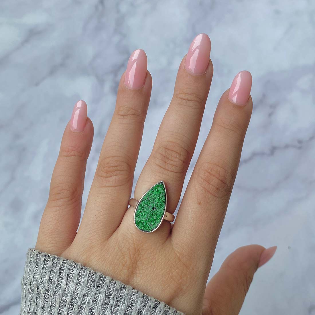 Before leaving for an important event, we don't forget to check out ourselves one last time to ensure that we're dressed properly or whether our Jewelry complements our outfit. It signifies how influential Jewelry can be; after all, it's all in the details. Some say shoes or handbags help you make a noticeable arrival, but we beg to differ. Undoubtedly, Jewelry is an essential addition to everyone's wardrobe that lets us accentuate our body features, and pleasingly flaunt them, like wrist, fingers, ears, or neck. If you're also a gem enthusiast, we would love to introduce you a charismatic gemstone, Uvarovite, that can effortlessly create a sumptuous and unique look to reflect the style. Its brilliant emerald green color theme infused within a granulated and Druzy surface makes the exceptional statement Uvarovite rings you can ever desire.
