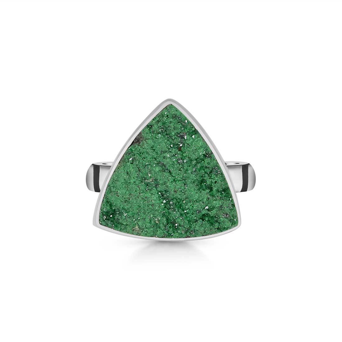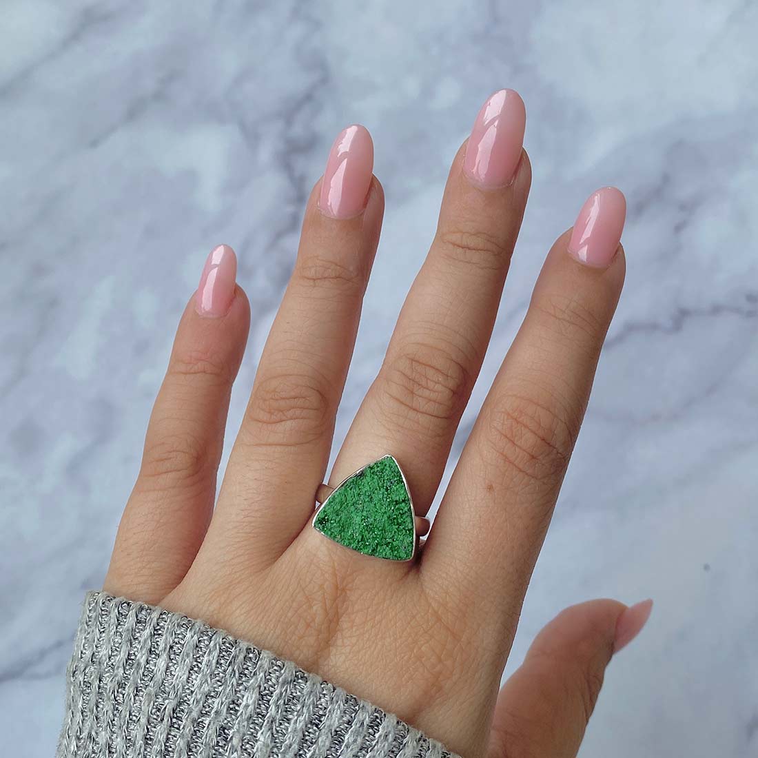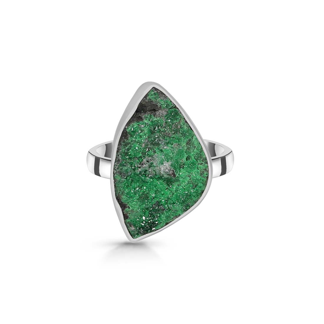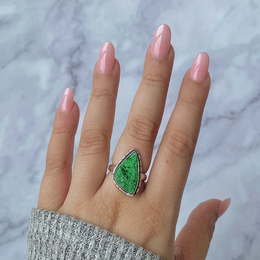Before leaving for an important event, we don't forget to check out ourselves one last time to ensure that we're dressed properly or whether our Jewelry complements our outfit. It signifies how influential Jewelry can be; after all, it's all in the details. Some say shoes or handbags help you make a noticeable arrival, but we beg to differ. Undoubtedly, Jewelry is an essential addition to everyone's wardrobe that lets us accentuate our body features, and pleasingly flaunt them, like wrist, fingers, ears, or neck. If you're also a gem enthusiast, we would love to introduce you a charismatic gemstone, Uvarovite, that can effortlessly create a sumptuous and unique look to reflect the style. Its brilliant emerald green color theme infused within a granulated and Druzy surface makes the exceptional statement Uvarovite rings you can ever desire.