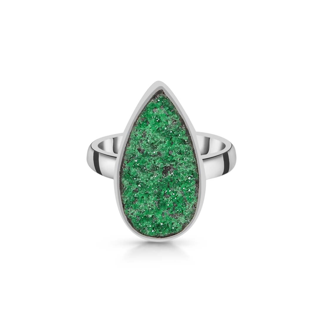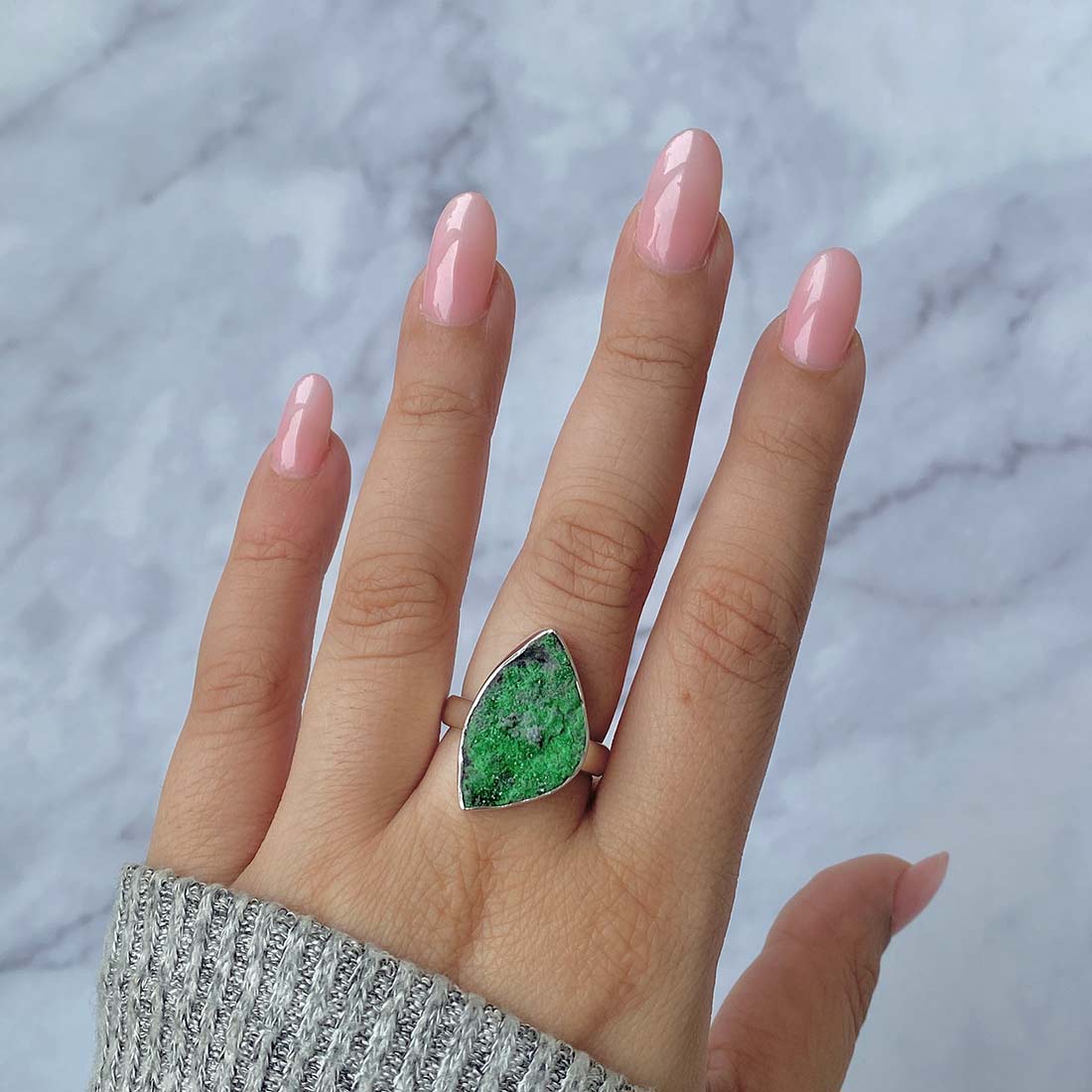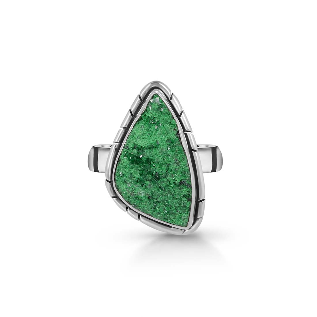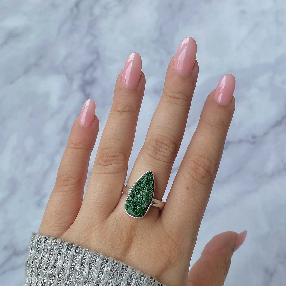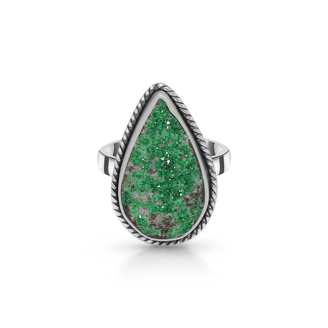 Before leaving for an important event, we don't forget to check out ourselves one last time to ensure that we're dressed properly or whether our Jewelry complements our outfit. It signifies how influential Jewelry can be; after all, it's all in the details. Some say shoes or handbags help you make a noticeable arrival, but we beg to differ. Undoubtedly, Jewelry is an essential addition to everyone's wardrobe that lets us accentuate our body features, and pleasingly flaunt them, like wrist, fingers, ears, or neck. If you're also a gem enthusiast, we would love to introduce you a charismatic gemstone, Uvarovite, that can effortlessly create a sumptuous and unique look to reflect the style. Its brilliant emerald green color theme infused within a granulated and Druzy surface makes the exceptional statement Uvarovite rings you can ever desire.