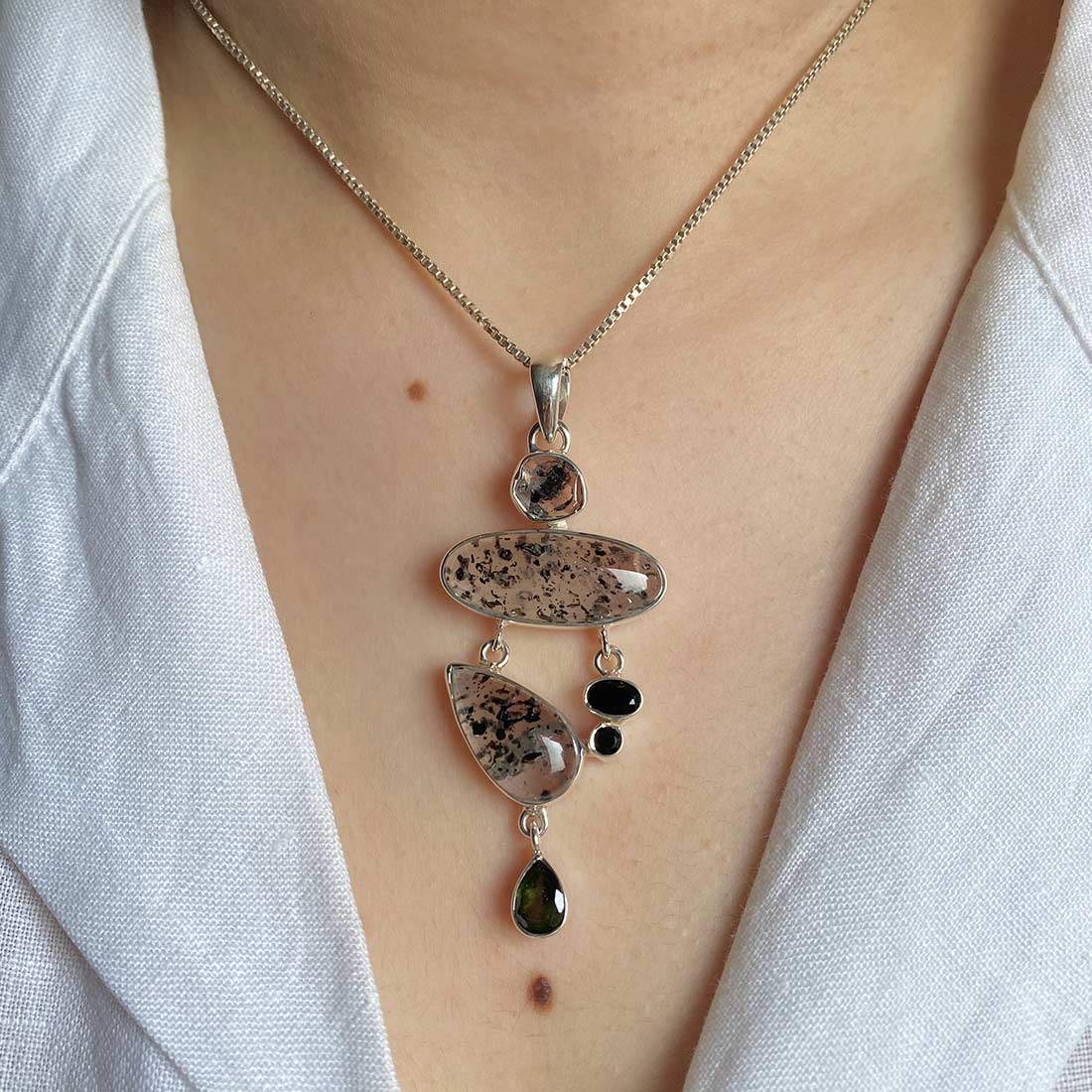No matter what color clothing you are wearing, Super Seven jewelry complements any outfit perfectly. When paired with 925 sterling silver, it displays charisma and goes well with every outfit or skin tone. If you like a more traditional look, pair a statement Super Seven pendant with a white shirt, black slacks, and pumps. This ensemble is ideal for a formal event or business meeting.