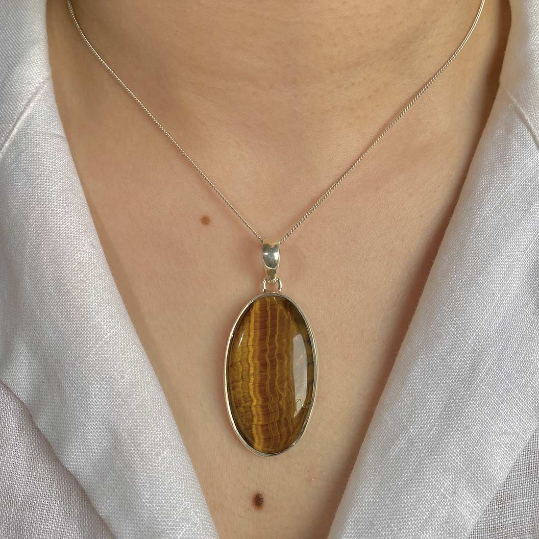 Tiger Eye goes well with whatever outfit you choose, including bohemian, minimalist, vintage, formal, casual, streetwear, trendy, preppy, and artistic pieces. Wearing a statement Tiger Eye pendant with boho attire looks fantastic. For a bright, bohemian appearance, pair it with a flowing maxi dress, layered necklaces, and a floppy hat. For a night out, use your statement Tiger Eye earrings with a flowing gown or a stunning black dress.