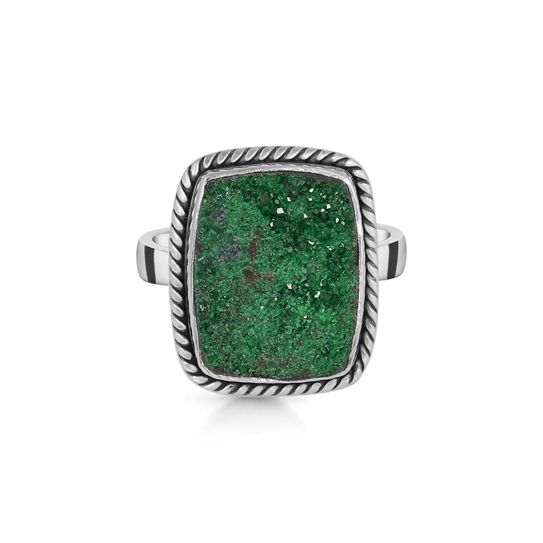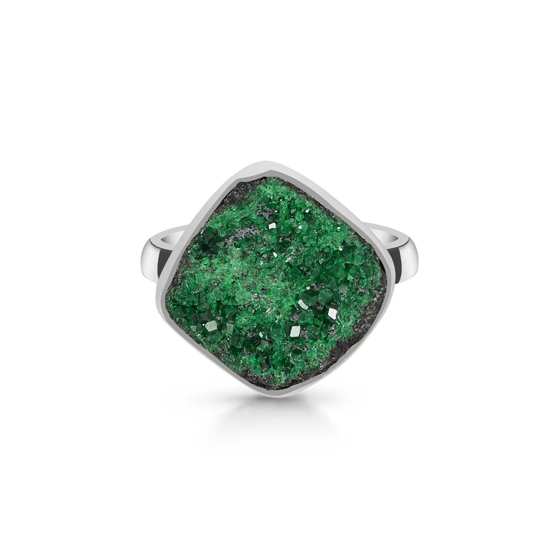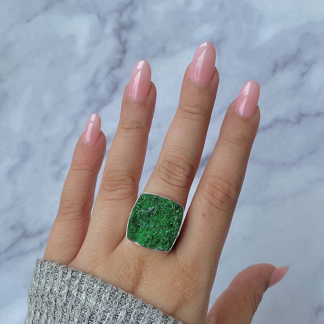 Although uvarovite does occur in extremely small crystals, which is rare, these crystals are not big enough for jewelry purposes. This is why the druzy form of uvarovite is used in making jewelry. In crystal form, uvarovite ranges from transparent to translucent, however, the druzy form which is used in making uvarovite jewelry is opaque.